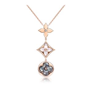 Colour Blossom lariat necklace, pink gold, white mother-of pearl, grey mother-of-pearl and diamond