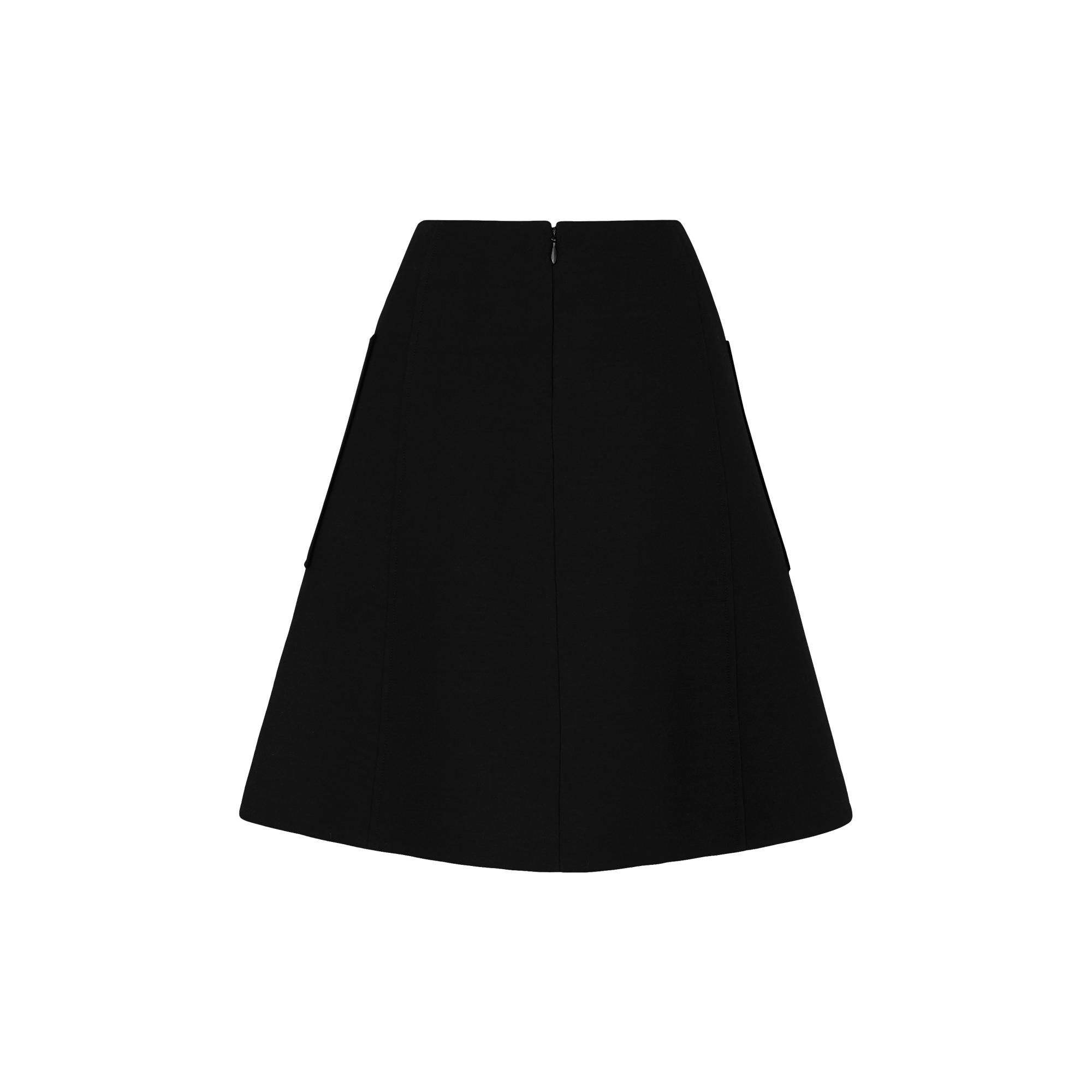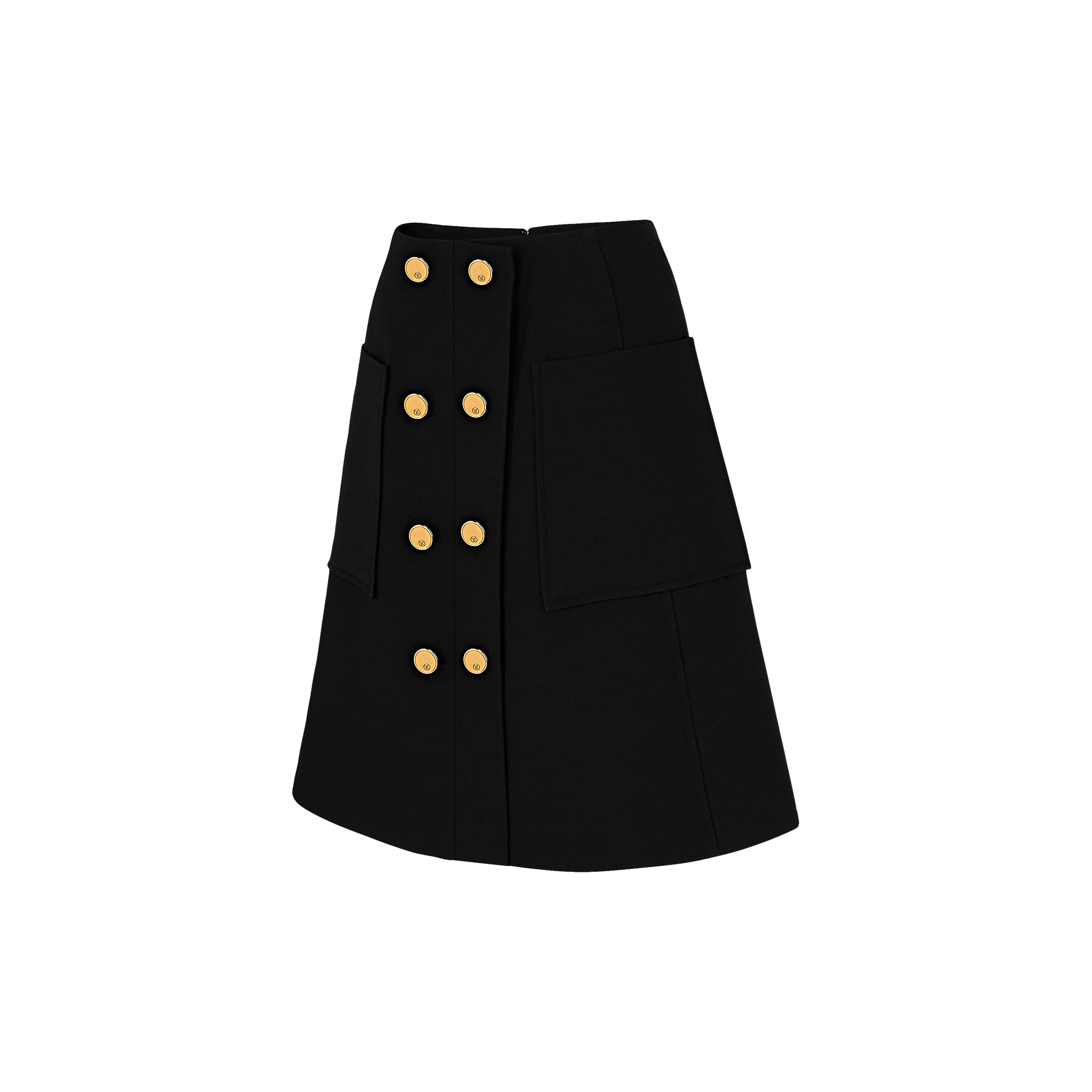 This knee-length A-line skirt in sophisticated wool silk cady features two large front pockets and an invisible zip at the back. The front is adorned with a double row of gold LV Monogram buttons.