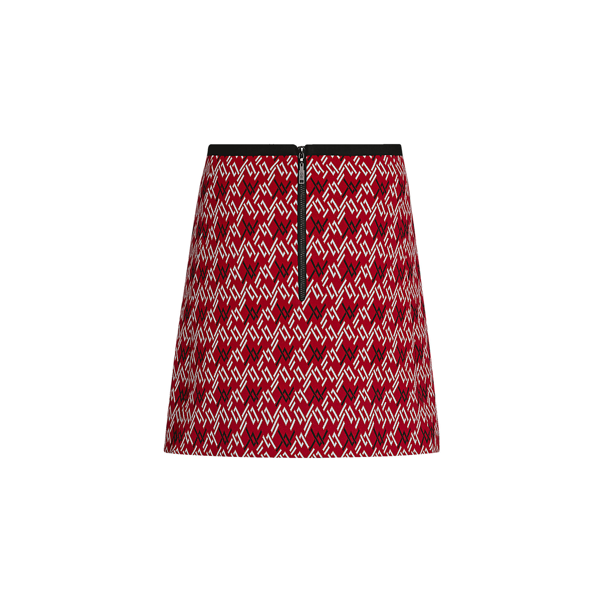 This mini skirt references the season’s 60s theme with its iconic A-line cut. The graphic jacquard knit incorporates a subtle LV motif, while a contrasting black band at the waist adds a distinctive twist.