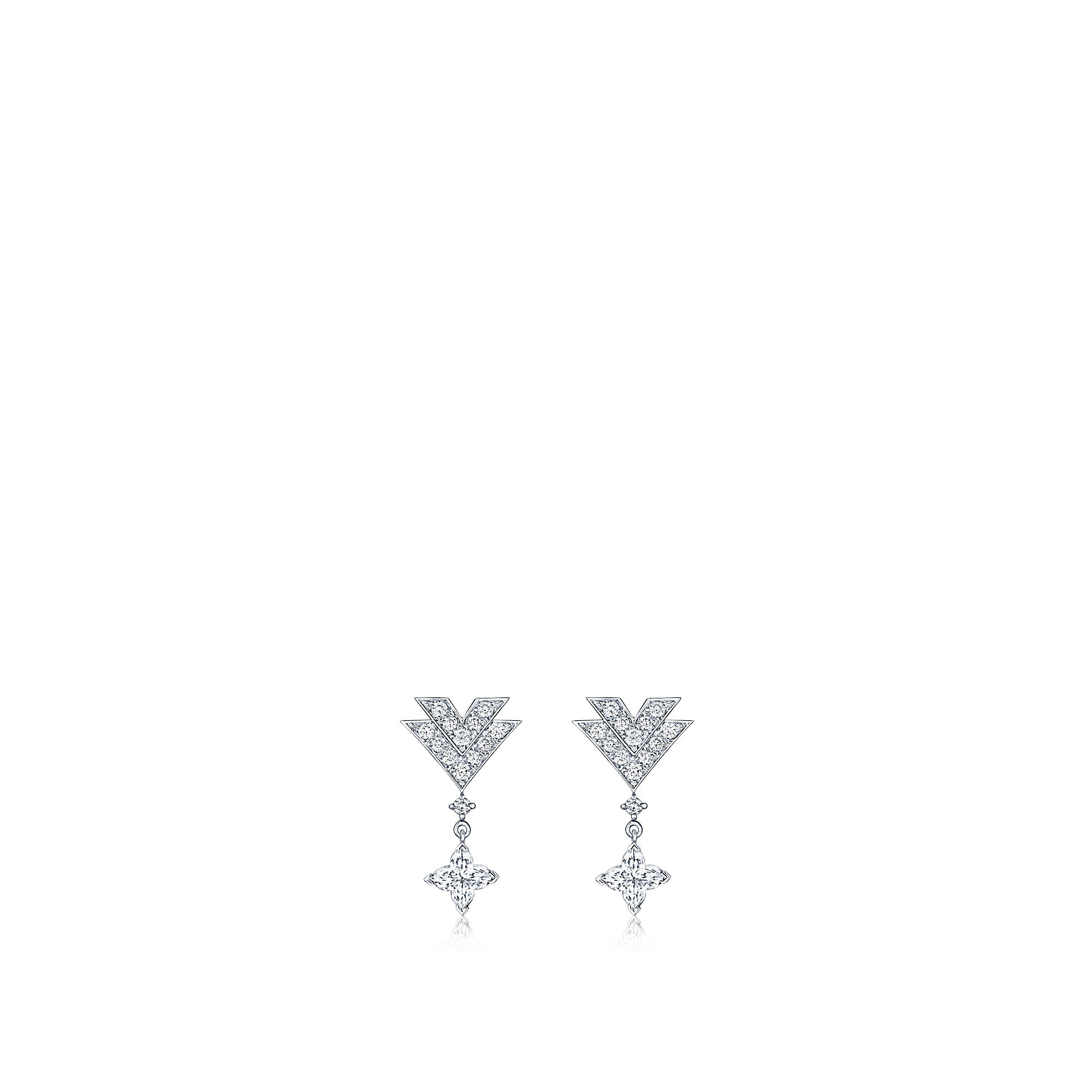 Elegant and graphic, these earrings combine two emblematic signatures of the Maison: the V logo created by Gaston-Louis Vuitton and the Monogram Flowers with its distinctive Louis Vuitton cut diamonds.