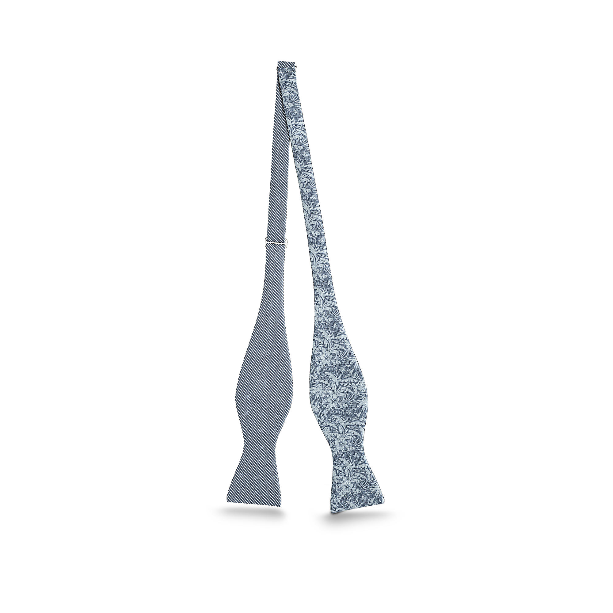 Inspired by the season’s Hawaiian fashion theme, this playful piece combines a floral pattern with stripes to create a mix-and-match effect. Available in a refined denimy-grey shade, it is ideal for weddings and other special events.