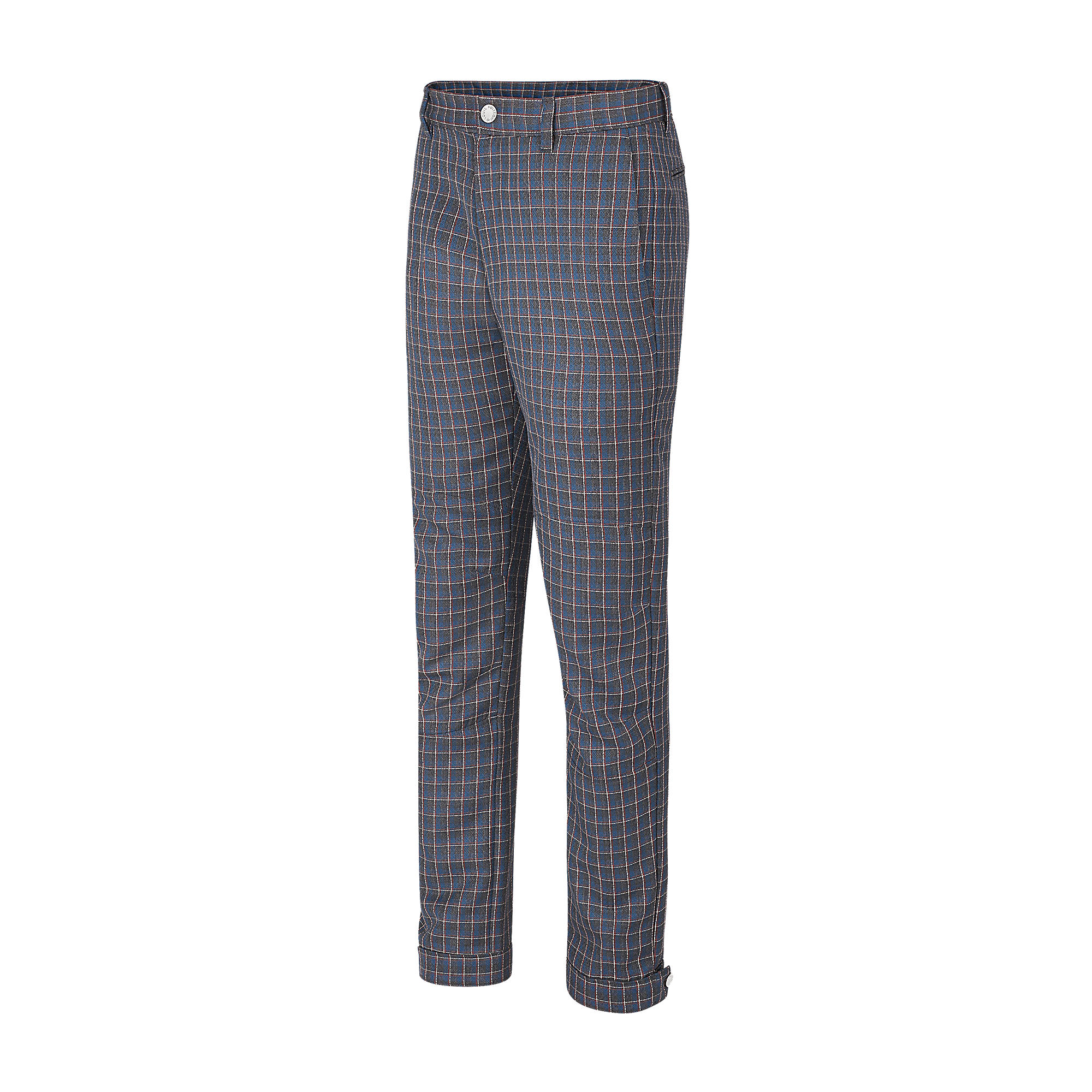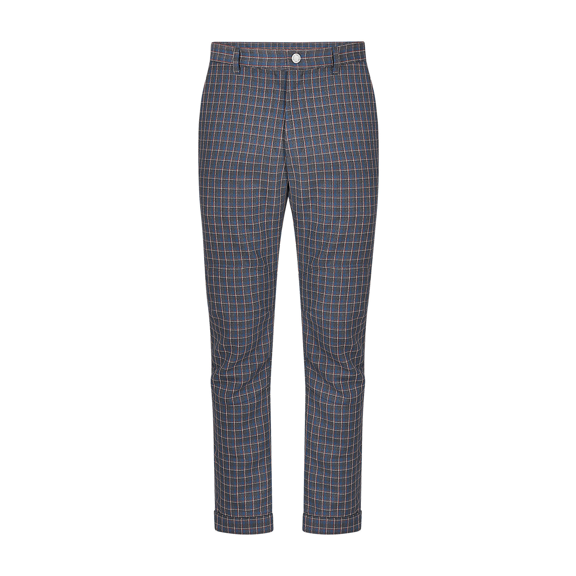 Cut from a wool and mohair blend with a woven micro tartan motif, these anatomical trousers feature cut details on the knees and an embroidered LV signature at the back. The bottom hems can be adjusted with press studs.
