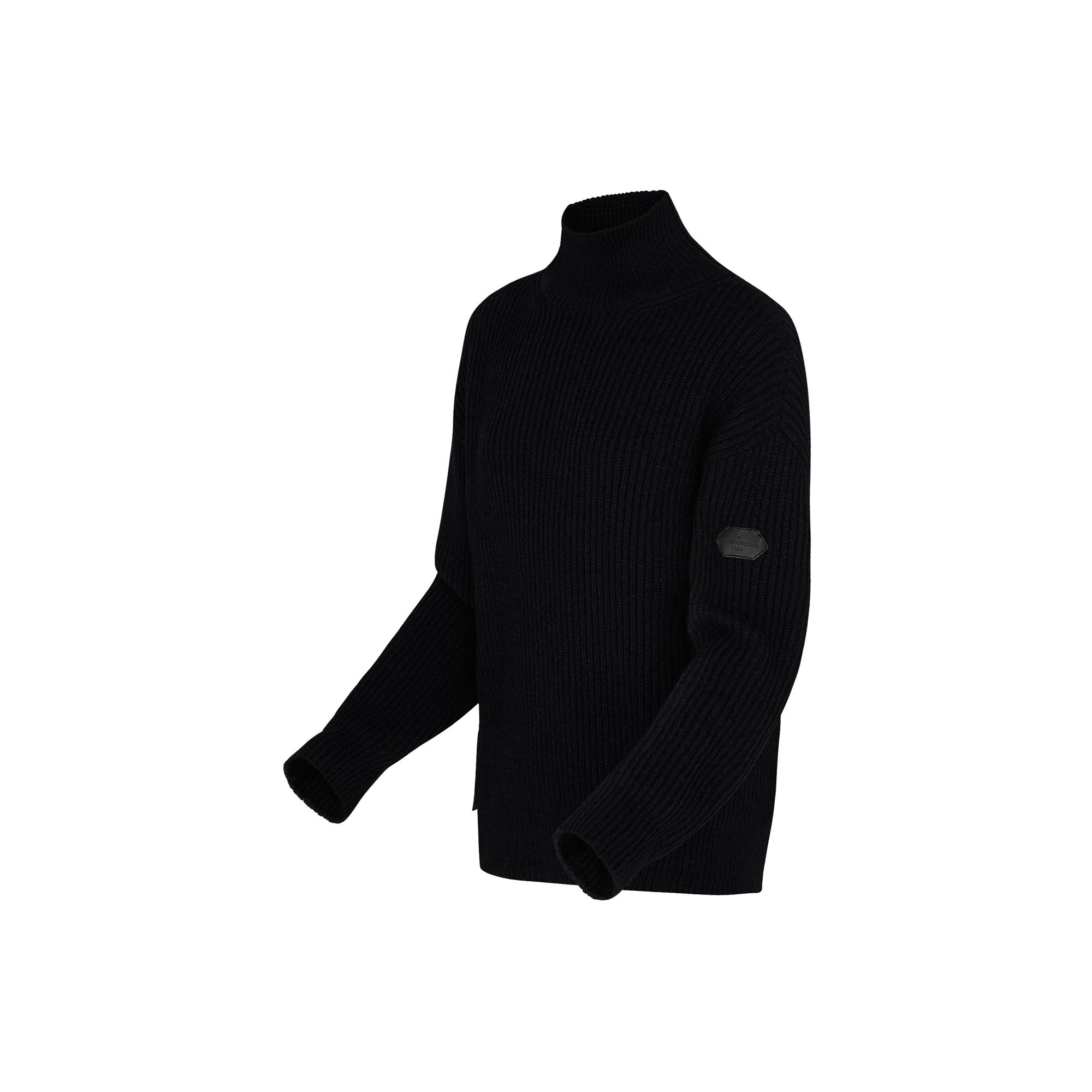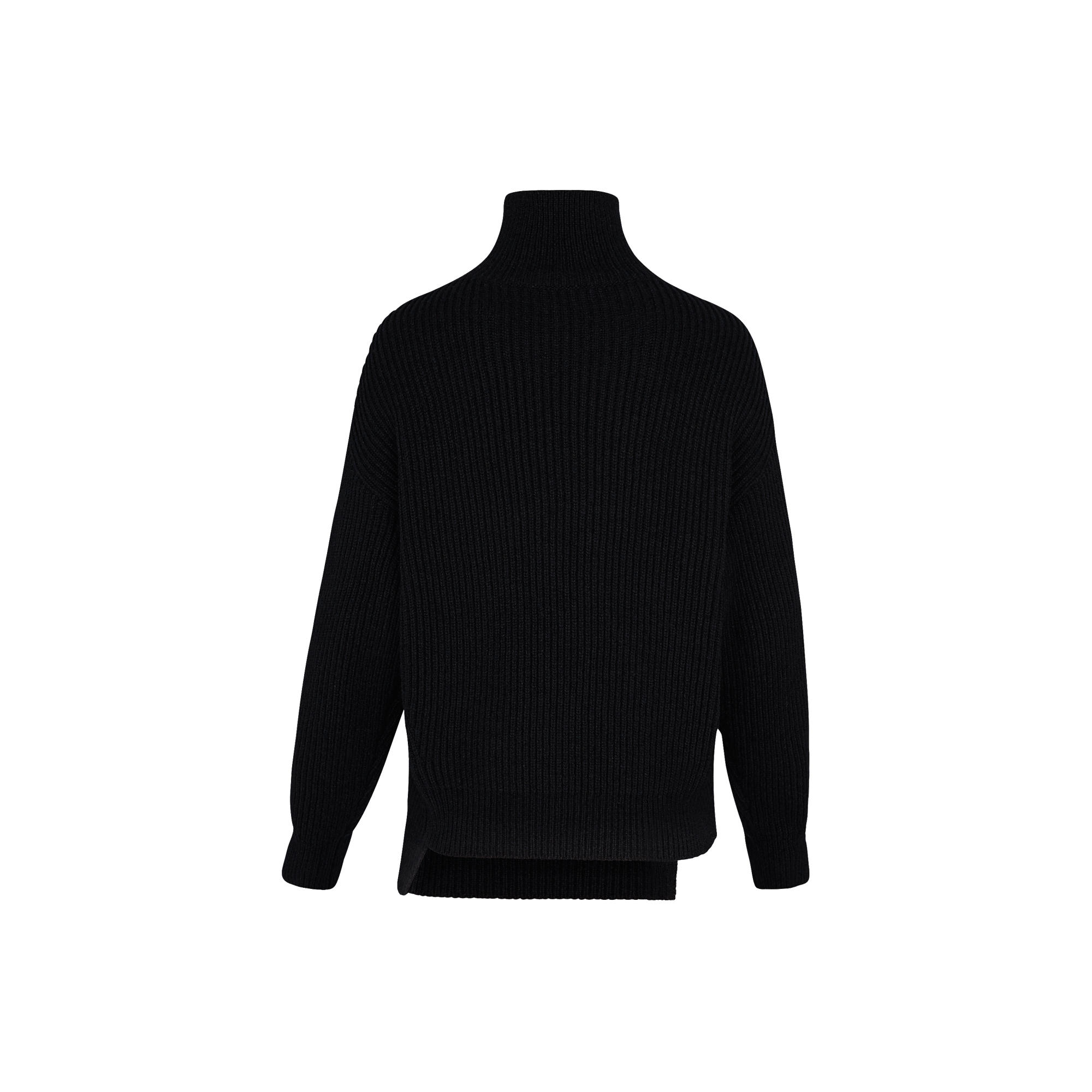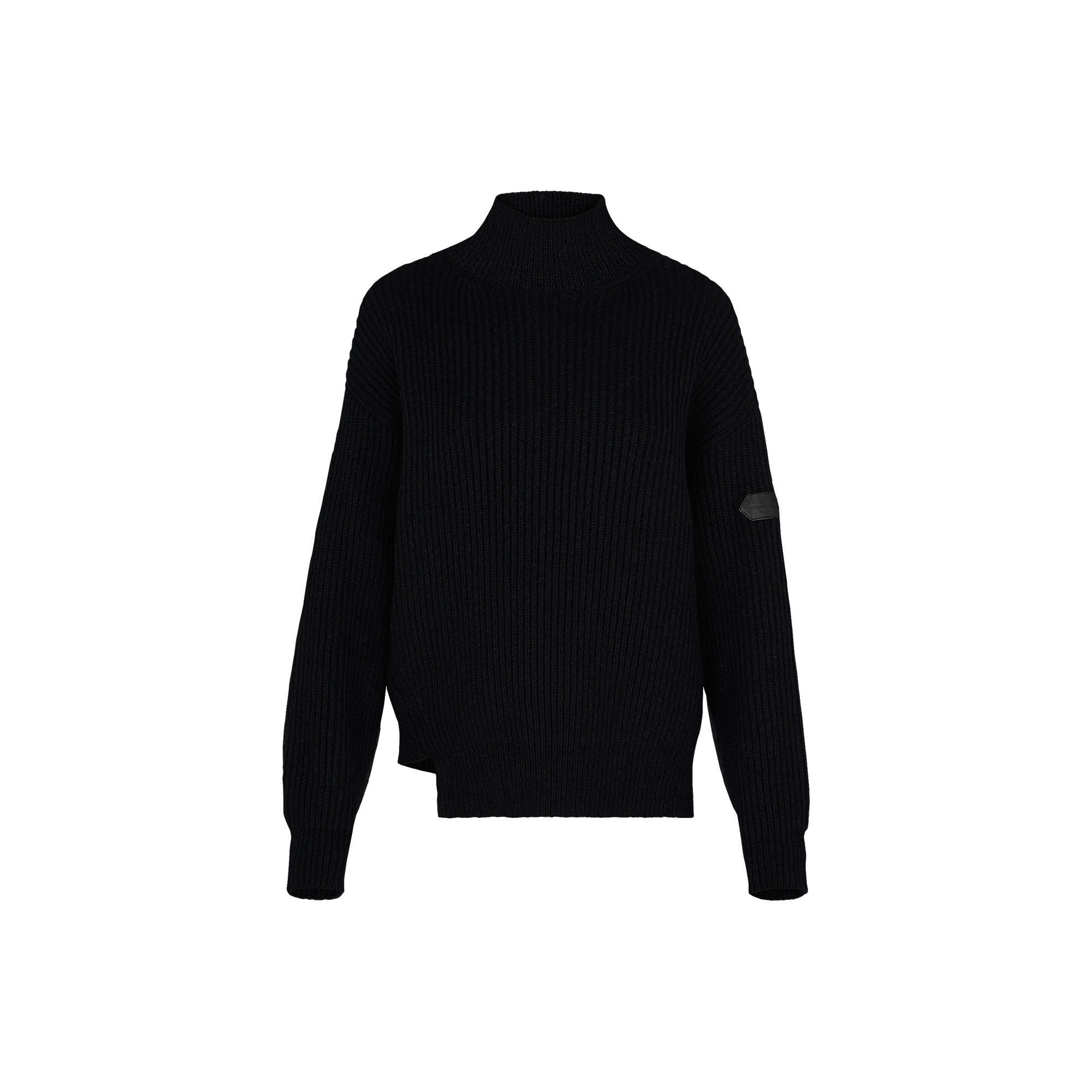This woolen sweater with a ribbed finish has a turtleneck collar and slightly asymetrical hem. A leather Louis Vuitton patch on the sleeve adds a subtle signature touch.