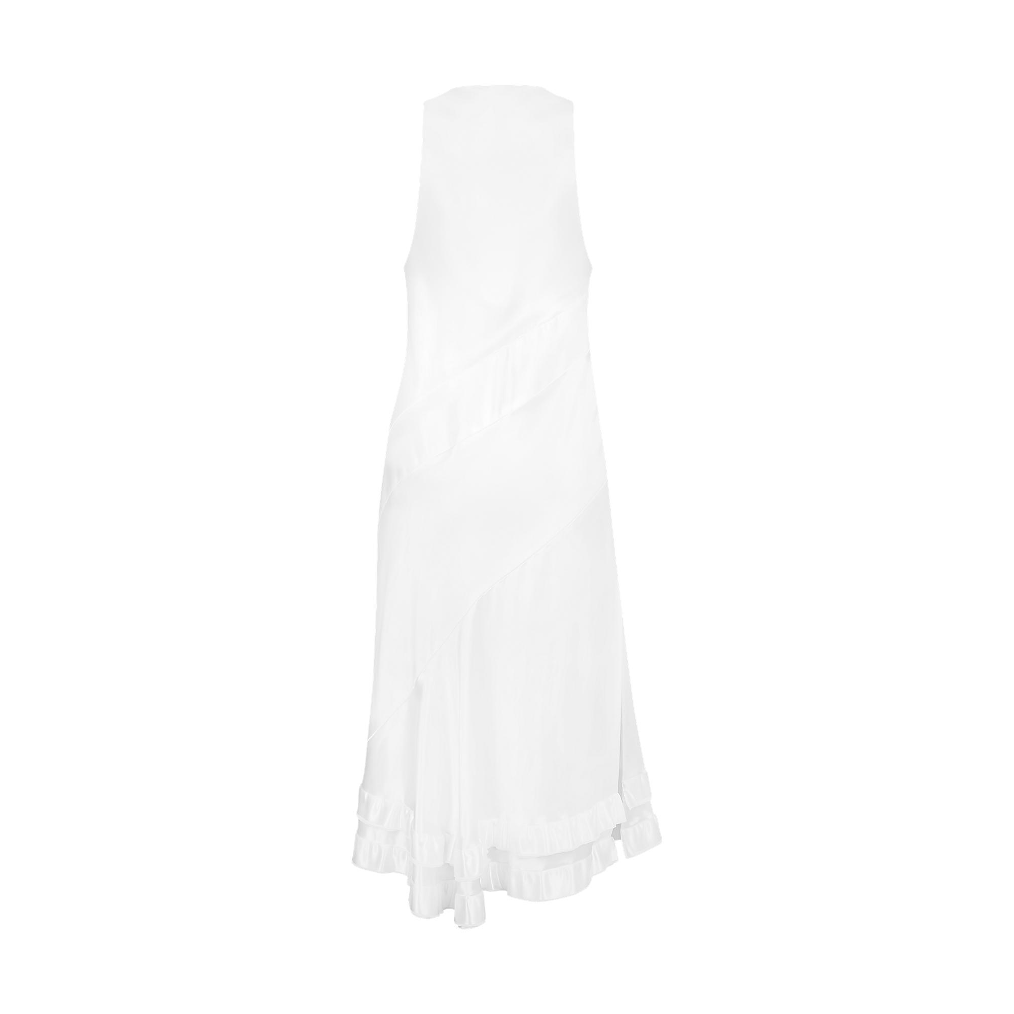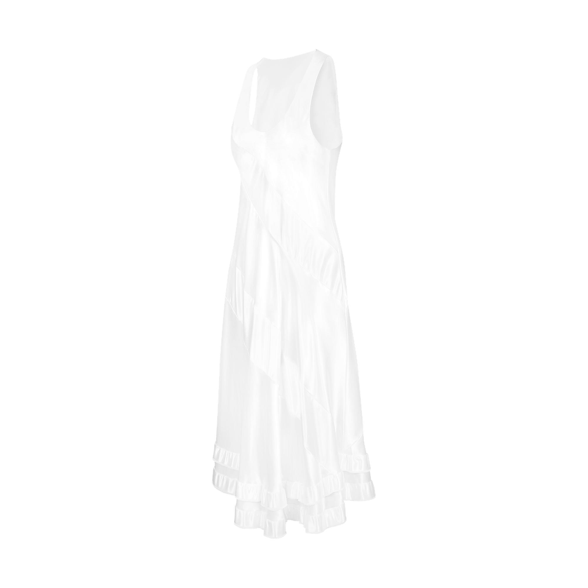 Available in a multitude of colours, this sleeveless dress is a great summer piece that can be mixed and matched and layered during the colder months. Its raw edge and ruffles are inspired by the collection’s Slavic accents and folklore theme, while the diagonal fabric inserts are a Nicolas Ghesquière signature.