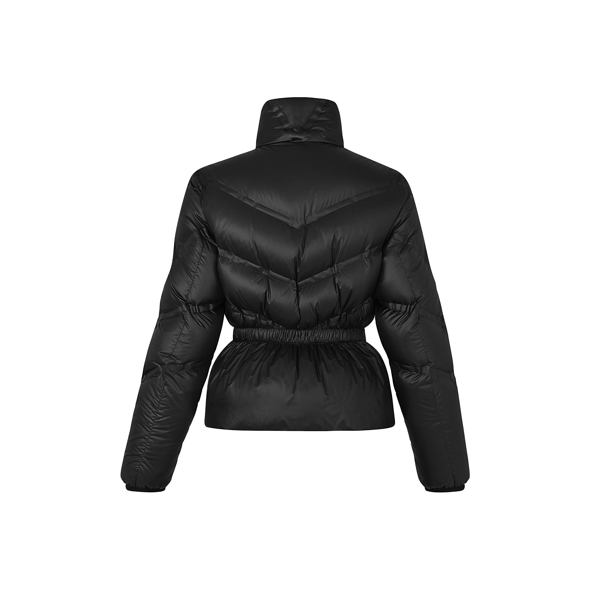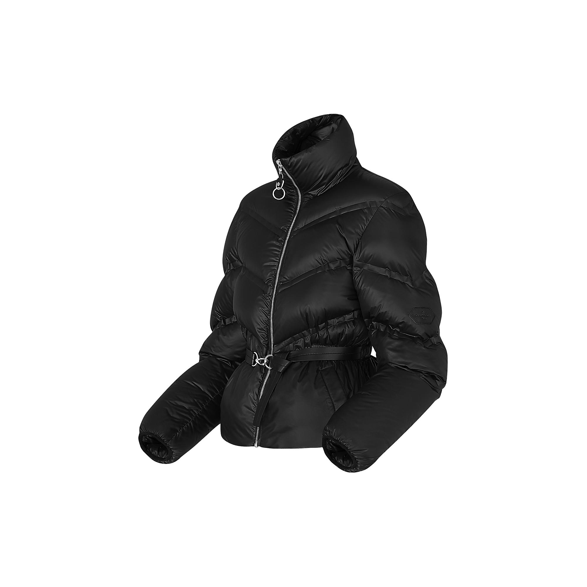 This belted down jacket features signature V-shaped stitching on the front and sleeves and a distinctive silver zip. Duck down padding makes it uniquely light and warm.The black leather belt has a snaplock fastener to accentuate the waistline.