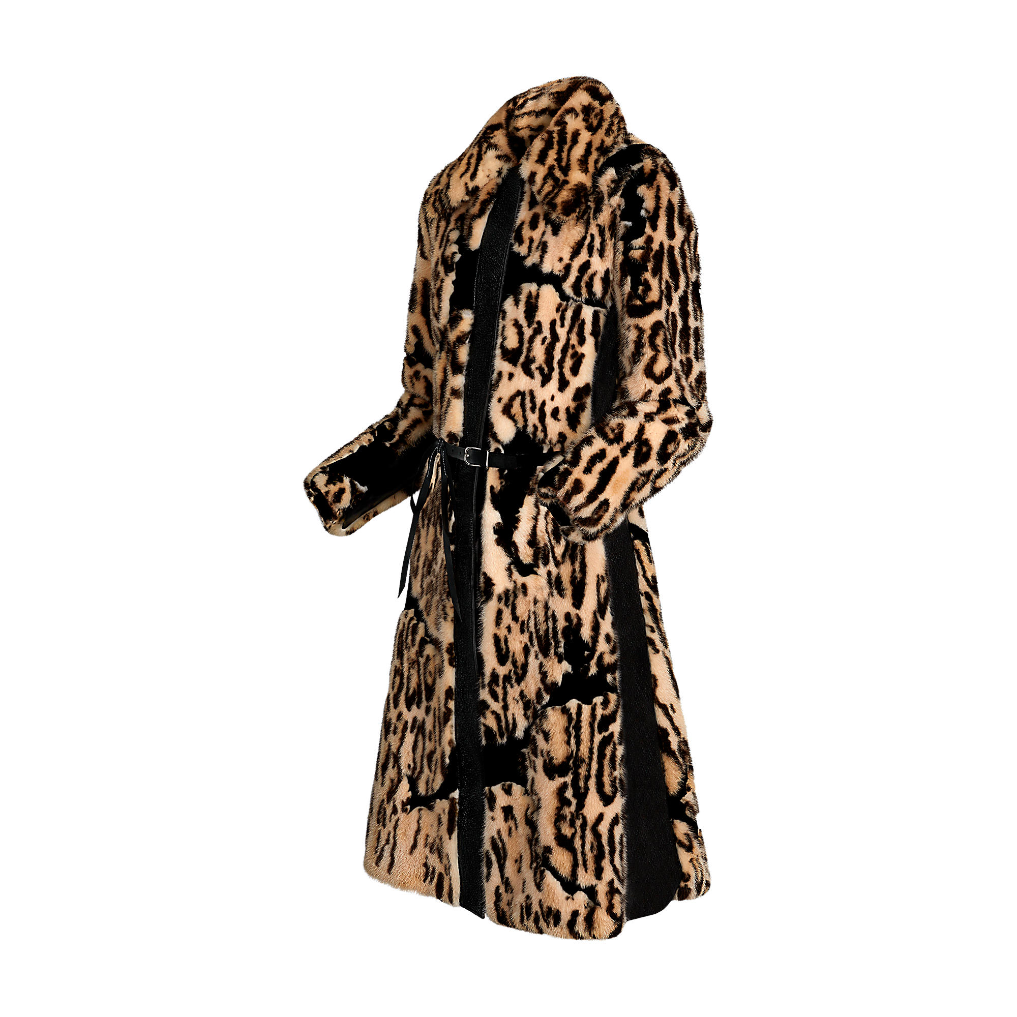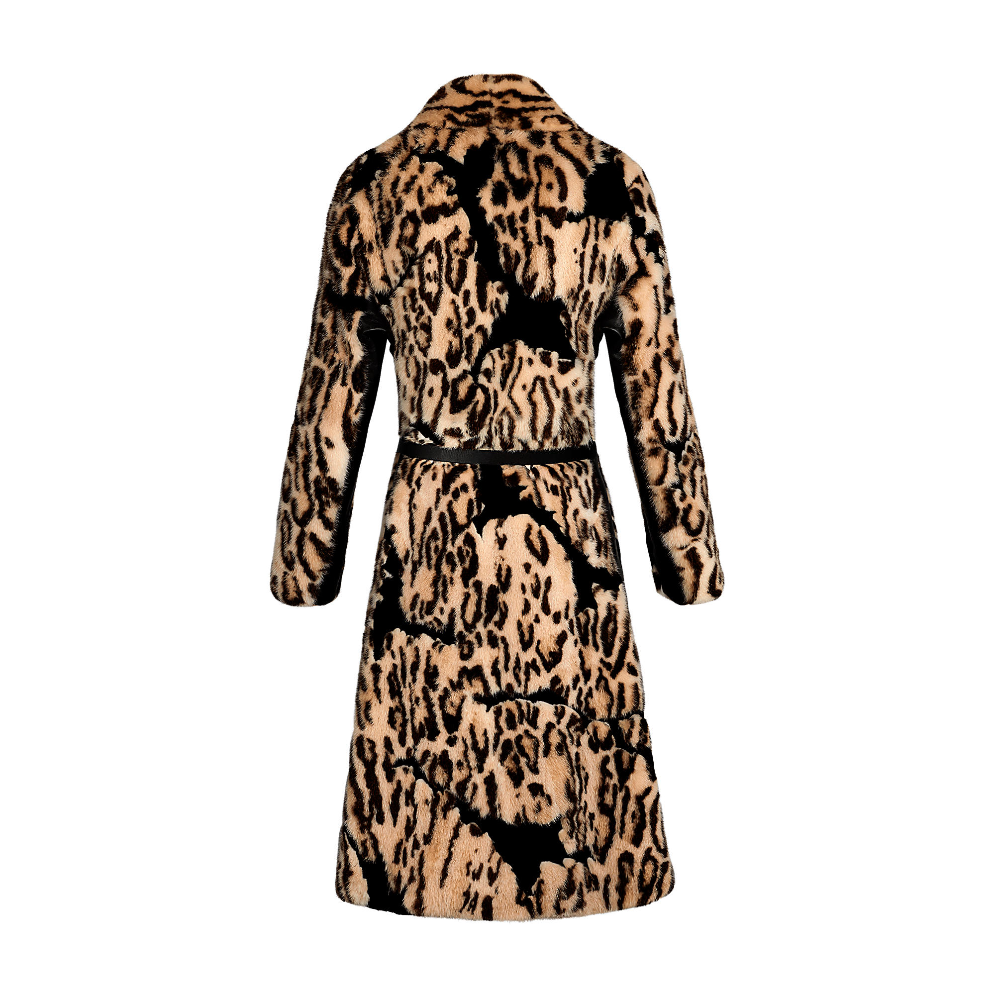One of the collection’s statement pieces, this exceptional mink fur coat plays on two of this season’s signatures: animal prints and camouflage. Leather inserts at the front and sides contrast with the coat’s classic shape for a modern and sophisticated look.