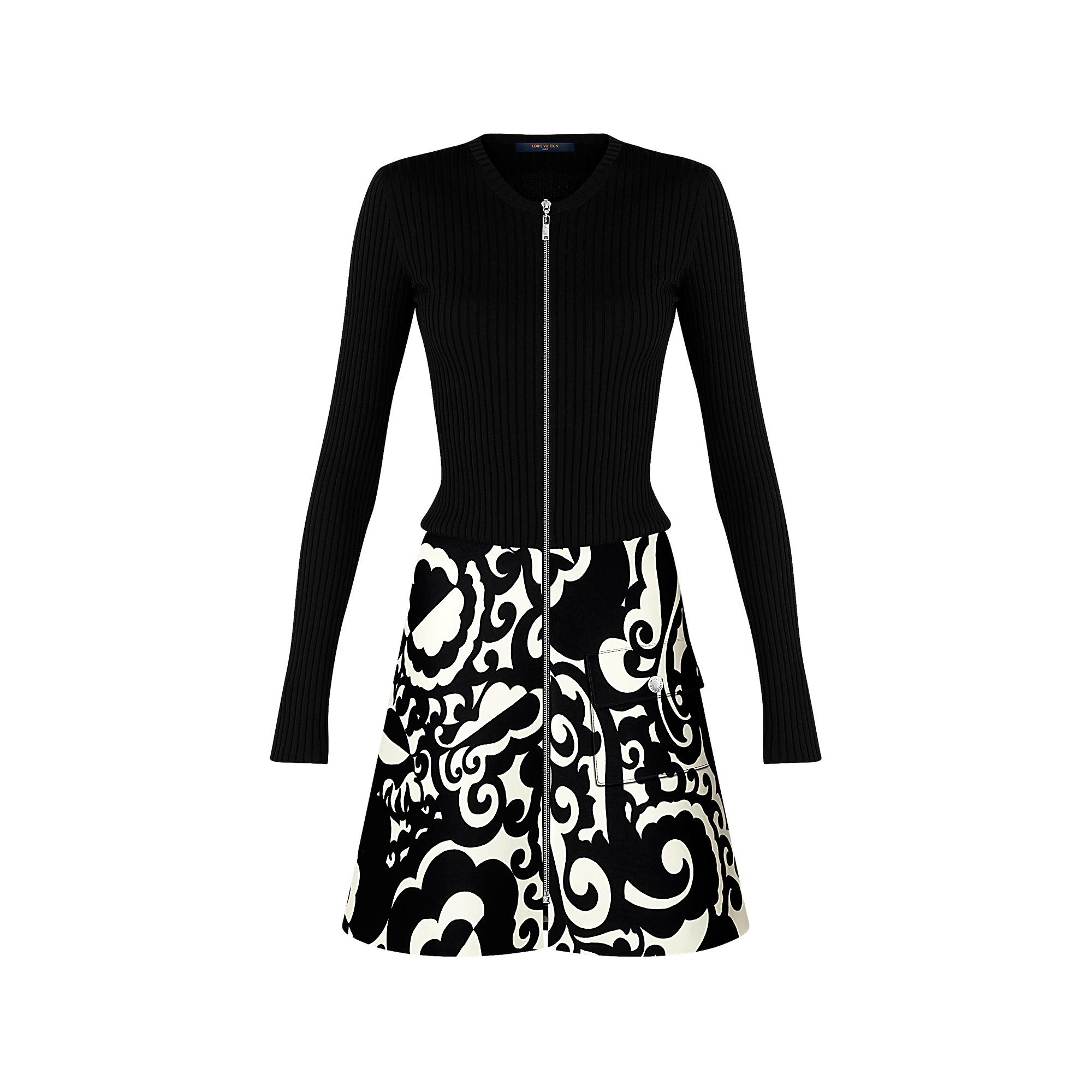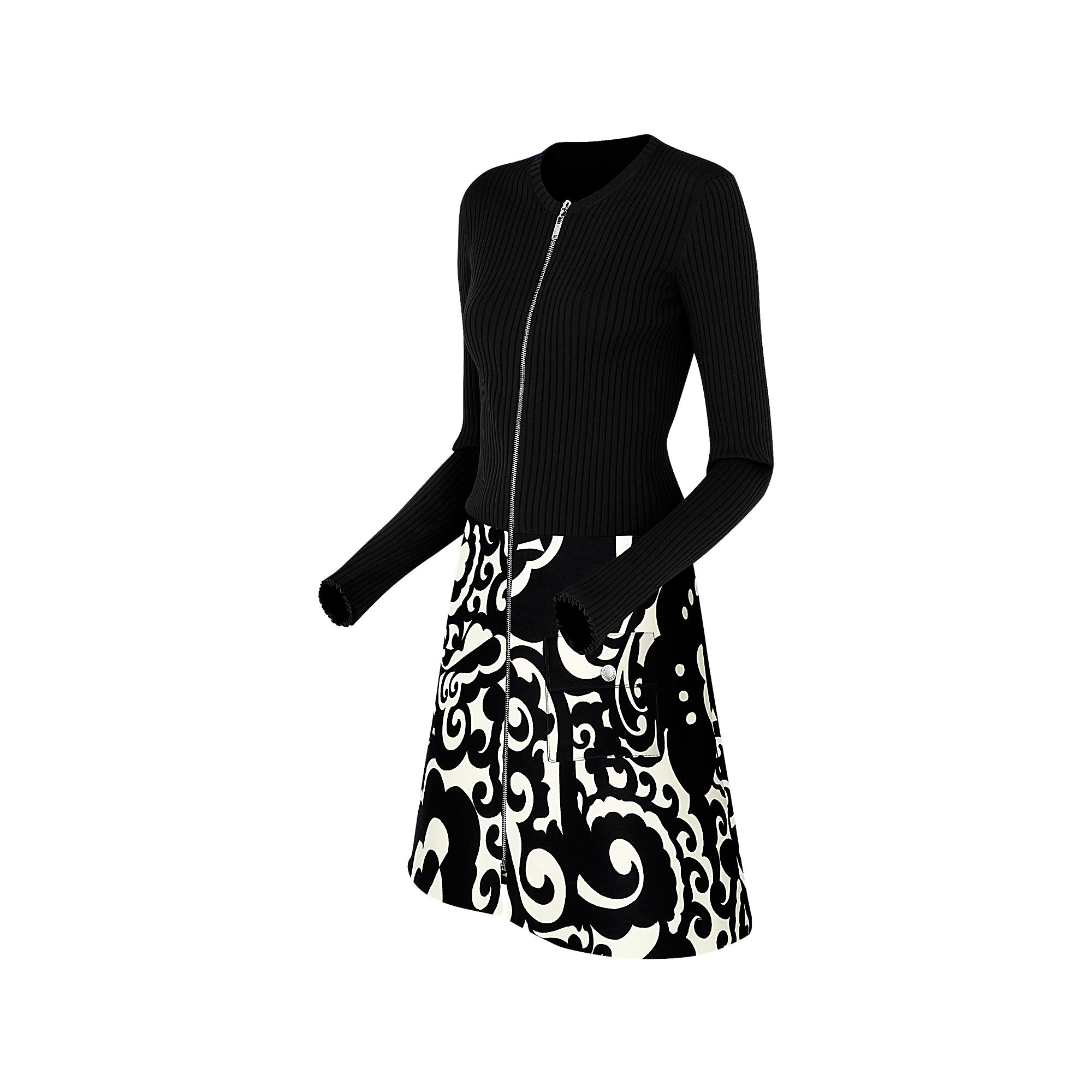 This mid-length dress features an iconic combination of a ribbed top with a skirt in wool and silk cady. The skirt is printed with the season’s signature optical flower print, inspired by 1960s and 70s fashions.