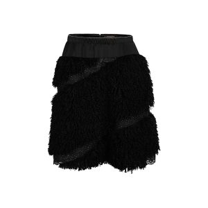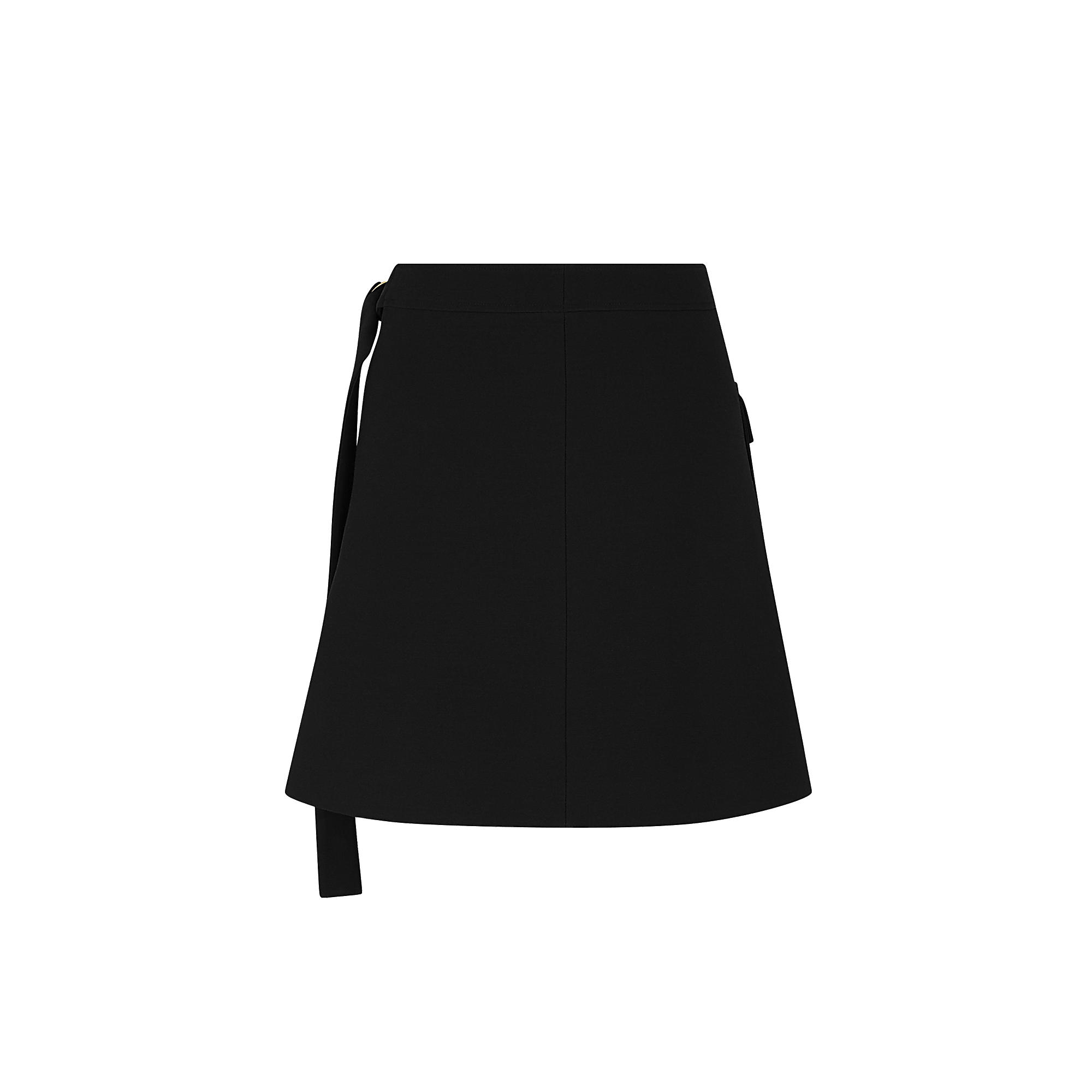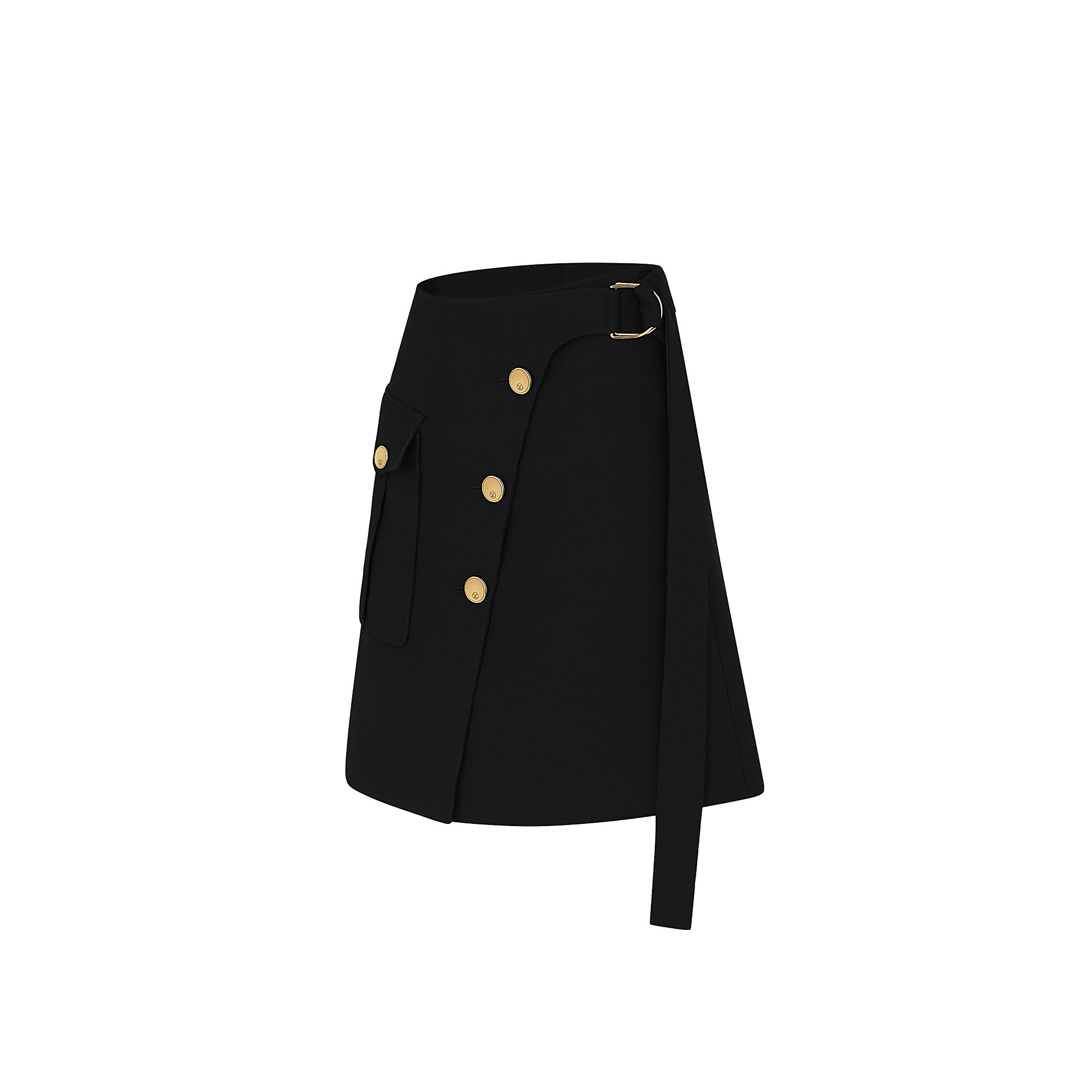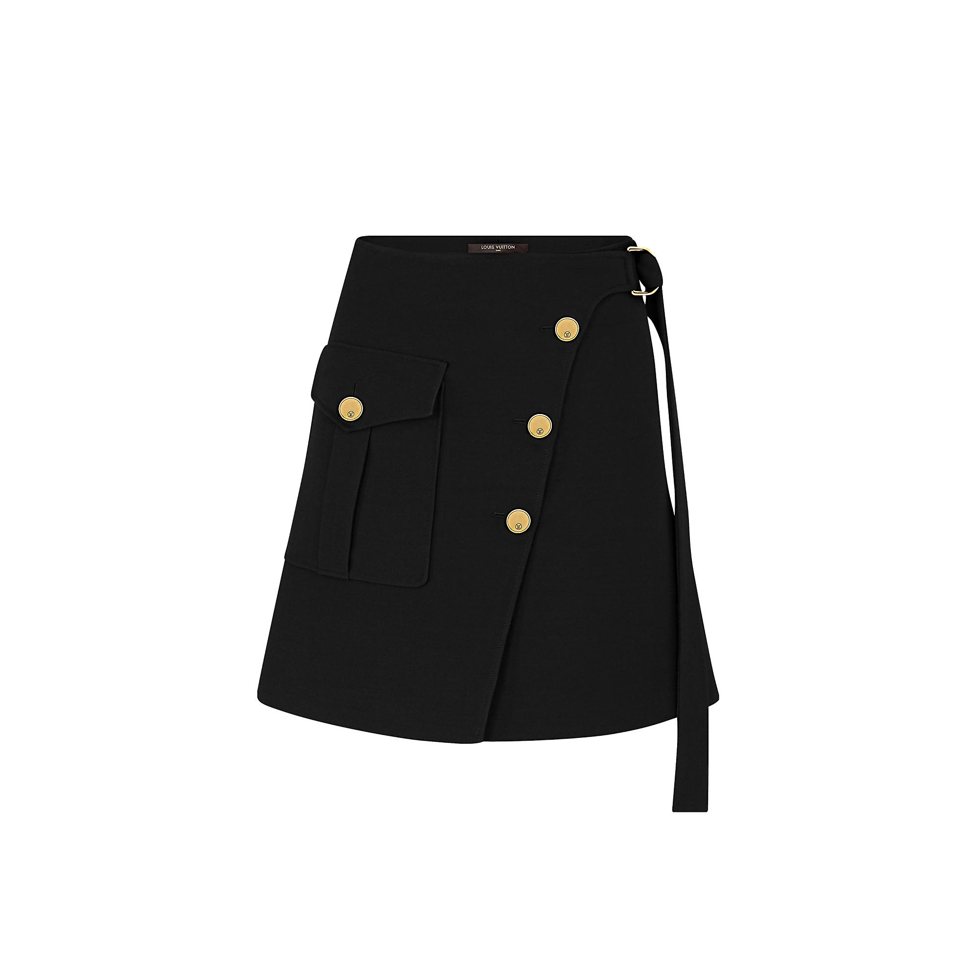 This short wrap skirt in wool silk cady features three gold LV monogram buttons on the front panel and a large buttoned pocket on the right side. The belt fastens with the season’s signature double D-ring detail.