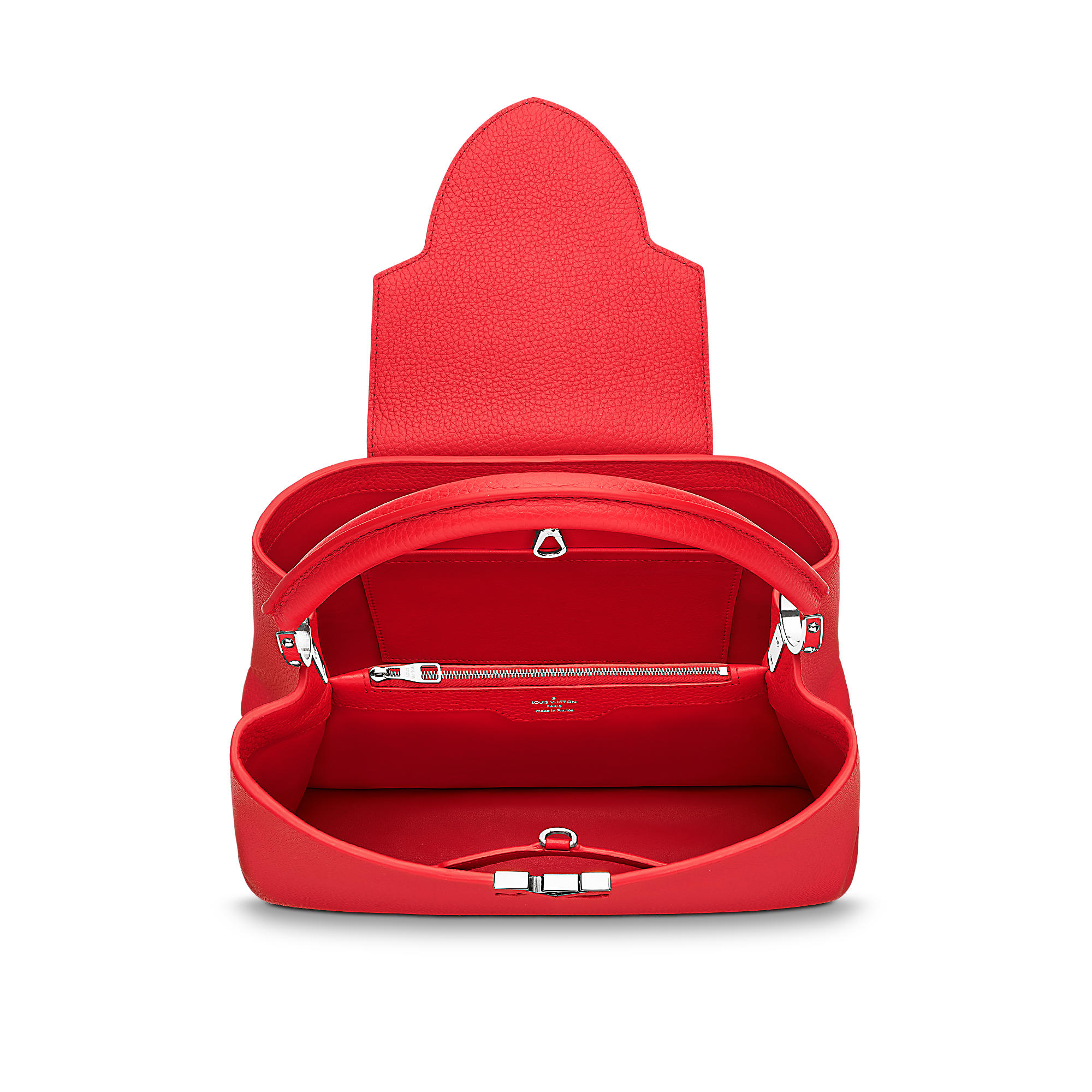 Taking its name from the Rue des Capucines in Paris, where Louis Vuitton opened his first store in 1854, the timelessly elegant Capucines bag is a testament to fine leather craftsmanship. In full-grain Taurillon leather, it combines refined details, including a semi-rigid handle secured by jewel-like rings, with a spacious and functional shape offering two inside compartments. Its distinctive flap can be worn two ways: outside to reveal the outline of a Monogram flower, or inside to show the LV initials.