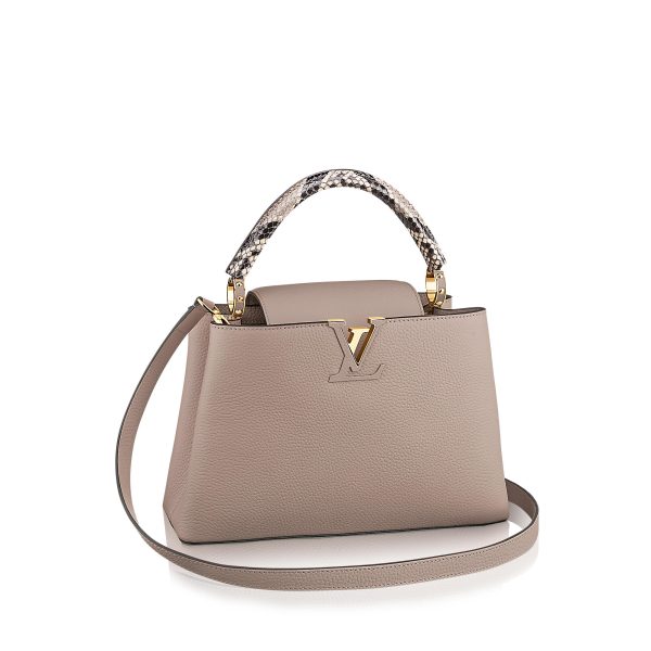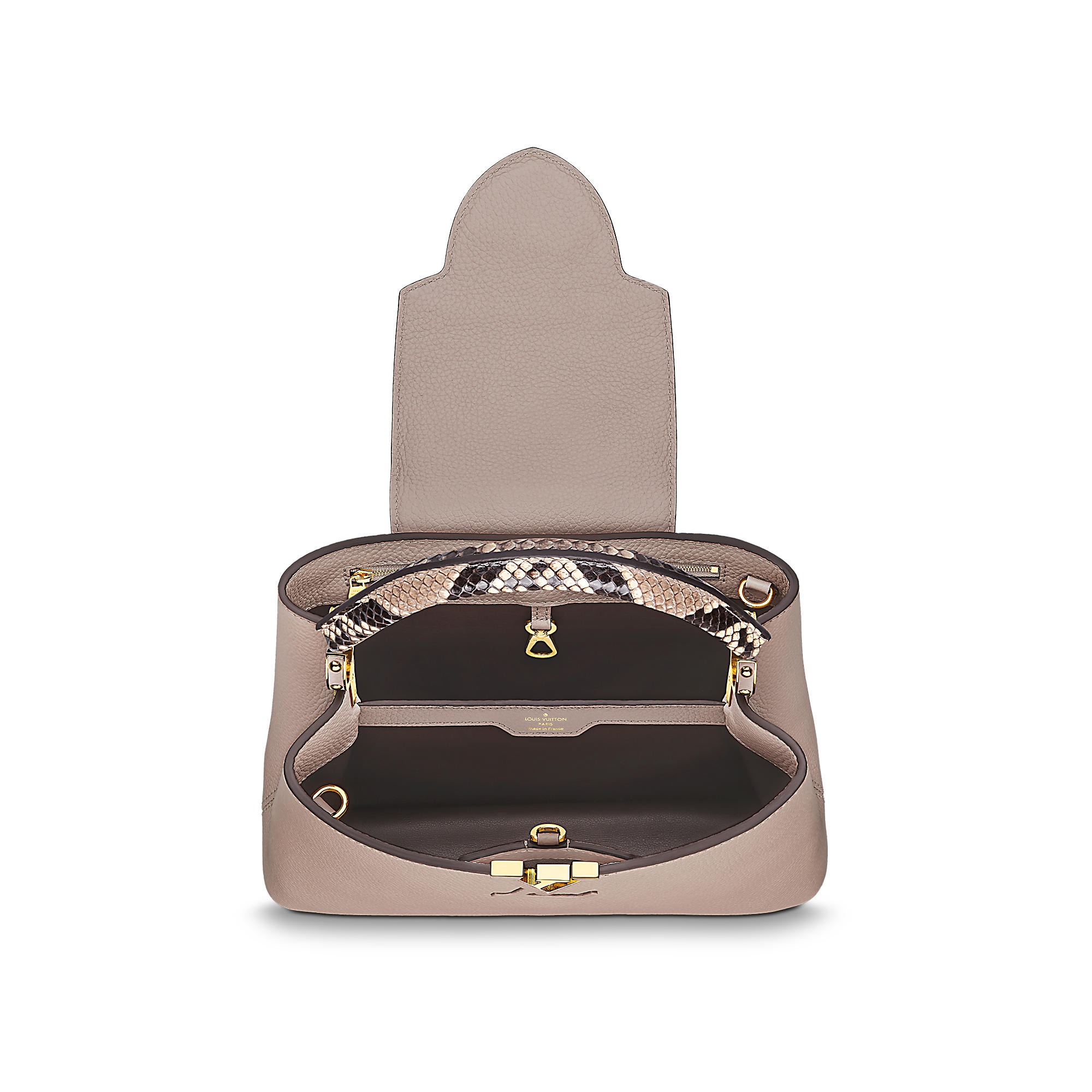 The fashionable mini size of Capucines PM lends an intense pop of contrasting colours to wardrobe styles from classic to daring. Finished with shiny colour accents, the Capucines PM comes with a removable shoulder strap for casual shoulder or cross-body wear.