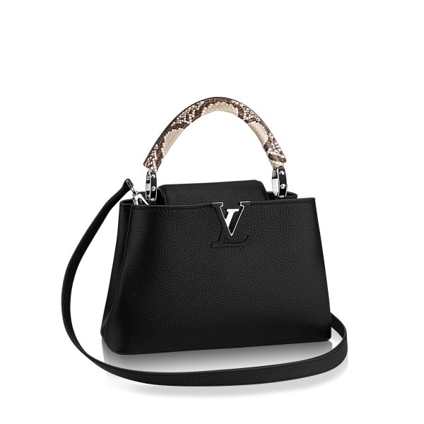 The fashionable mini size of Capucines PM lends an intense pop of contrasting colours to wardrobe styles from classic to daring. Finished with shiny colour accents, the Capucines PM comes with a removable shoulder strap for casual shoulder or cross-body wear.