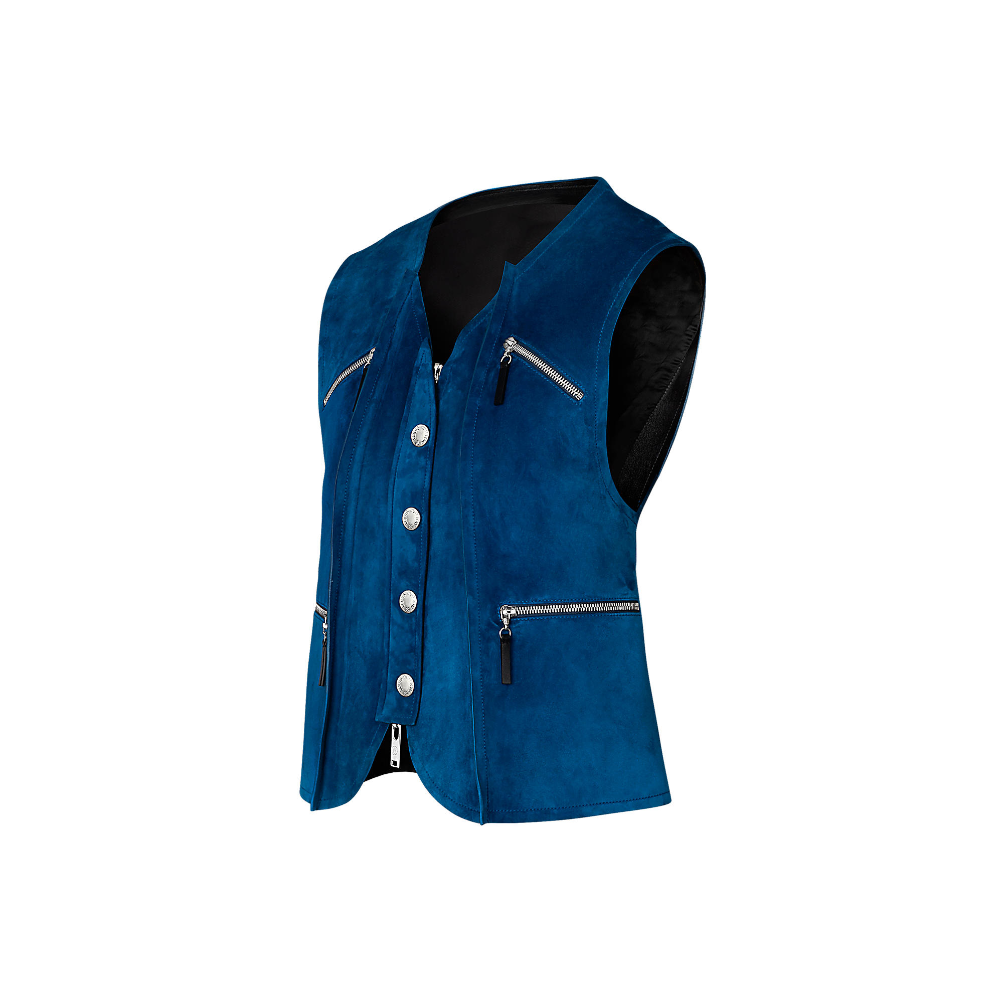 This stripped-down version of the season’s gilet in soft cashmere suede calf features four zipped pockets and the emblematic oversize zip. With Louis Vuitton snap buttons adding a subtle signature, it is an ideal layering piece to mix and match with a top, pullover, dress or jacket.