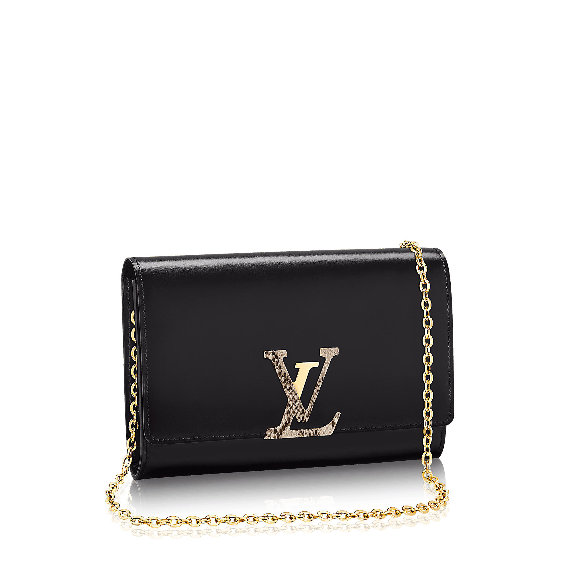 Enhance any day or evening event with the feminine Chain Louise. It combines sleek, smooth calfskin leather with a beautiful golden chain and opening clasp in precious python to make a truly elegant clutch.
