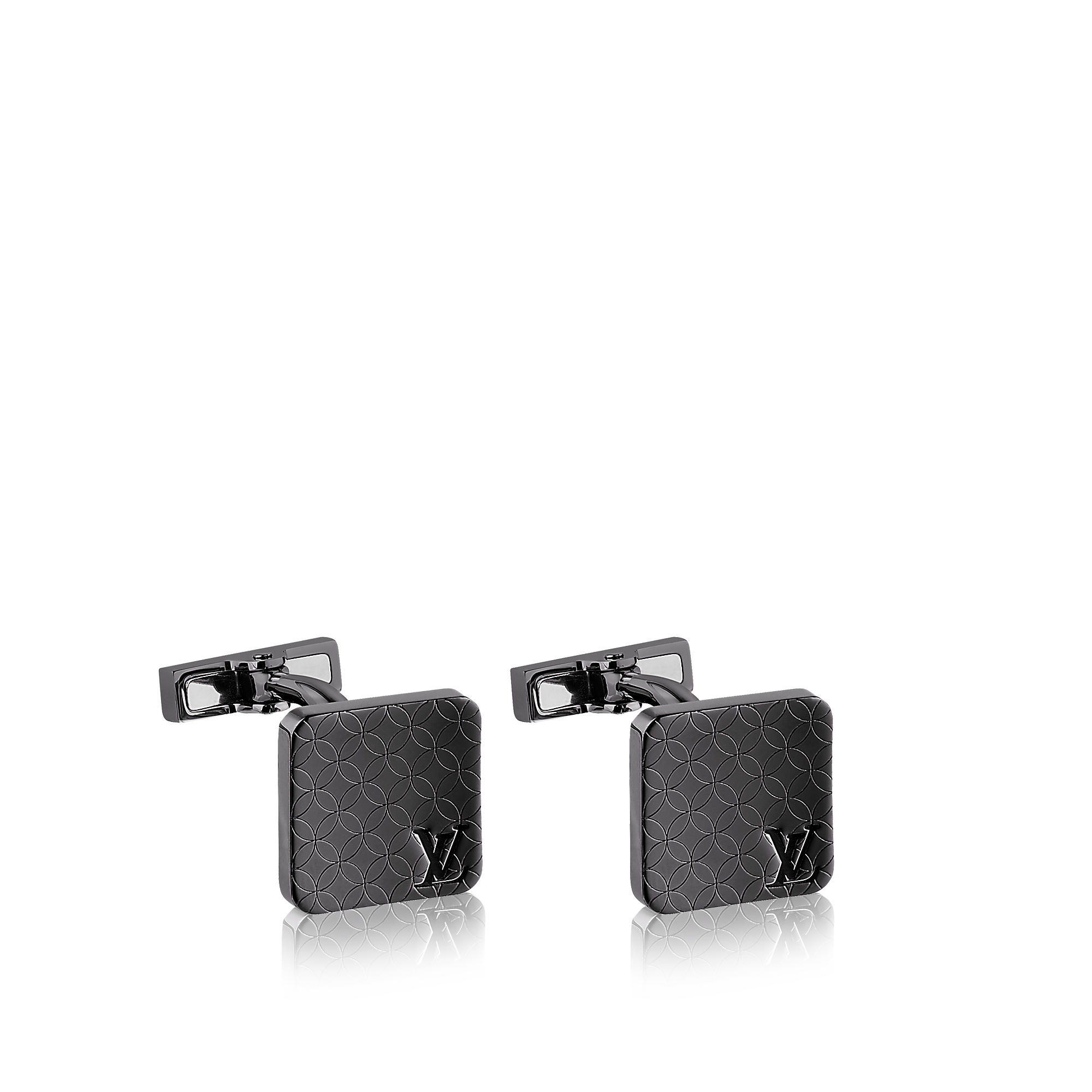 Inspired by the metal walls of Louis Vuitton’s Champs-Elysées store, this modern theme for men combines steel and black lacquer with laser-engraved Monogram flowers. These graphic cufflinks feature perforated LV logos.