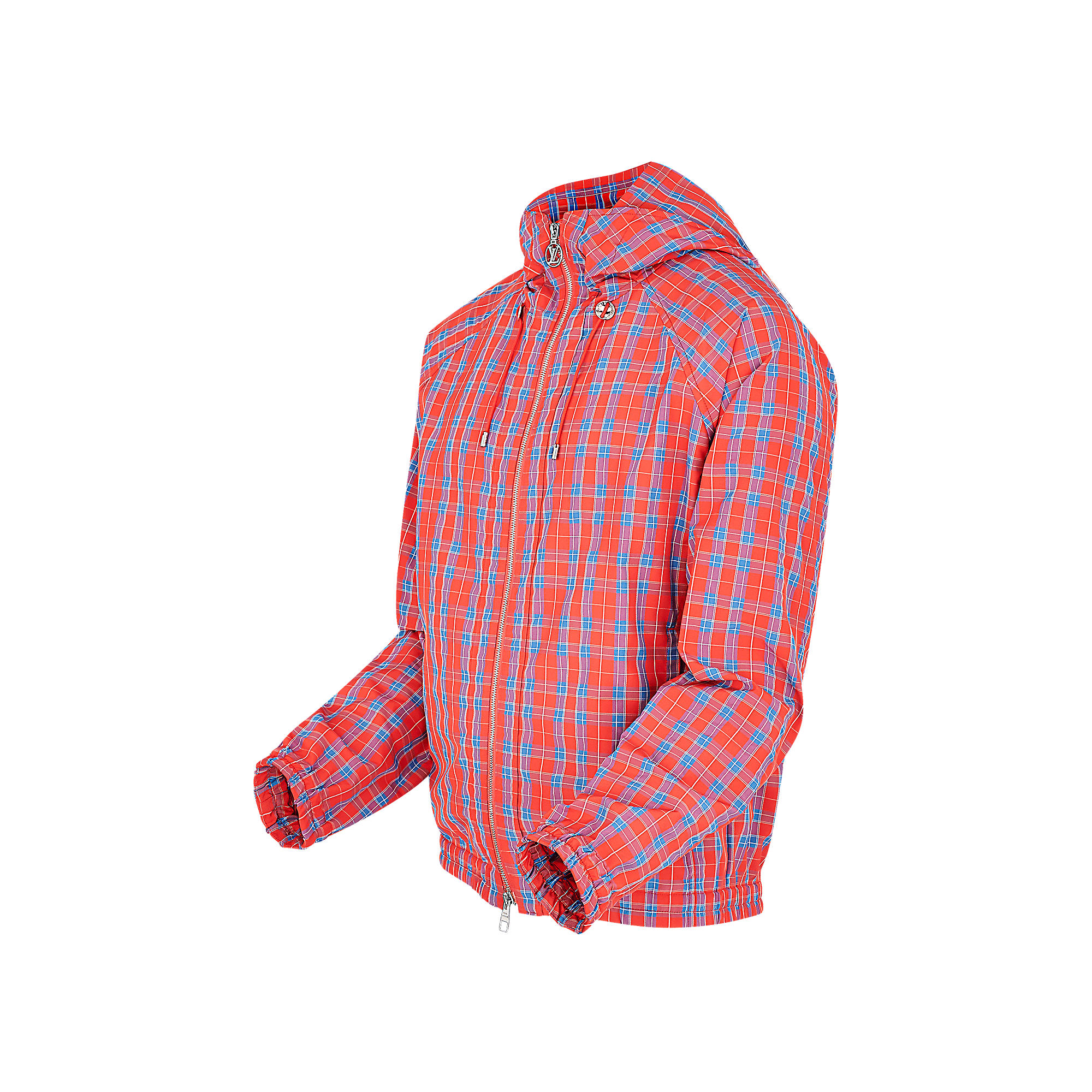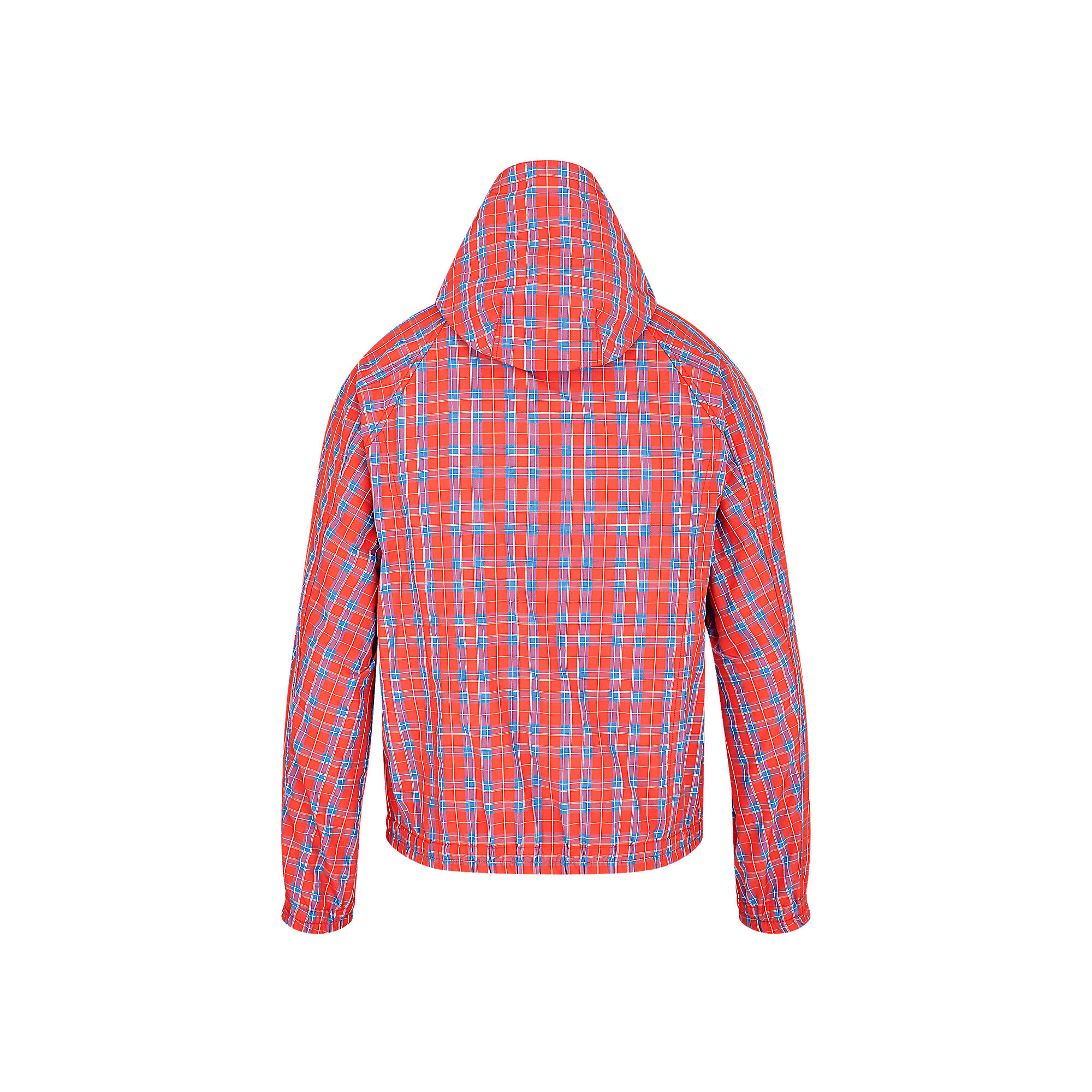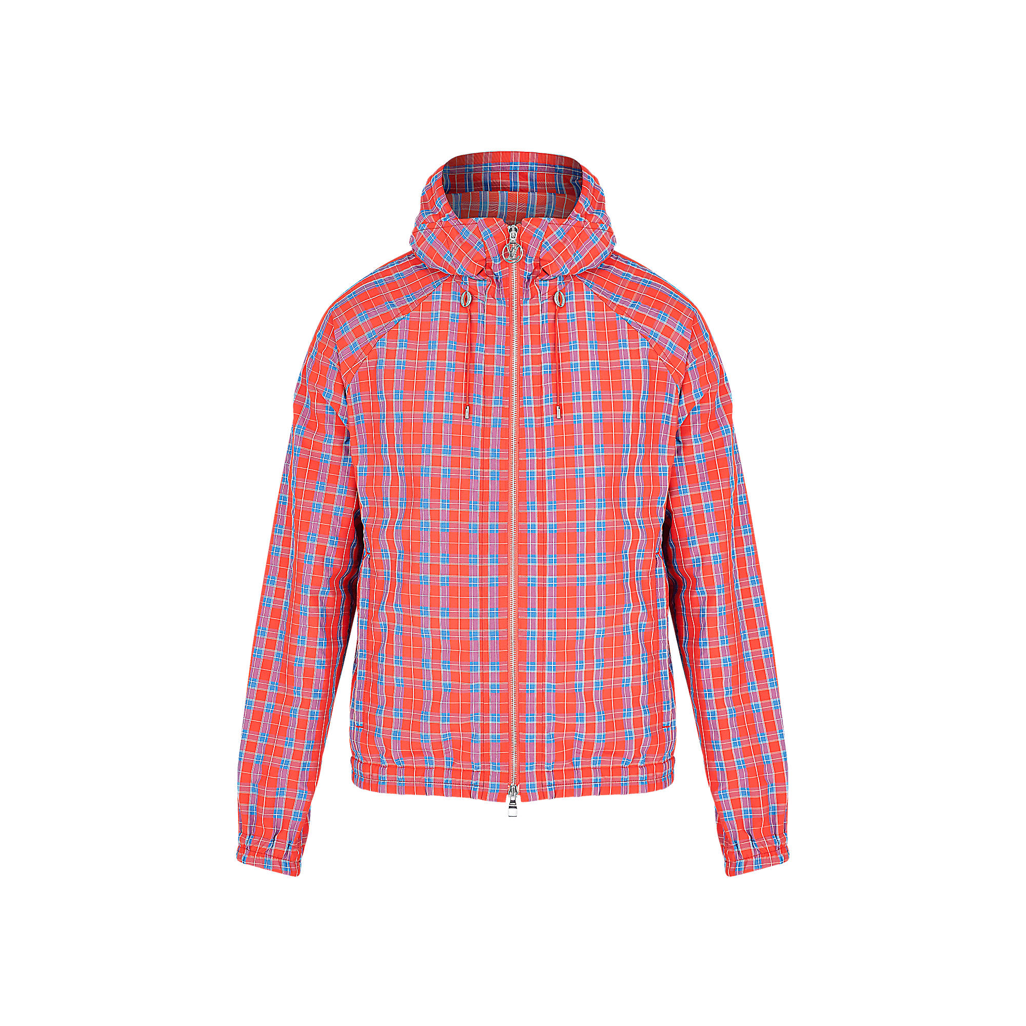 A casual piece in a technical seersucker adorned with this season’s emblematic check motif, unlined for extra lightness and comfort. Featuring an elasticated waist and cuffs, it can be packed away neatly into an inside pocket.