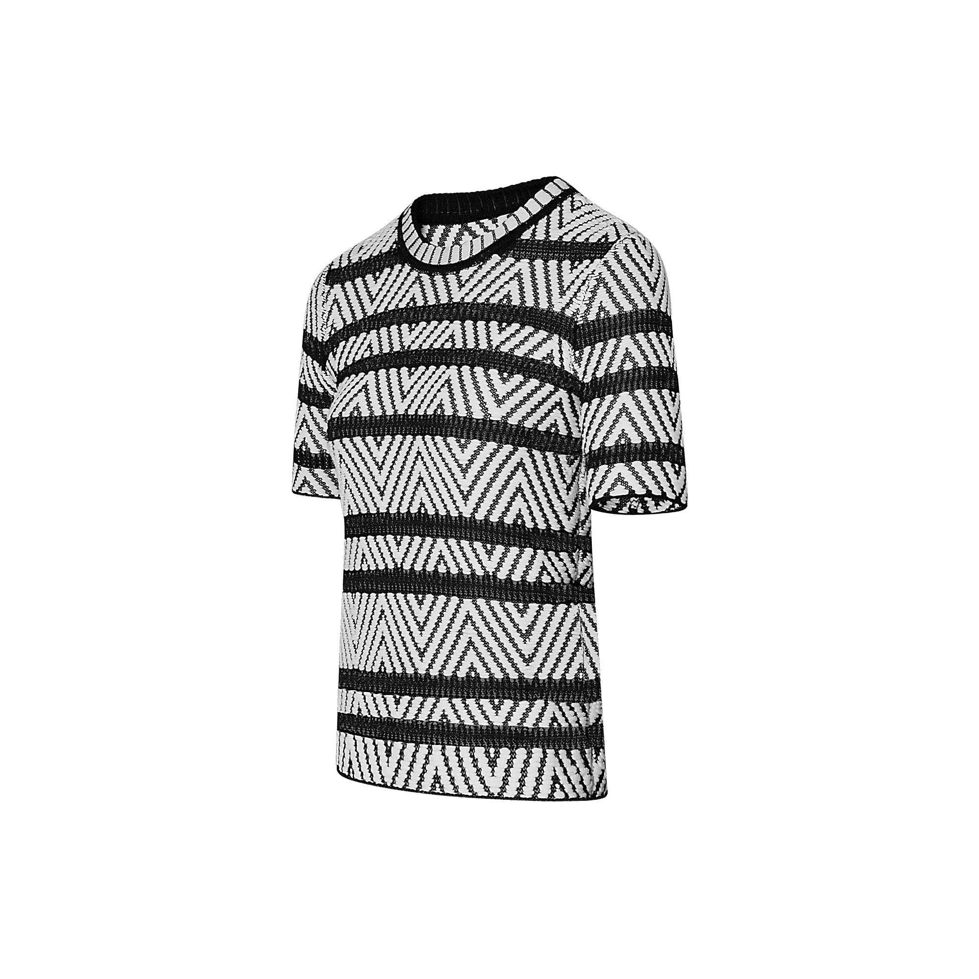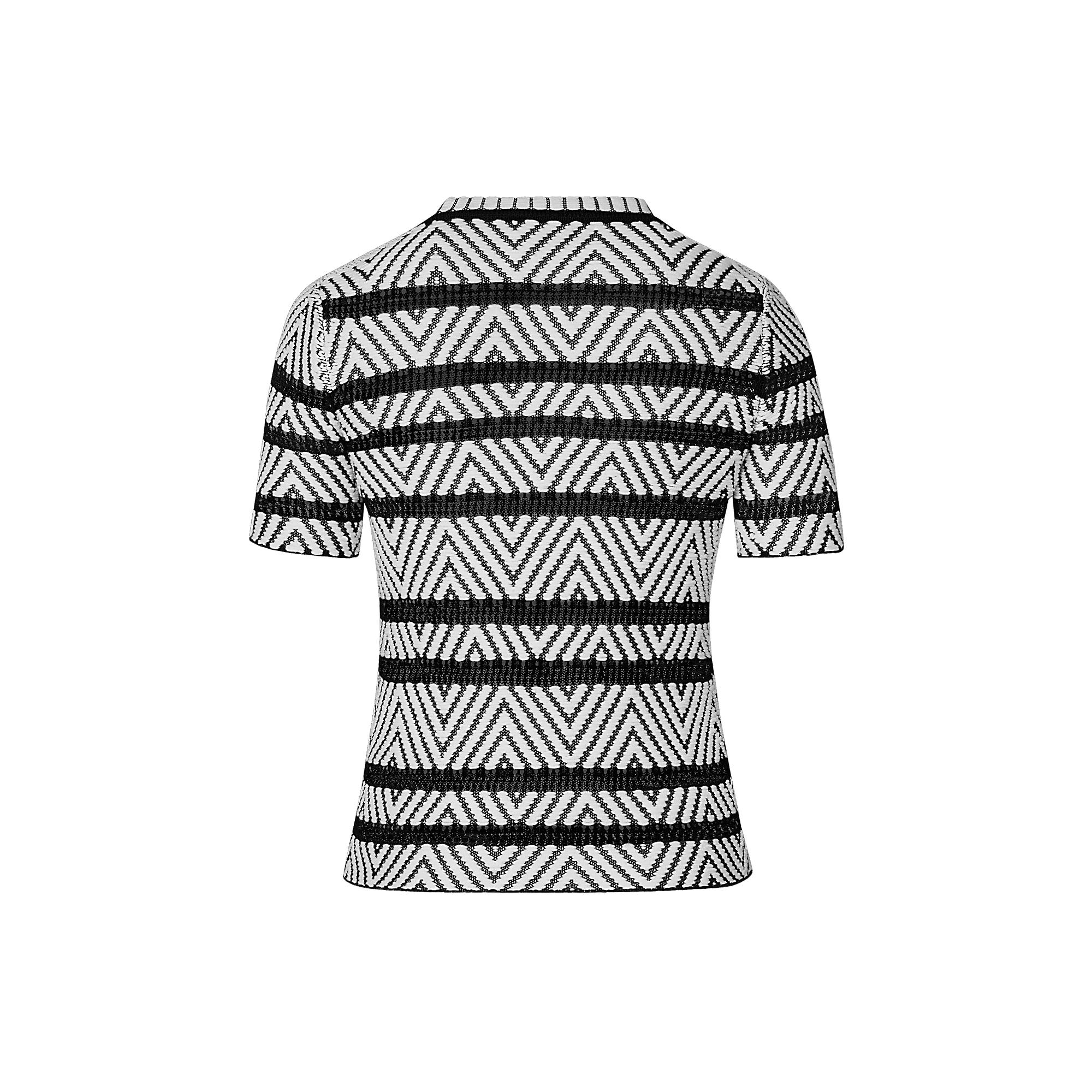 This stylish top is crafted from a floating jacquard knit with chevron motif, creating a striking 3D effect that adds texture and volume to the piece. Pair it with the season’s statement pants for a chic silhouette, or with the signature Leopard print for a contrasting play of patterns and motifs.