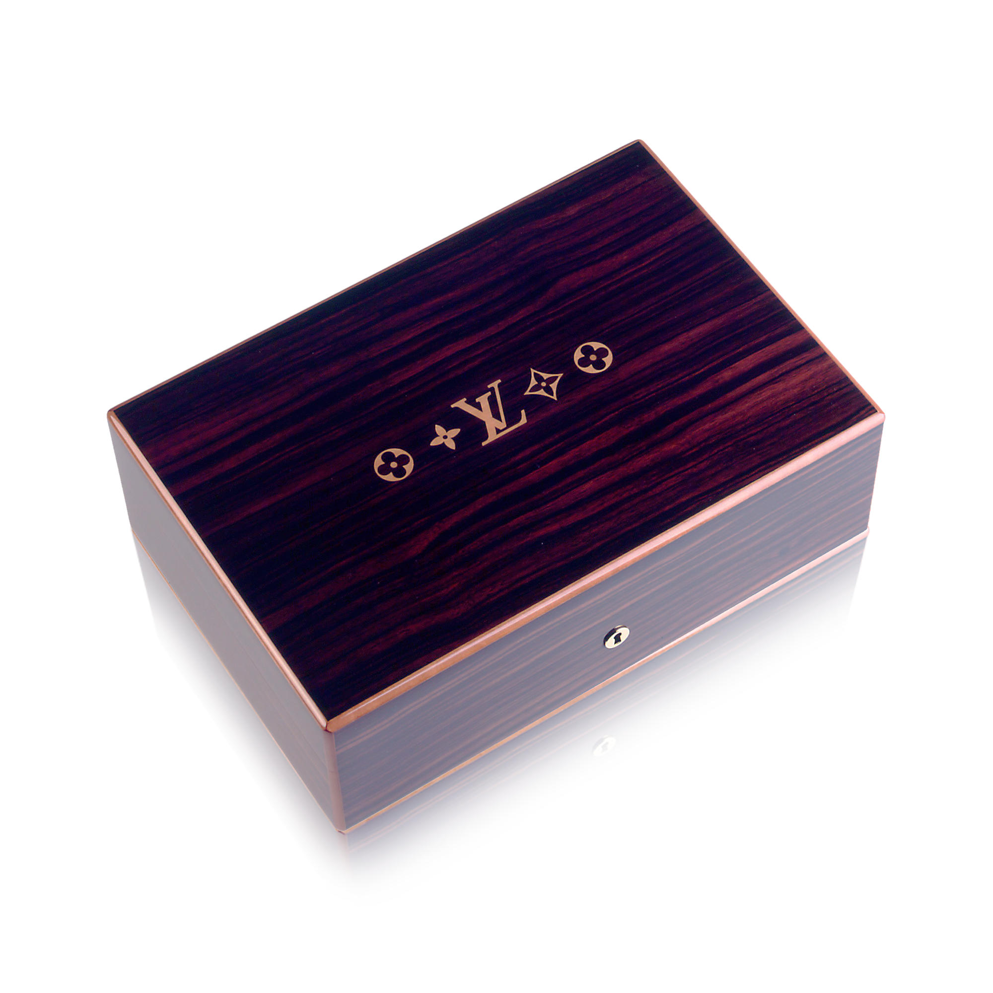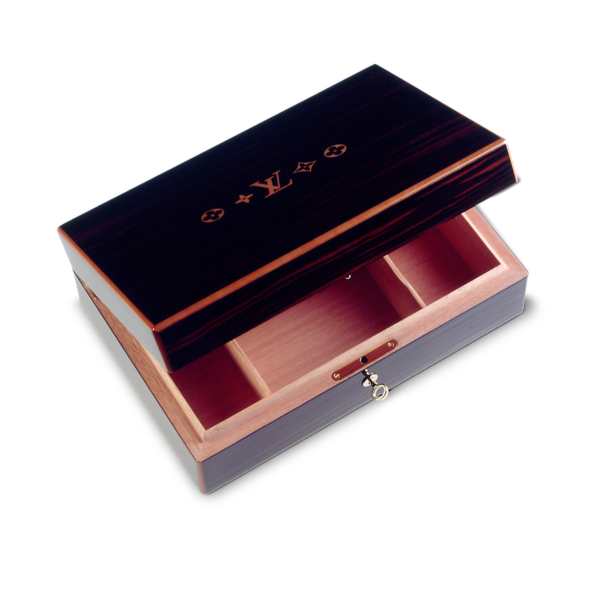 This cigar case stores 75 cigars at just the right humidity. Created in mahogany, it is enhanced by an elegant ebony finish and a pear wood Monogram inlay.