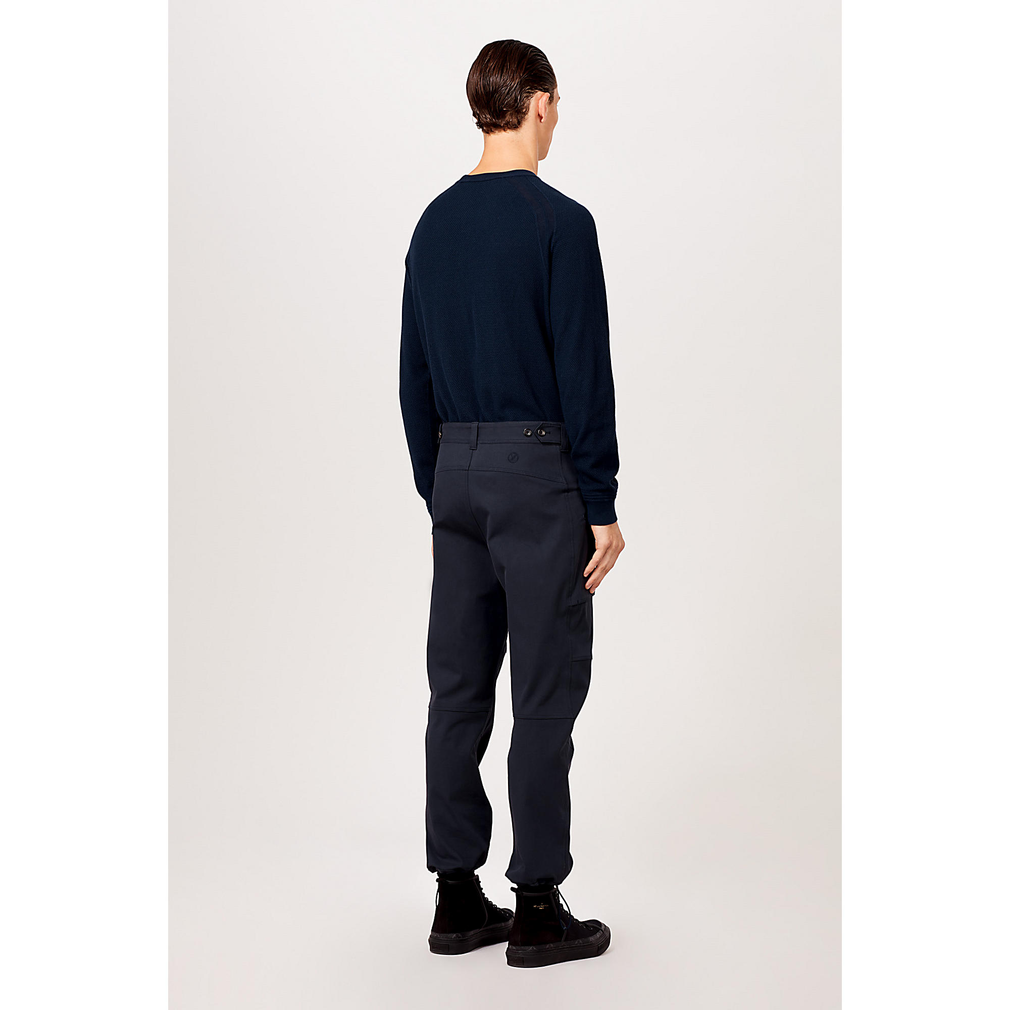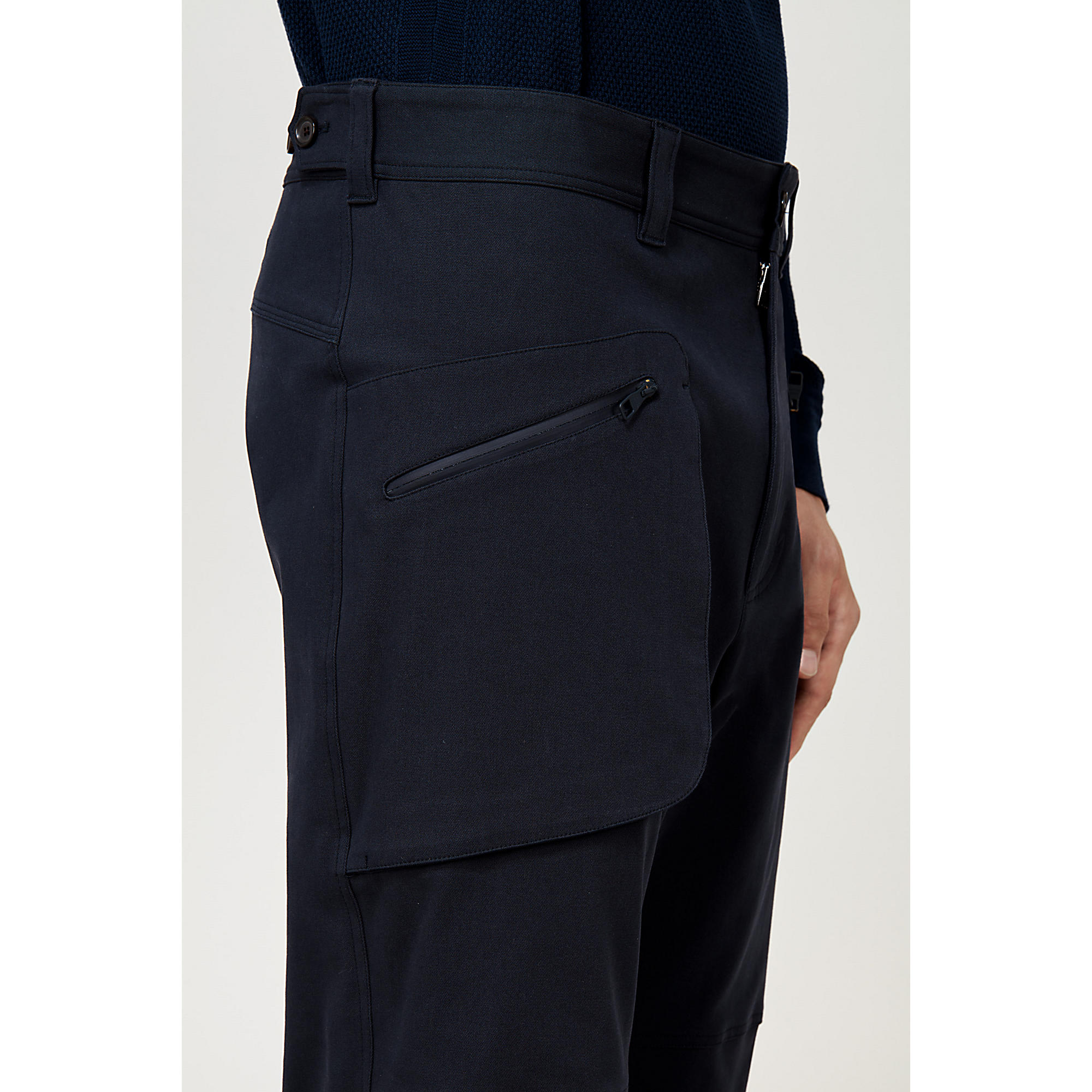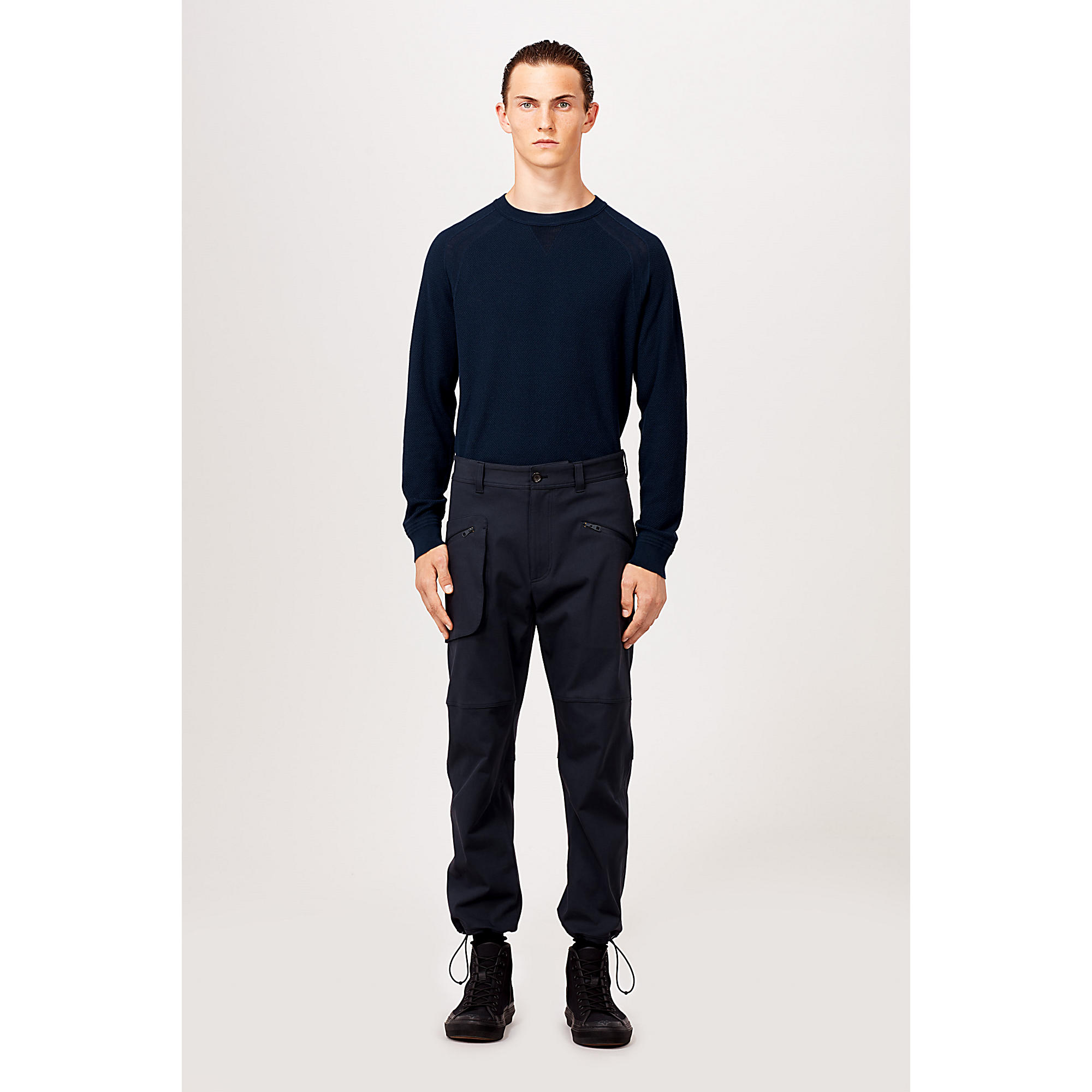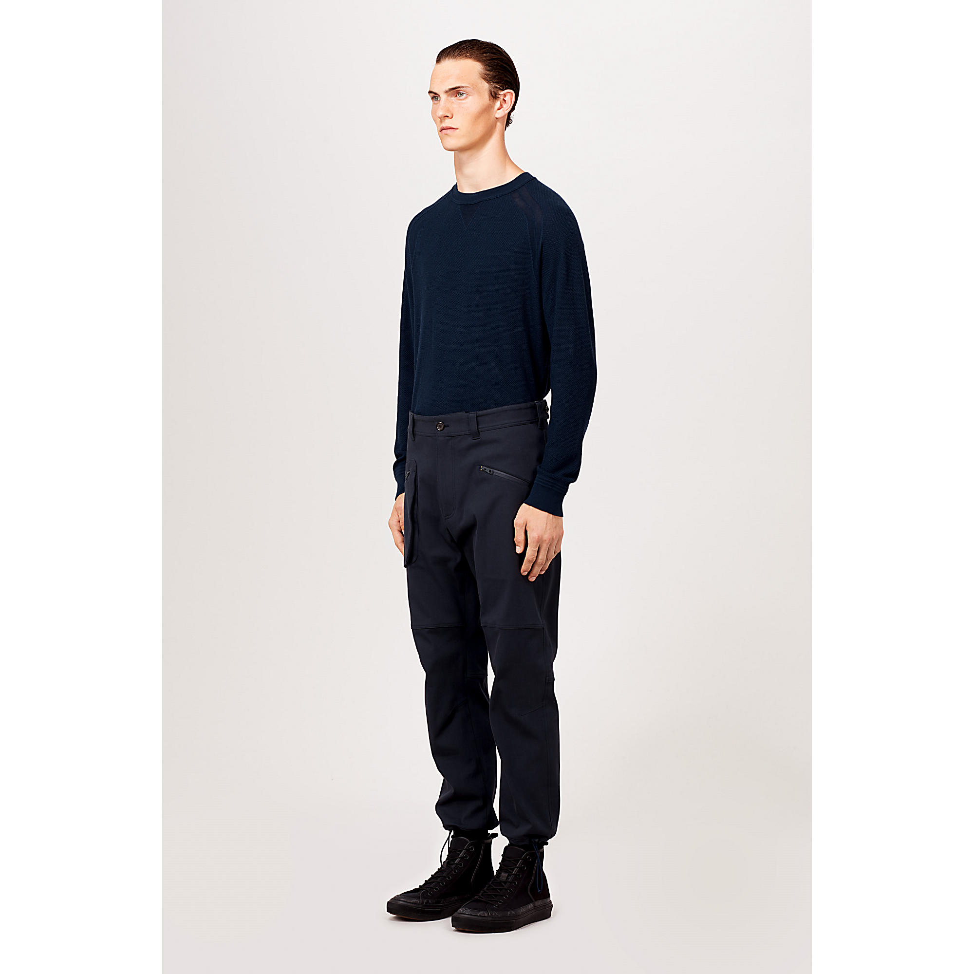 Reflecting the season’s outdoor adventure theme, these cotton pants have an anatomical, climbing-style fit.