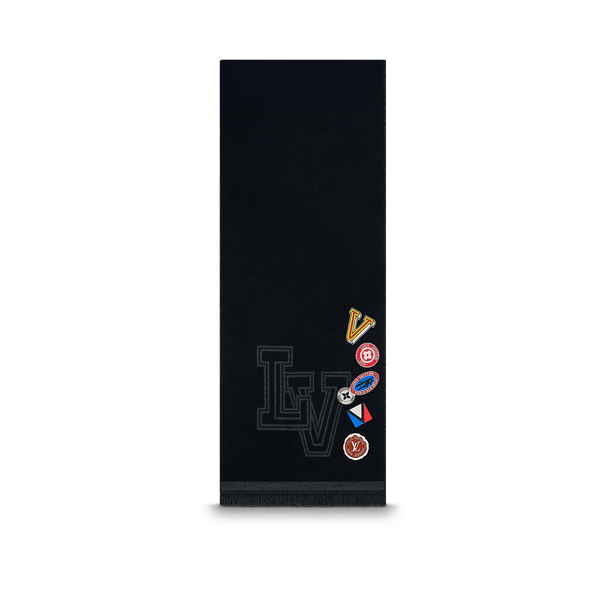 Go team! Inspired by “college spirit” scarves, this new model woven of pure wool features playful embroidered patches in exclusive Louis Vuitton motifs. Finished with a sporty fringe, it’s a versatile piece that is easy to wear, fall through winter.