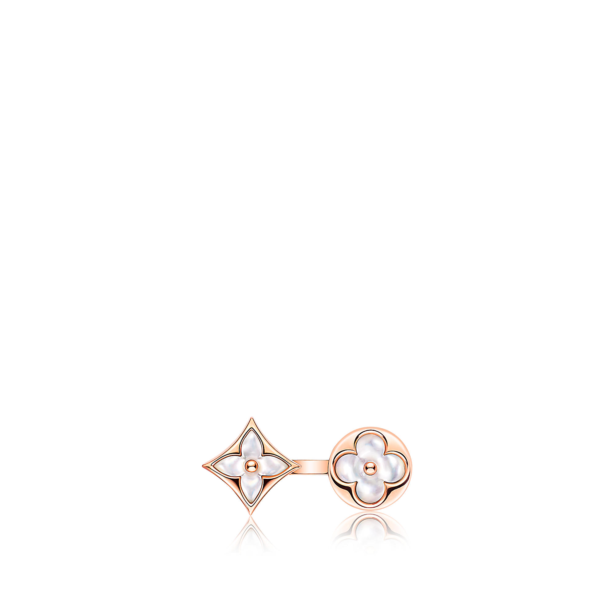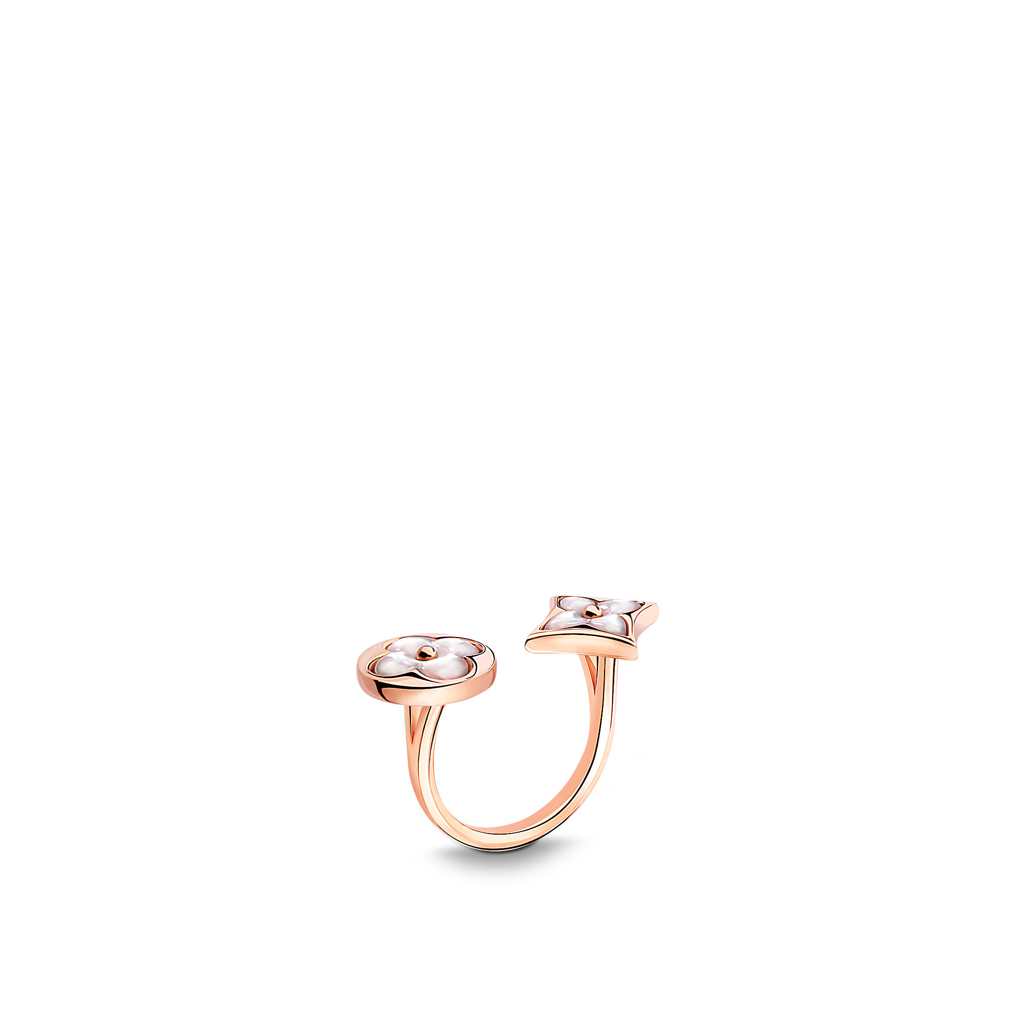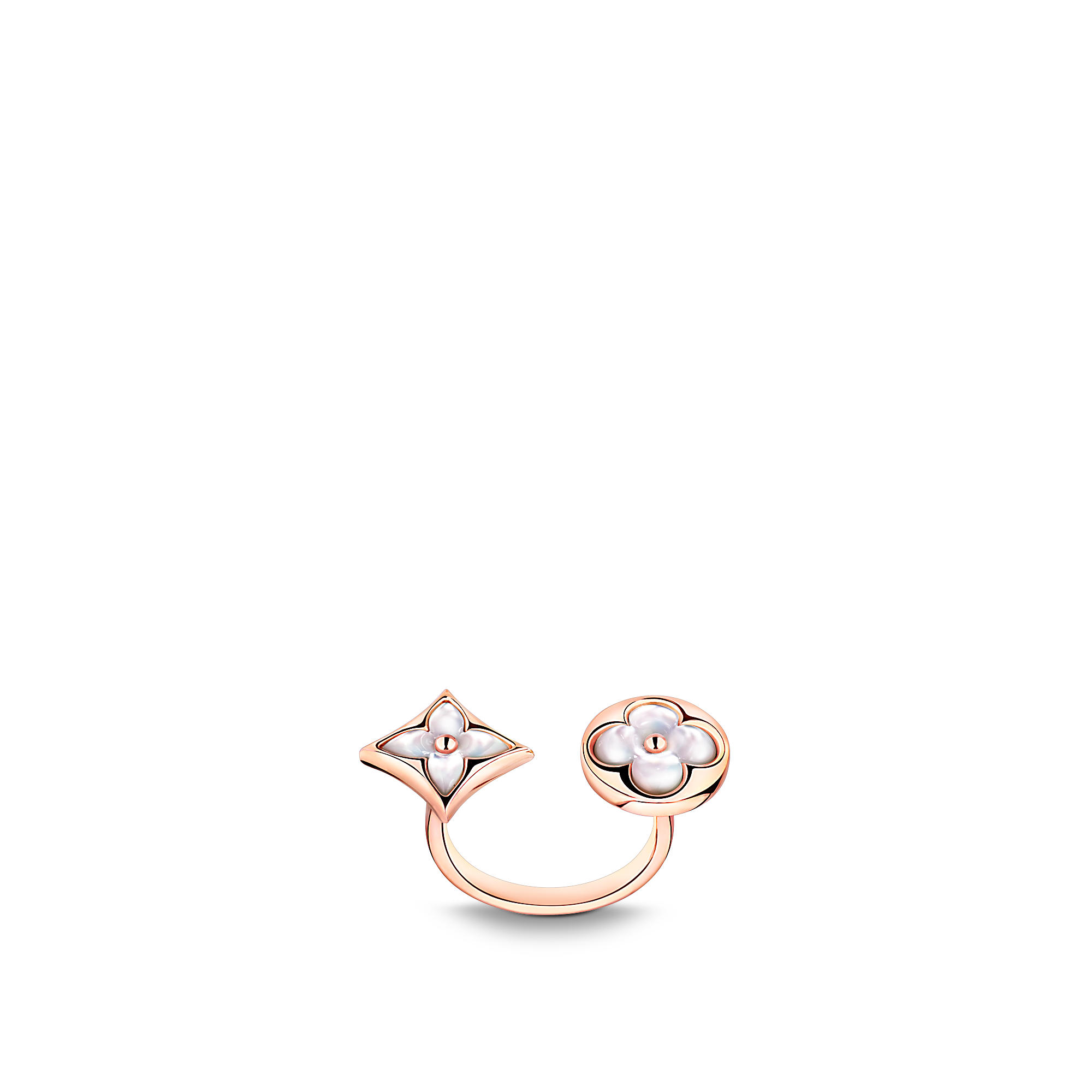 Colour Blossom BB celebrates the Monogram flowers, created in 1896 by Georges-Louis Vuitton. Set into pink gold, the flowers bloom into carved white mother-of-pearl. Months of work were necessary to perfect the stone’s subtle curves. Featuring the two iconic Monogram flowers, the Between the Finger Ring brings an extreme luster to every look.