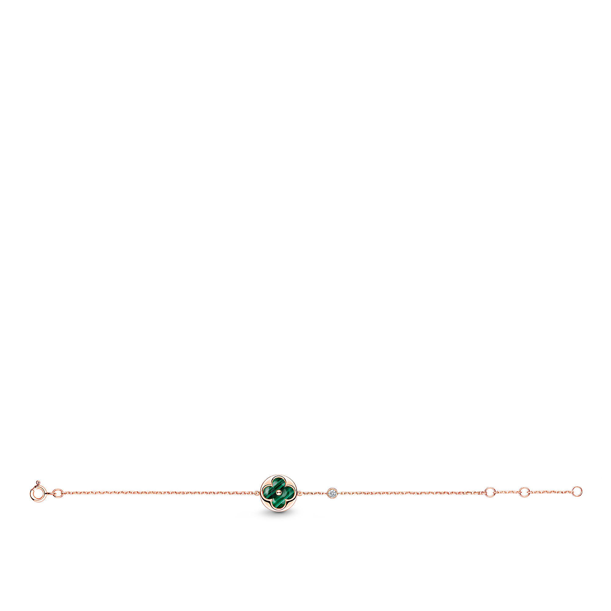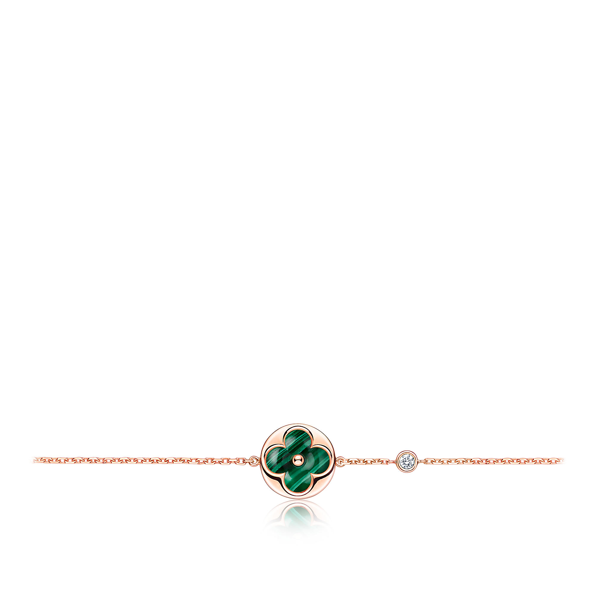 Colour Blossom BB celebrates the Monogram flowers, created in 1896 by Georges-Louis Vuitton. The flower blooms into a small format in carved Malachite and is set into pink gold highlighted by a diamond. Months of work were necessary to perfect the stone’s subtle curves. Easy to mix, the sparkle of the bracelet freshens every look thanks to a touch of bright Colour and extreme luster.