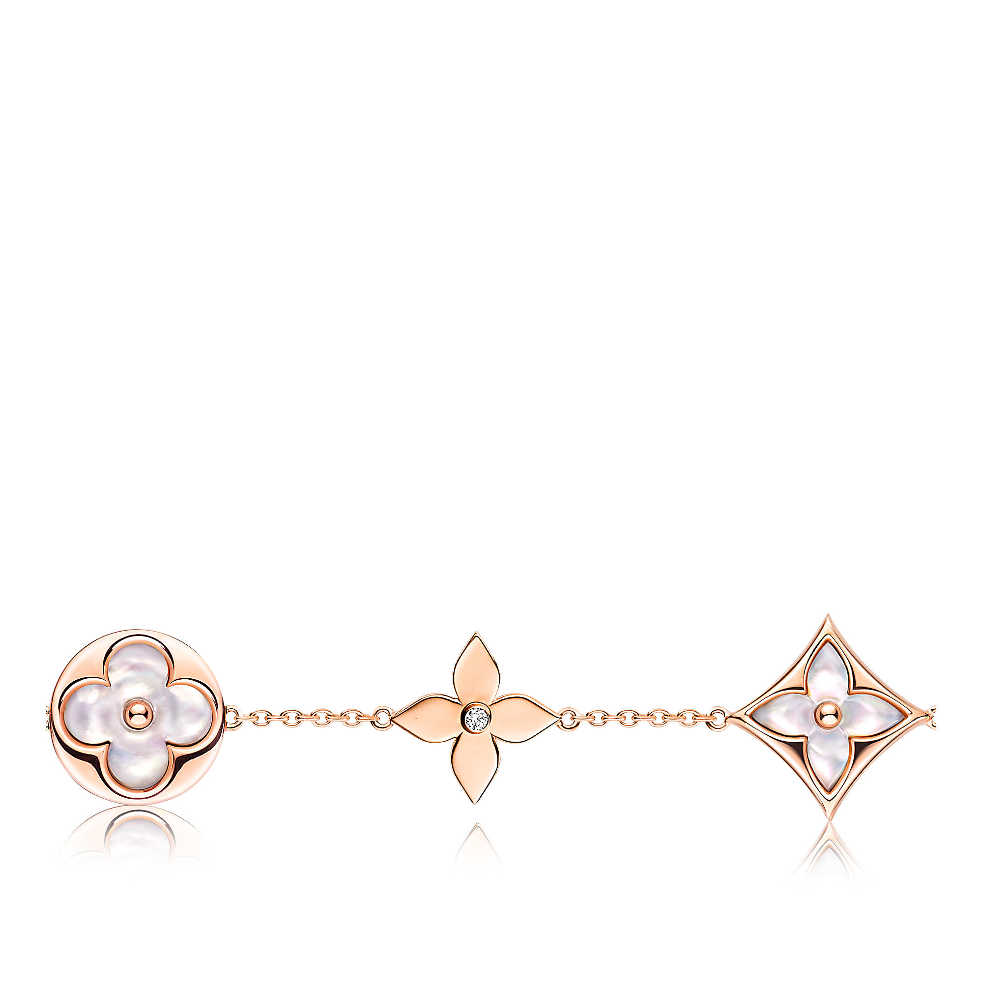 Colour Blossom celebrates the Monogram flowers, created in 1896 by Georges-Louis Vuitton. Set into pink gold, the flowers bloom into carved white mother-of-pearl. Months of work were necessary to perfect the stone’s subtle curves and sparkle. The dazzling array of jewel creations is an invitation to create your own personal harmony.