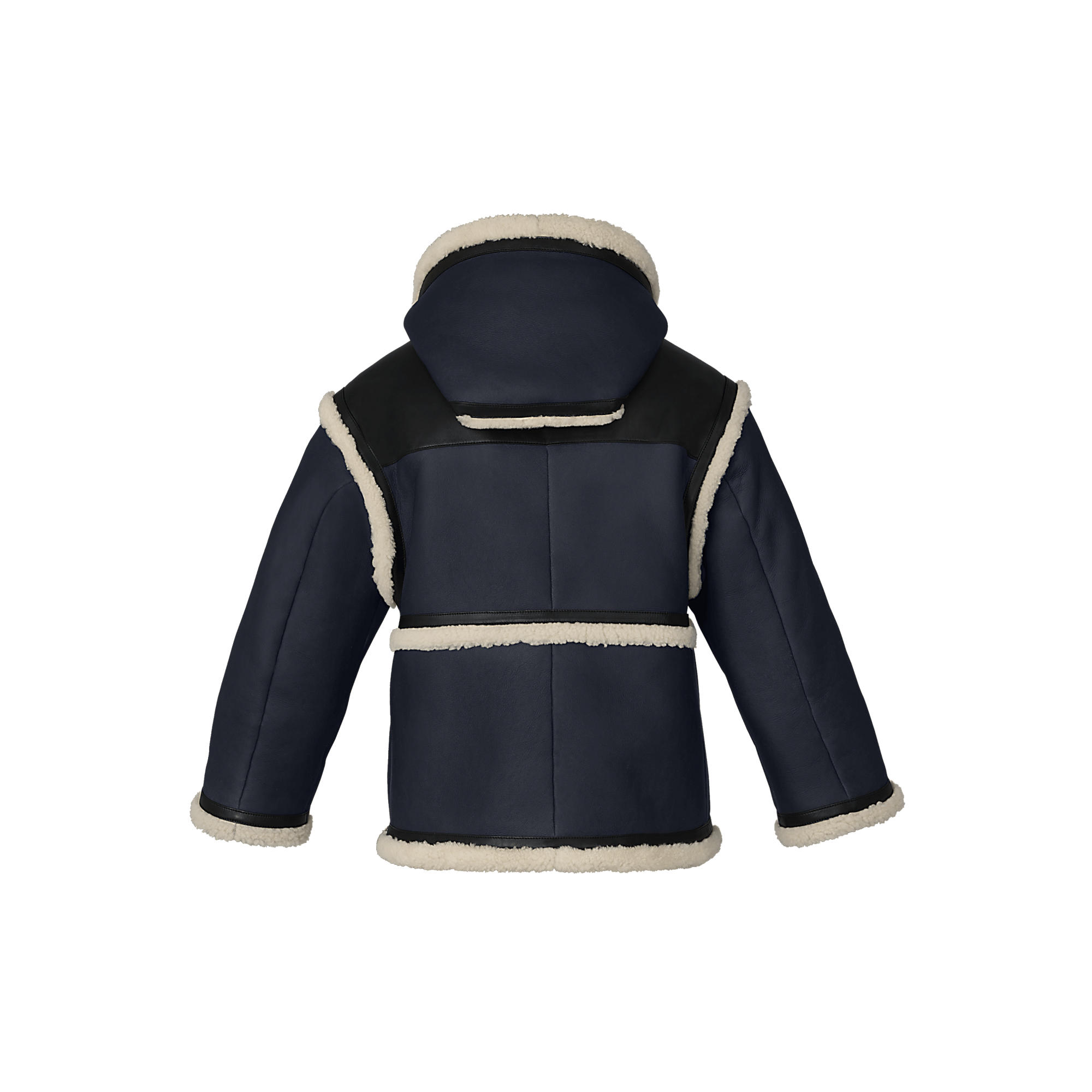 This slightly oversized shearling jacket with shortened sleeves plays with shape and fabric. The shearling lining appears in a contrasting colour at the cuffs and pockets, while leather inserts adorn the shoulders.