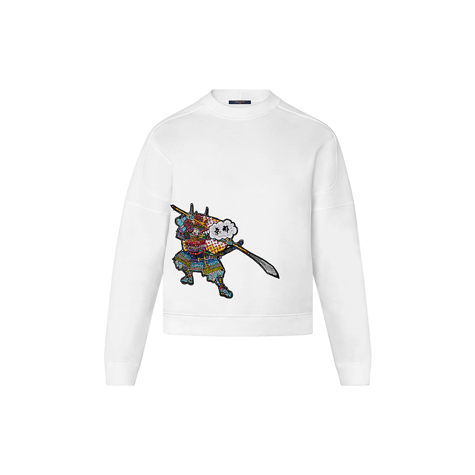 This classic sweatshirt shape is twisted with contrasting cut-out details on the shoulders and Kansai Yamamoto’s iconic Samurai illustration, reinterpreted as an embroidered patch. Contrasting tones add a modern touch, while the motif’s embroidered Monogram background reinterprets Maison’s iconic signature.