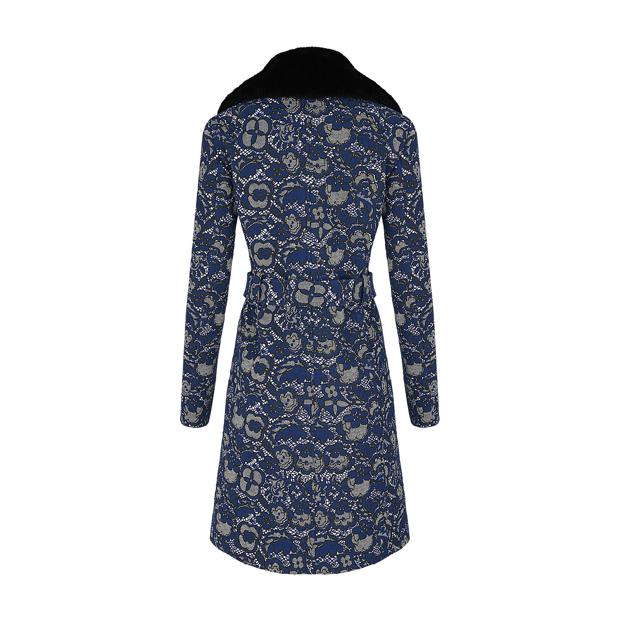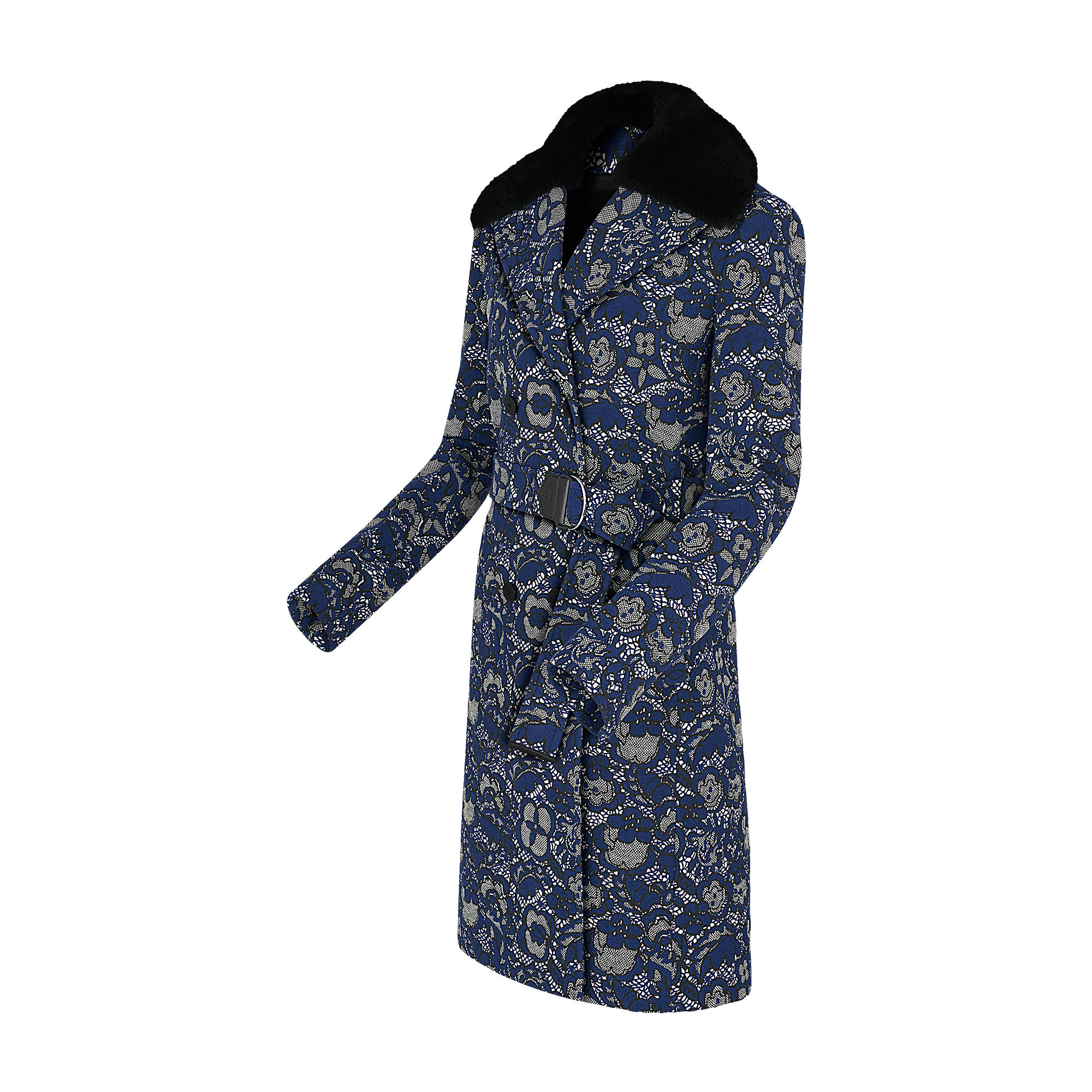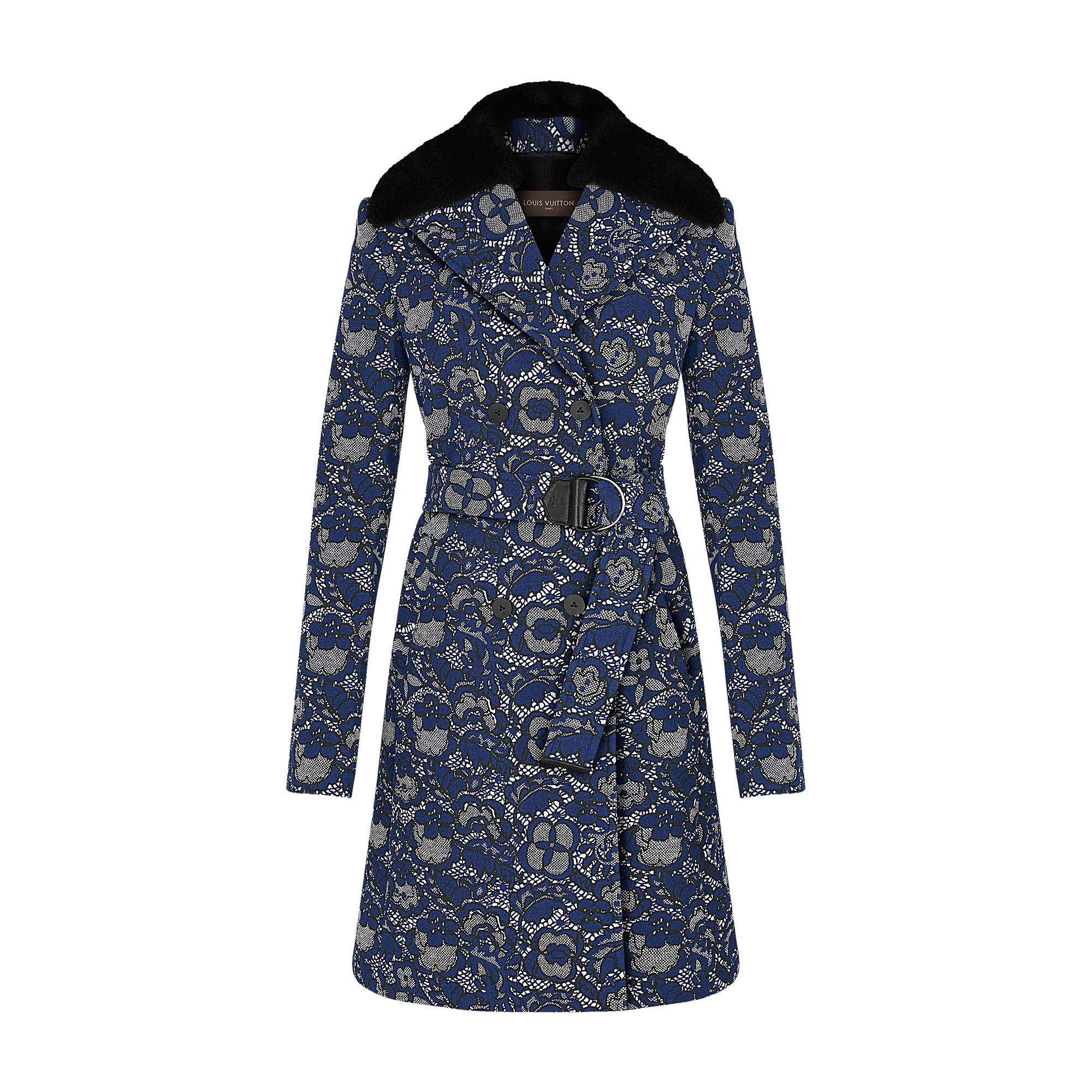 This long double-breasted trench coat with a detachable shearling collar has been reimagined in jacquard with a flowered lace aspect. LV rubber buttons and leather notch on the belt add signature touches.