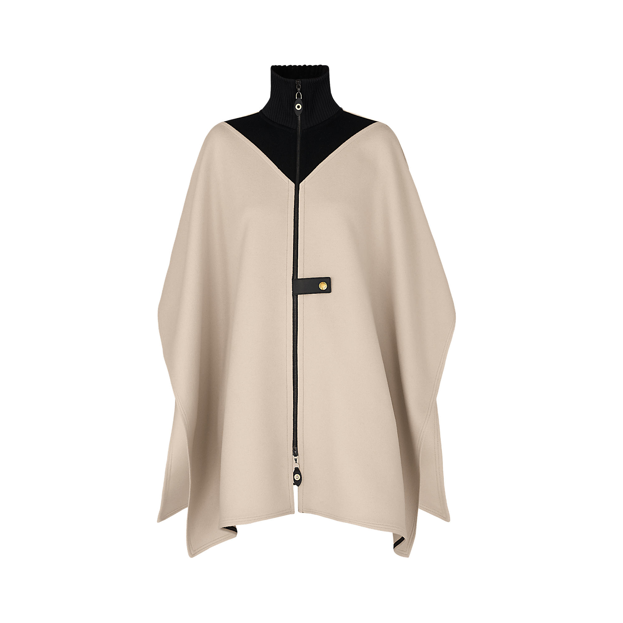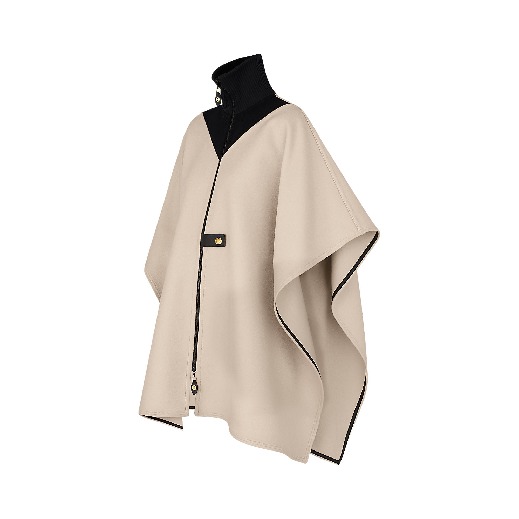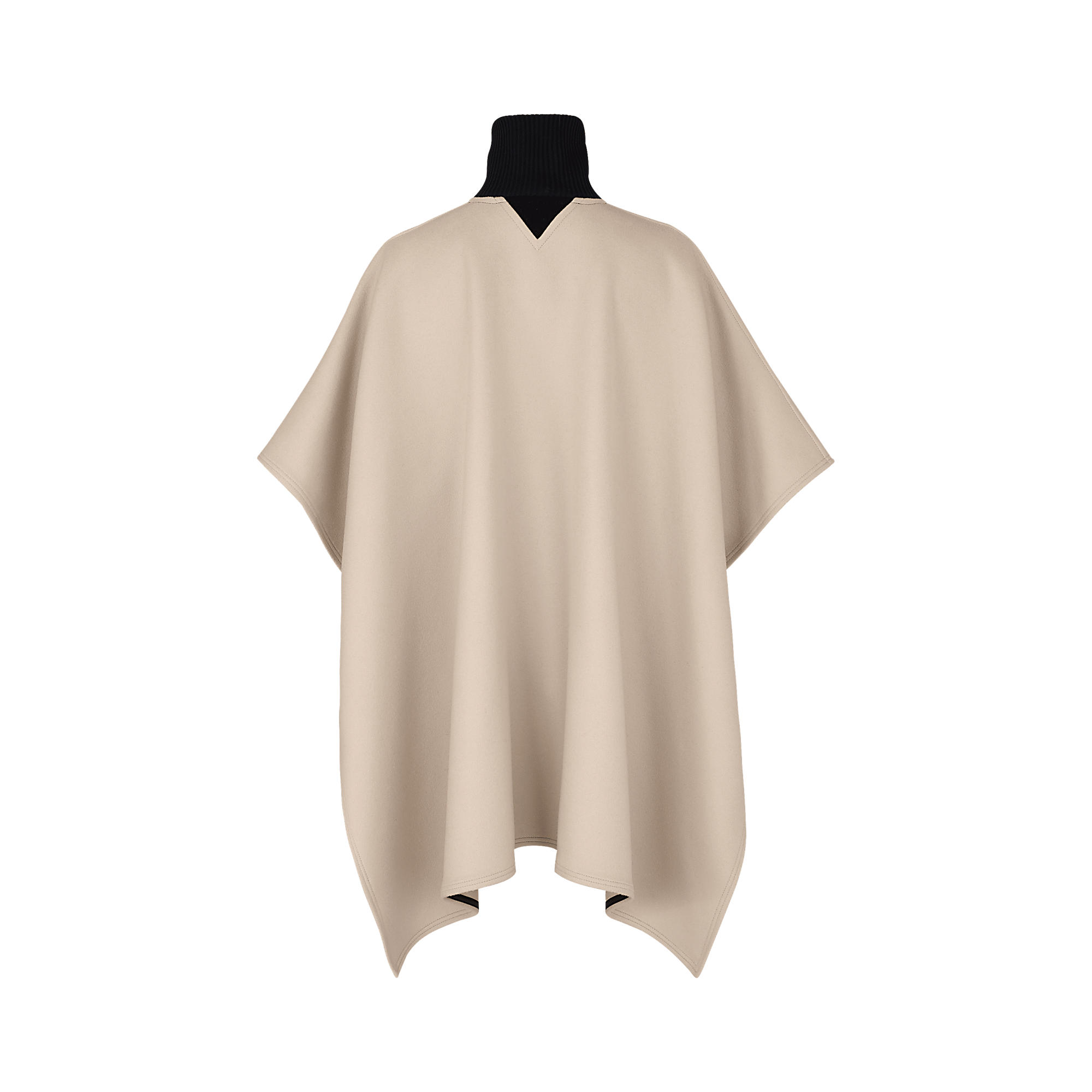 Tailored from warm double cashmere, this cape’s knit turtleneck collar creates a cosy yet chic silhouette. The season’s V signature is visible on the front and back while a black leather fastening strap adorns the back of the piece.