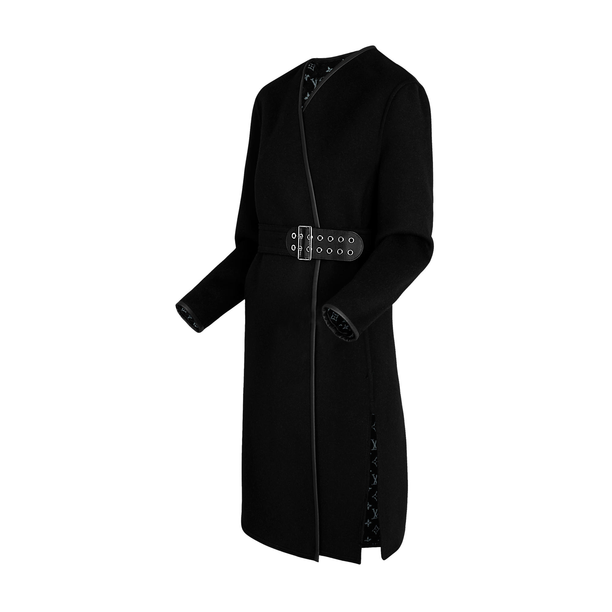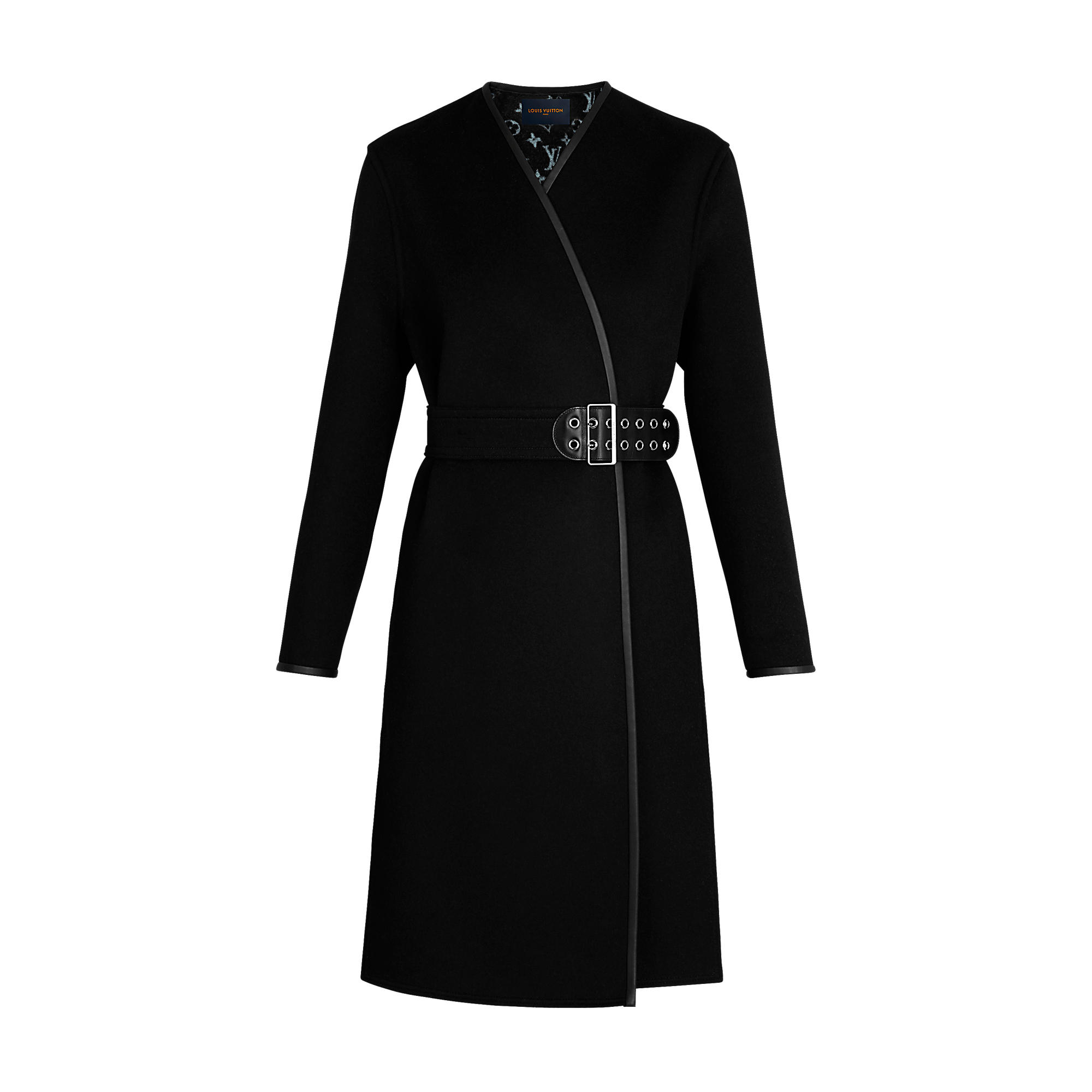 Inspired by Japanese kimonos, a major theme of this collection, this wrap coat is crafted in double cashgora for softness and brilliance. The Monogram appears in a contrasting shade inside, while signature elements include leather piping and the season’s new leather belt with eyelets.