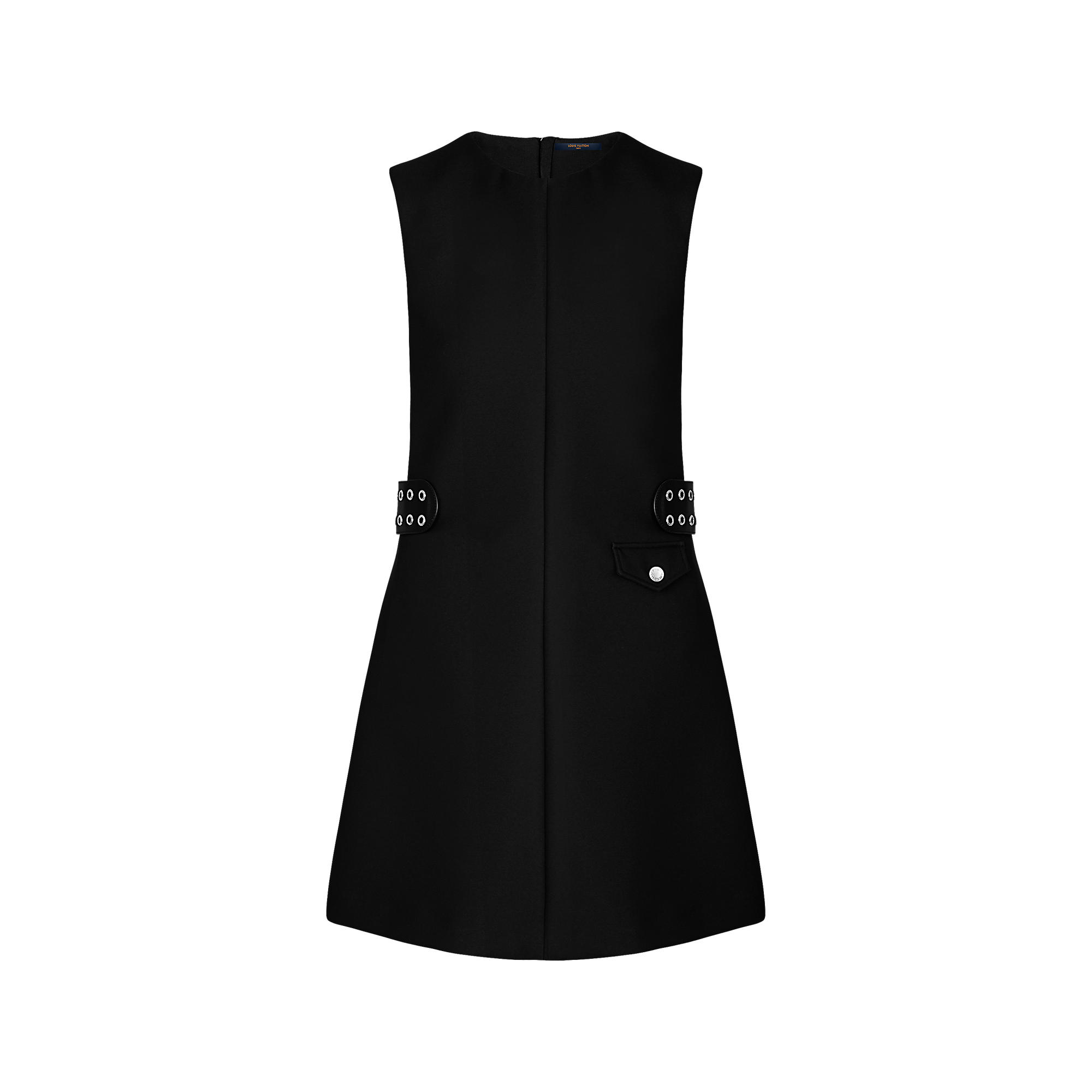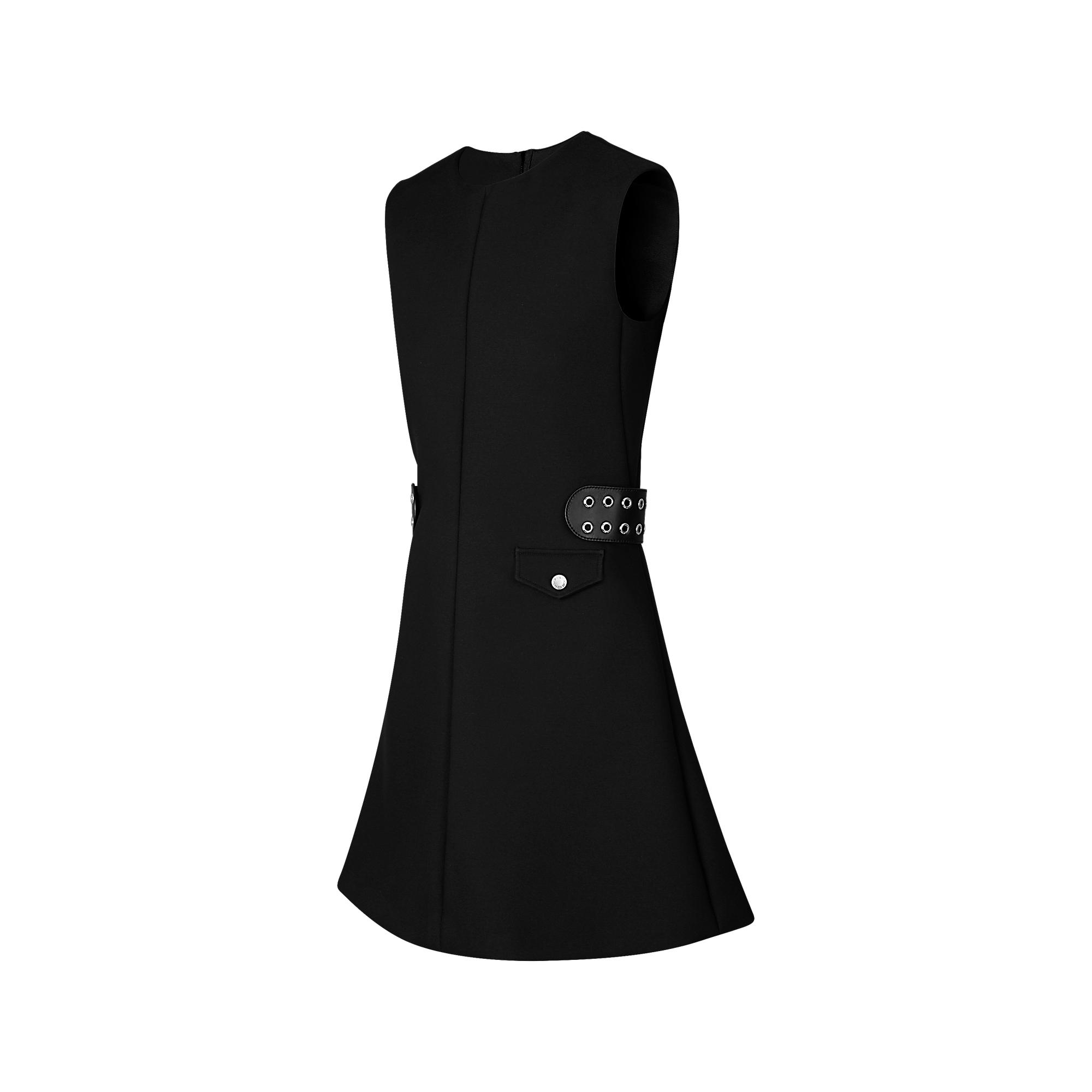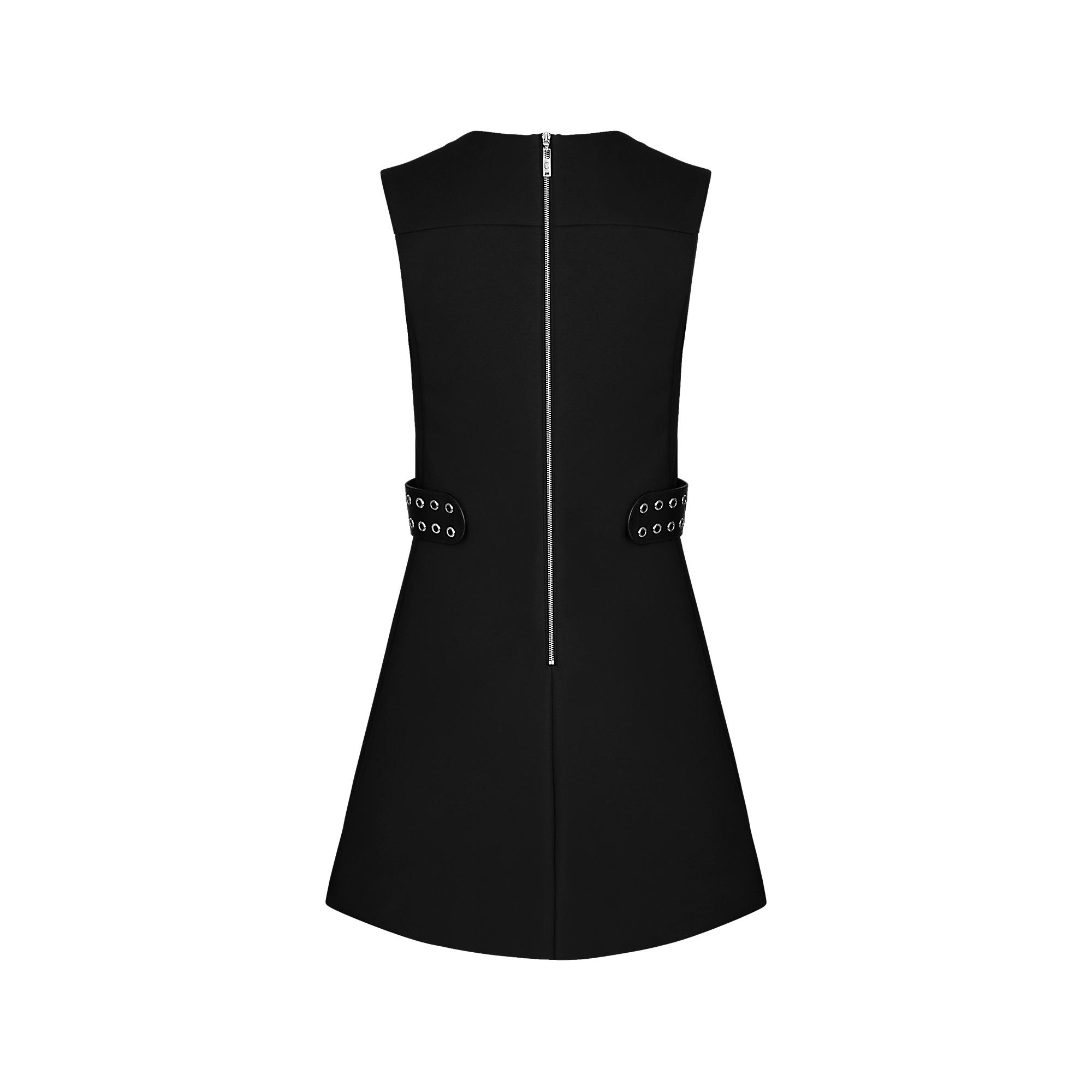 Tailored from a technical scuba-style fabric, this short dress has the feminine A-line shape that is one of this season’s signatures. The sides feature tone-on-tone straps with the metallic eyelet details that are another of the collection’s iconic motifs.