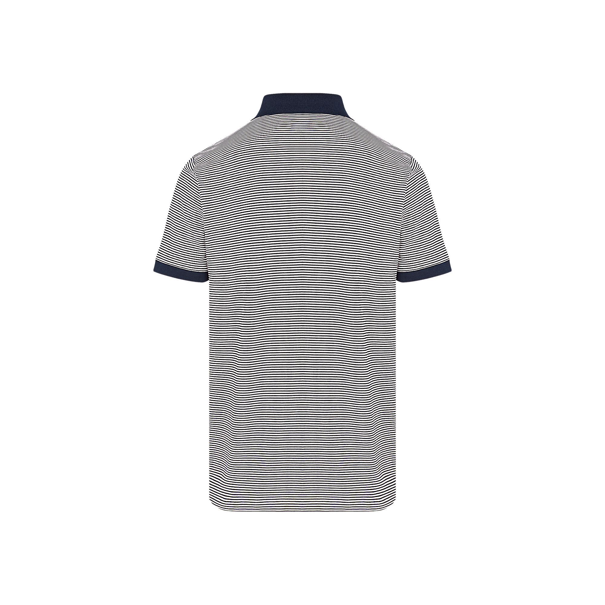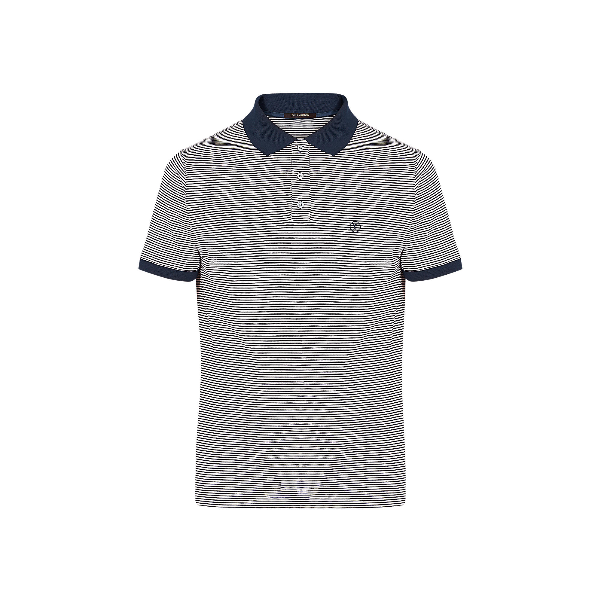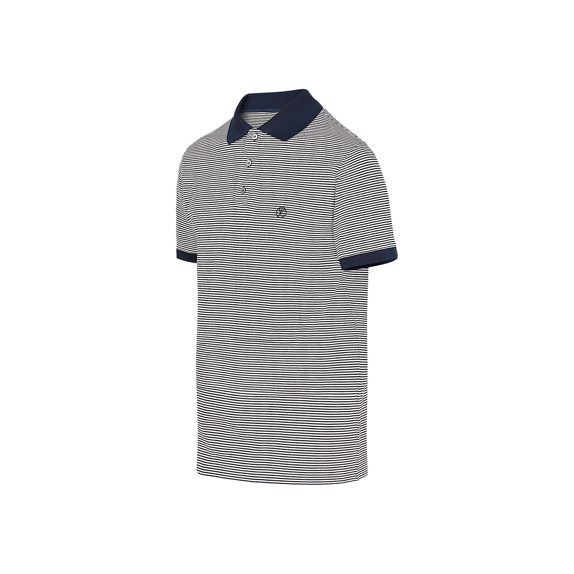 An elegant polo shirt whose fil à fil cotton fabric contributes a small striped motif and adorned with a LV embroidery on the chest.