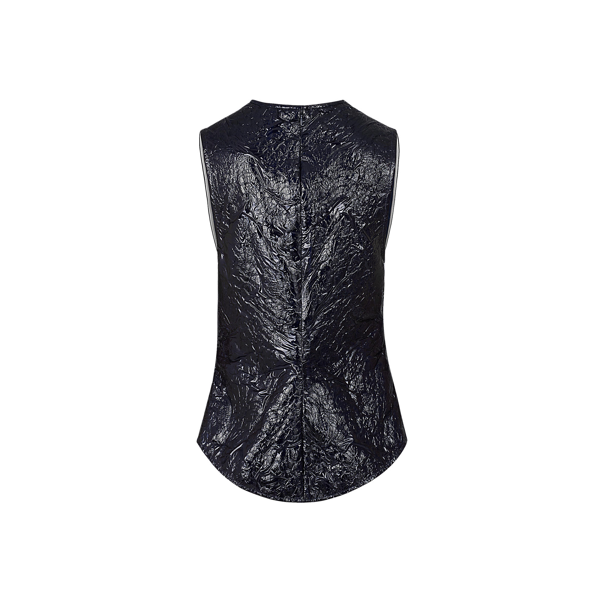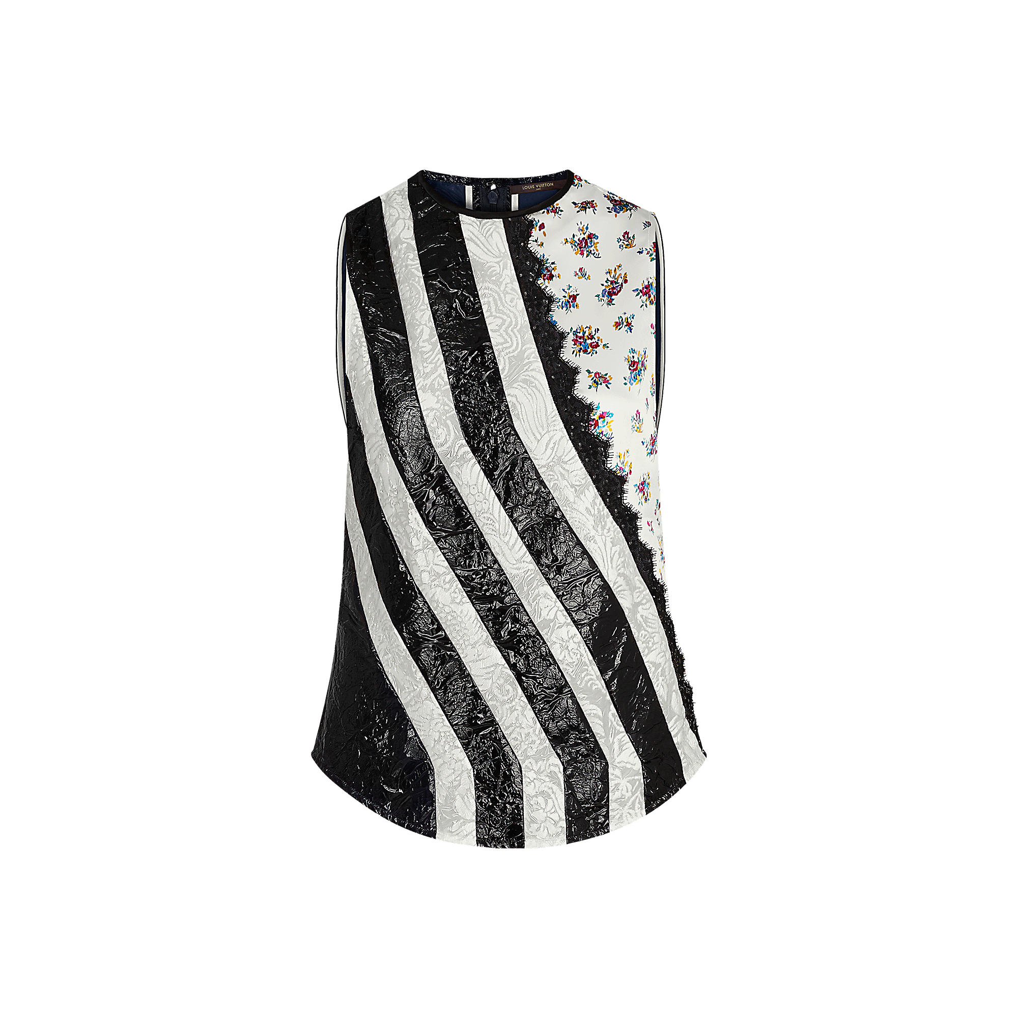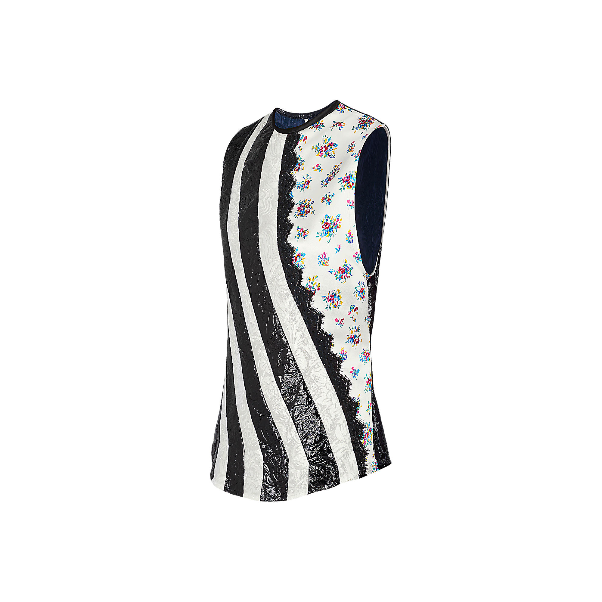 A graphic piece with stripes recalling American sportswear, this sleeveless top can be paired with denim or with a skirt for an evening look. It features the season’s floral print motif on velvet with a special “coated devoré” finish, with lace inserts evoking the collection’s lingerie theme.