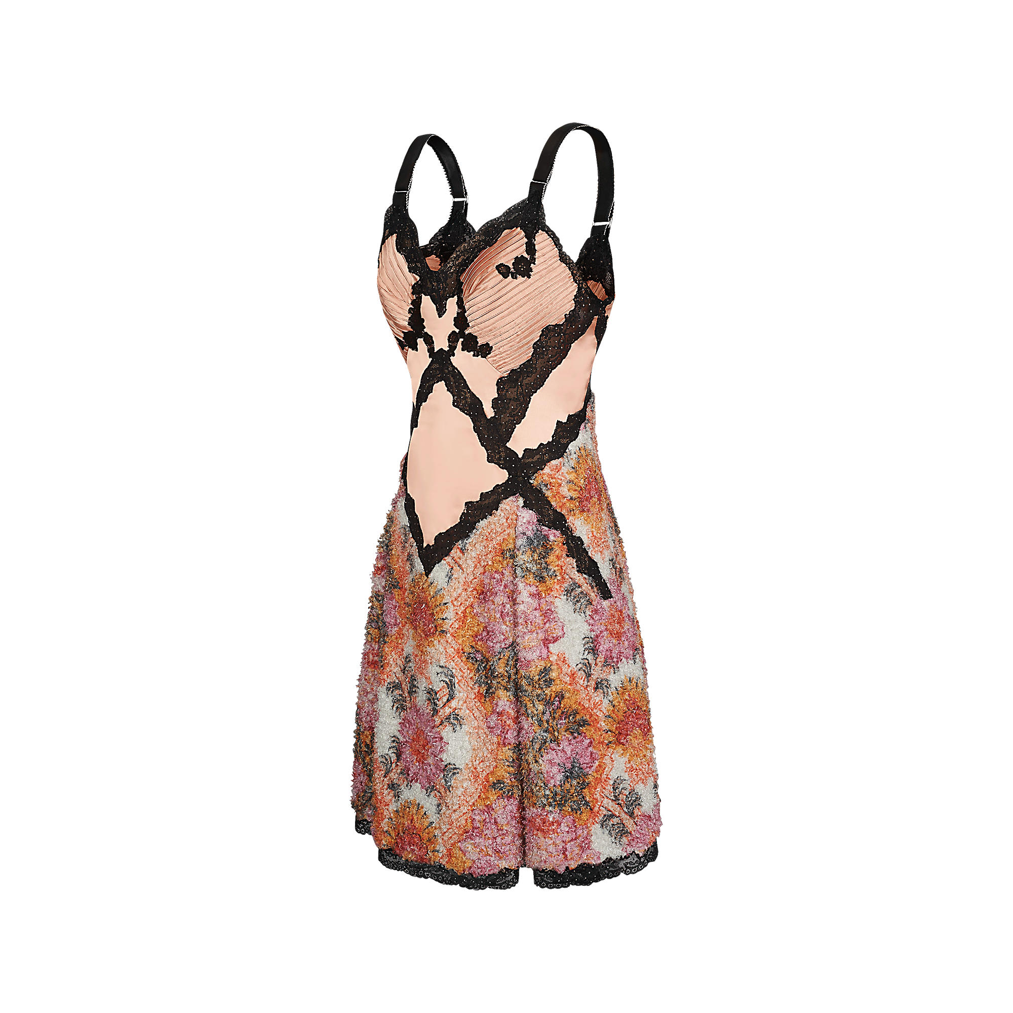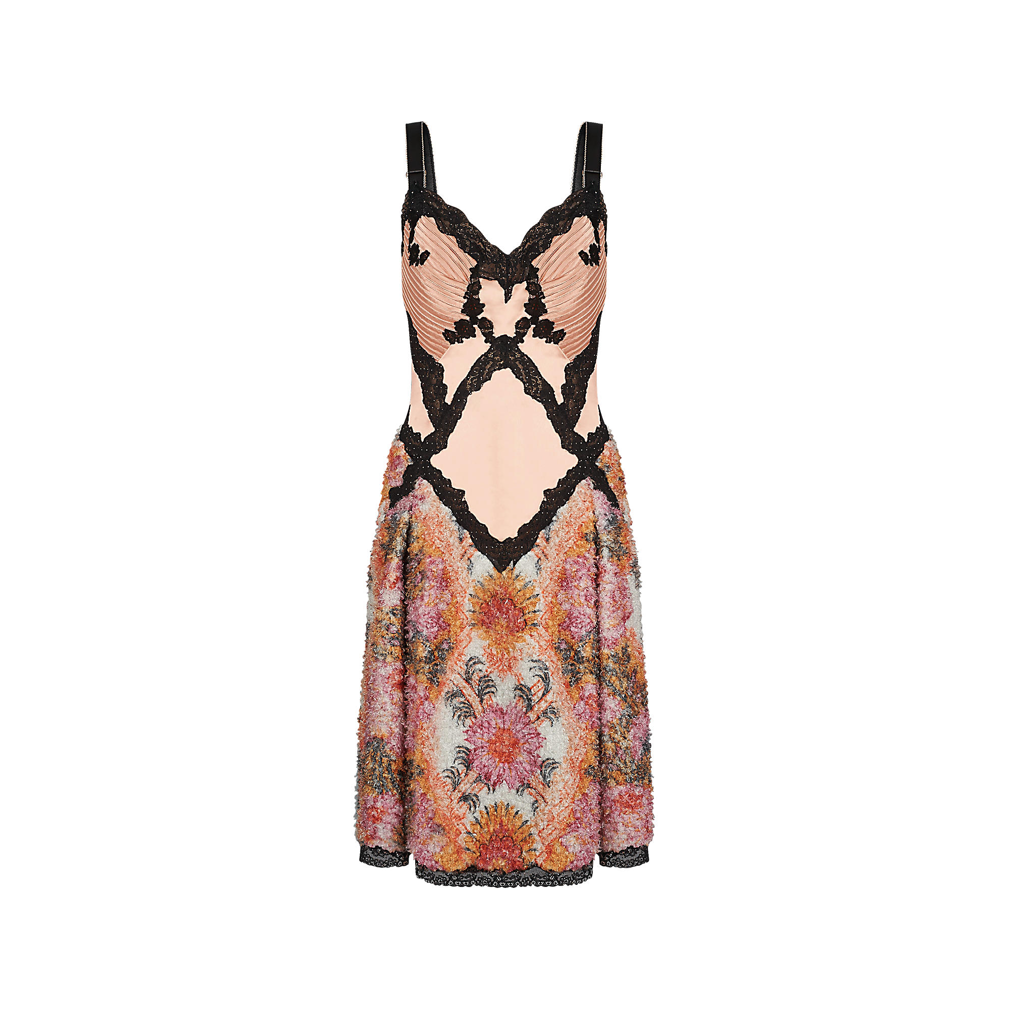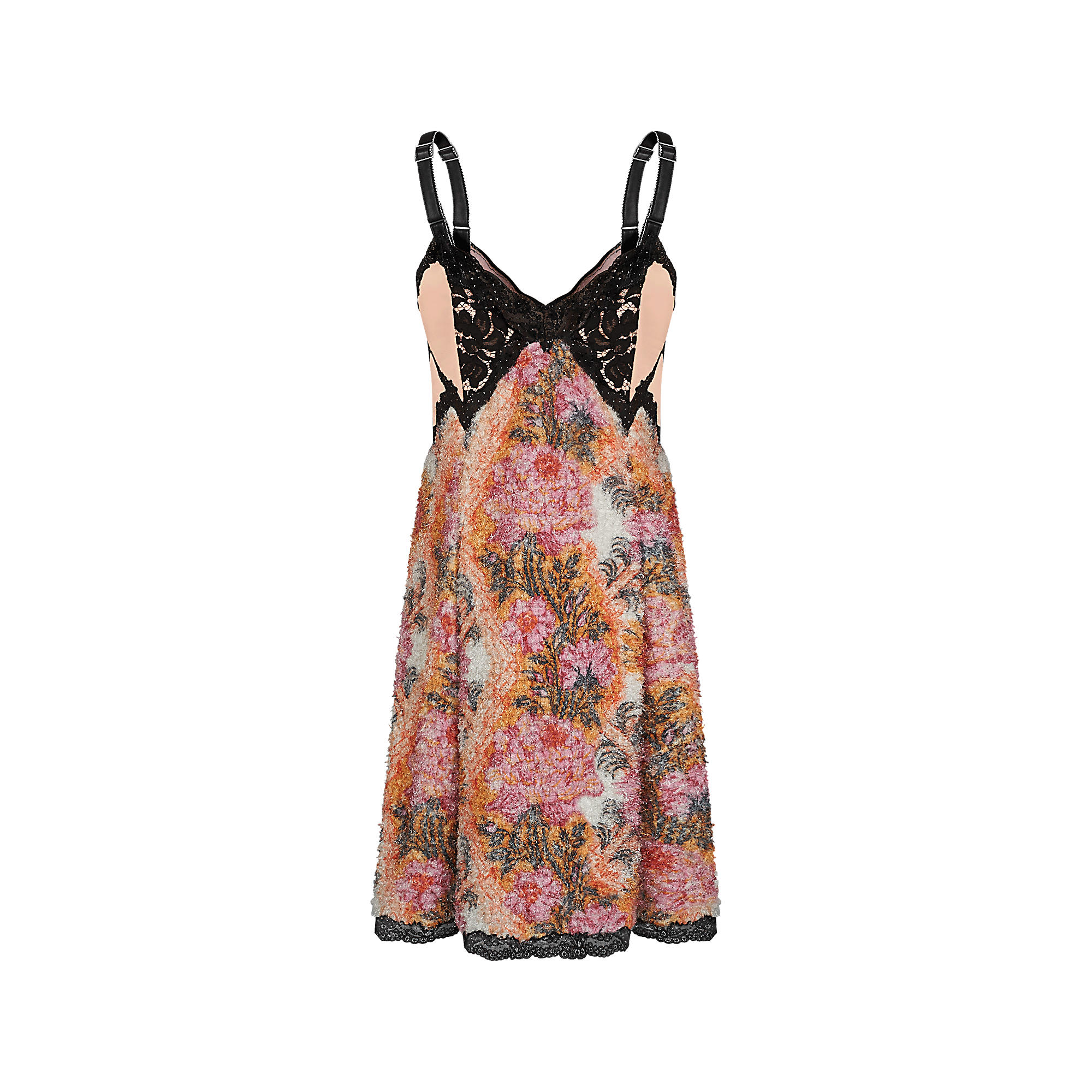 Embodying the collection’s prominent lingerie theme, this feminine piece features a geometric take on the season’s floral prints in a romantic palette of colours. The handcrafted lace inserts on the chest and stitching around the bust accentuate the geometric effect.