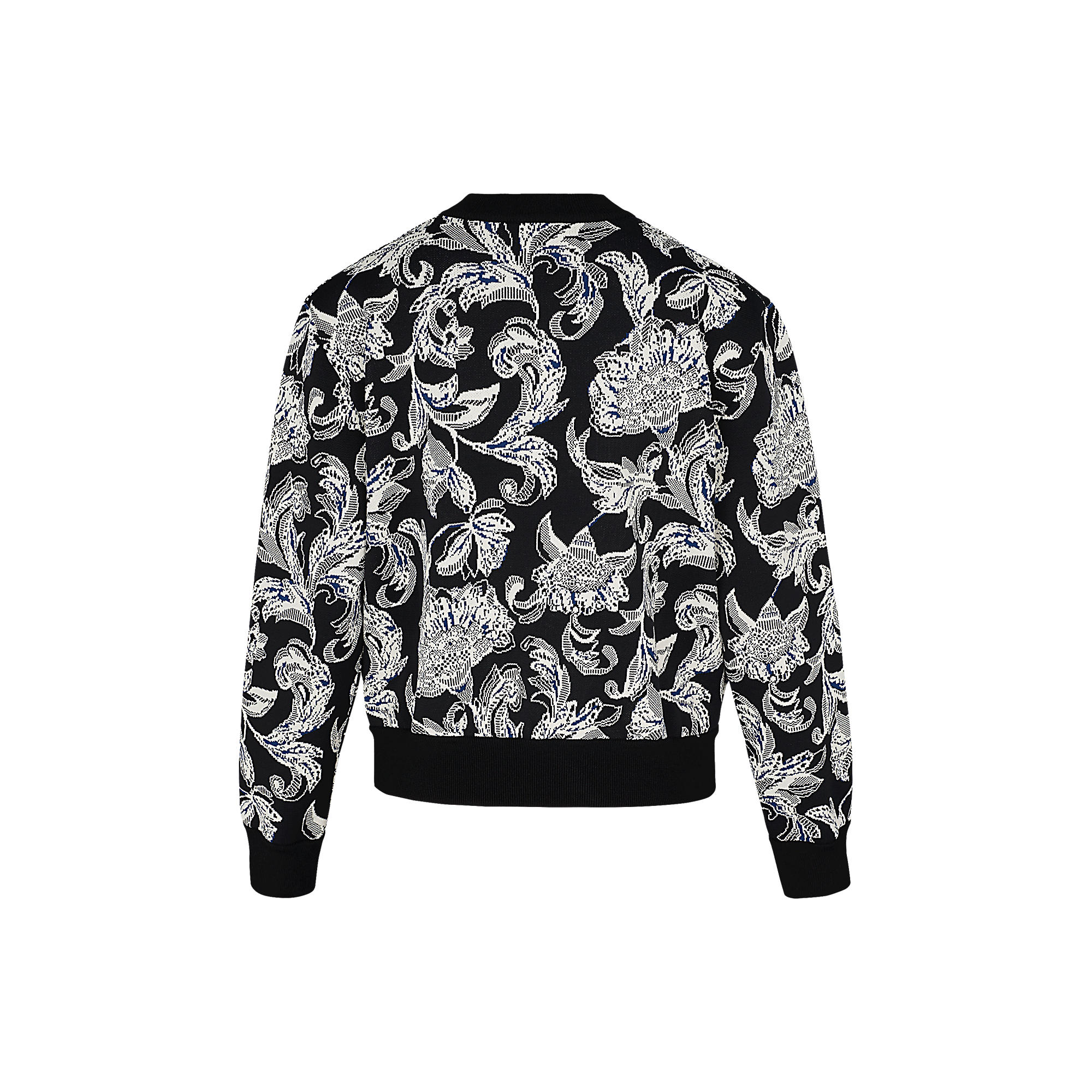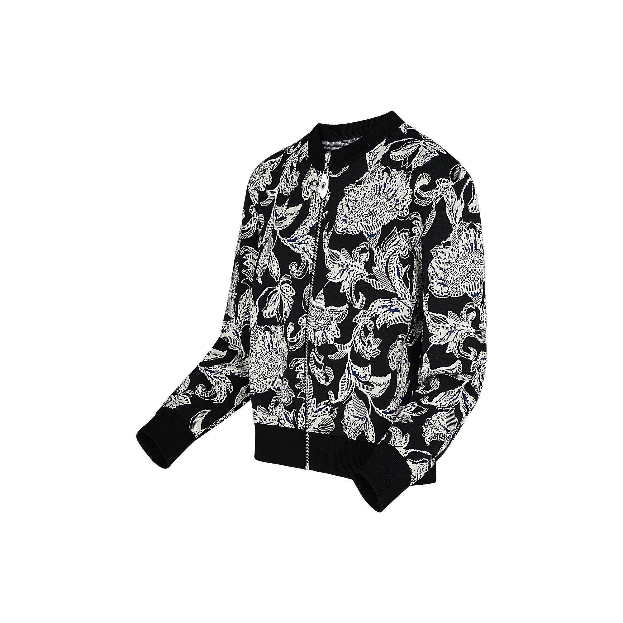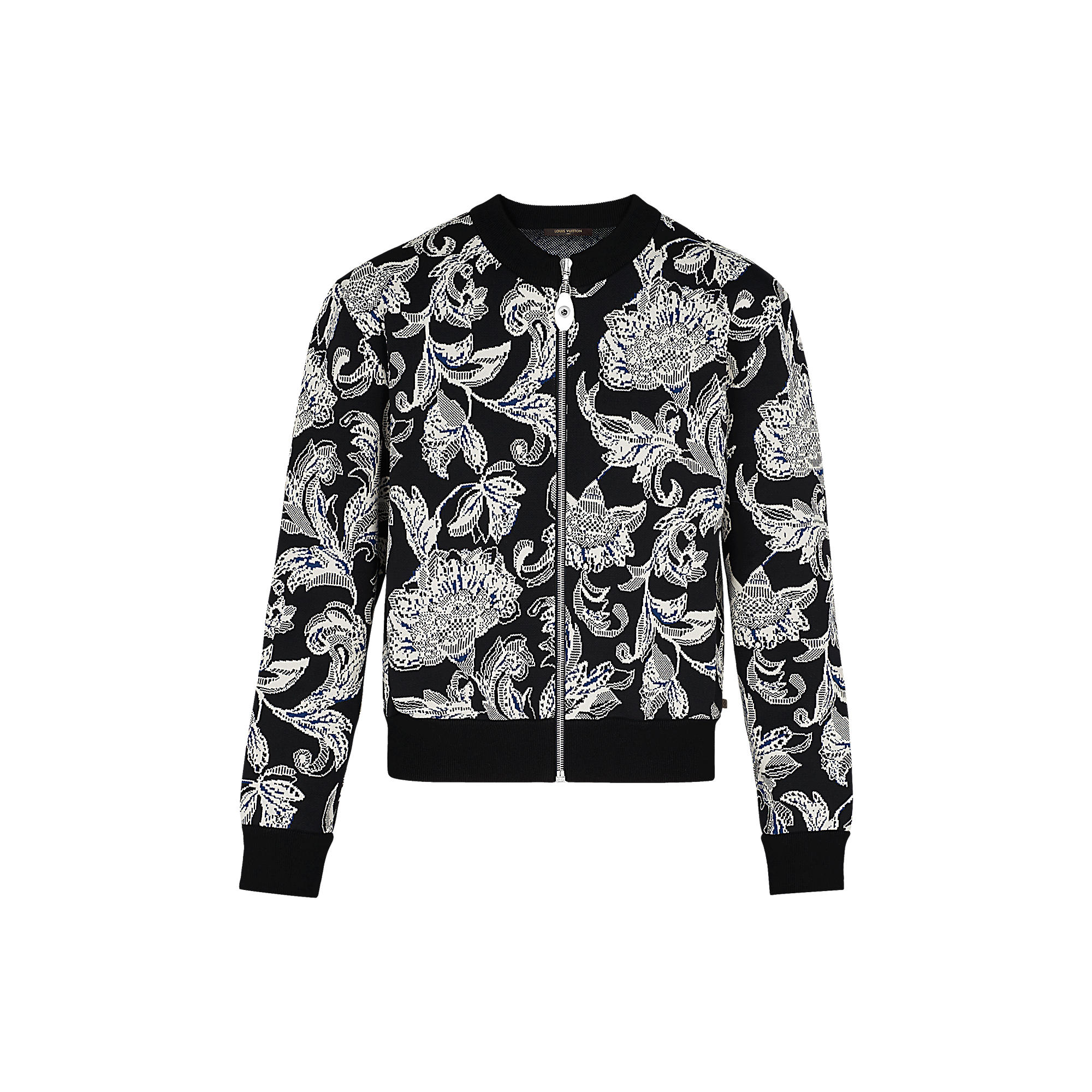 This bomber jacket in a jacquard knit is adorned with the season’s signature Indian flower pattern as an all-over macro print. The collar, hem and cuffs have contrasting black ribbing, while the zip features an LV puller in contrasting white leather.
