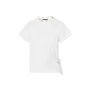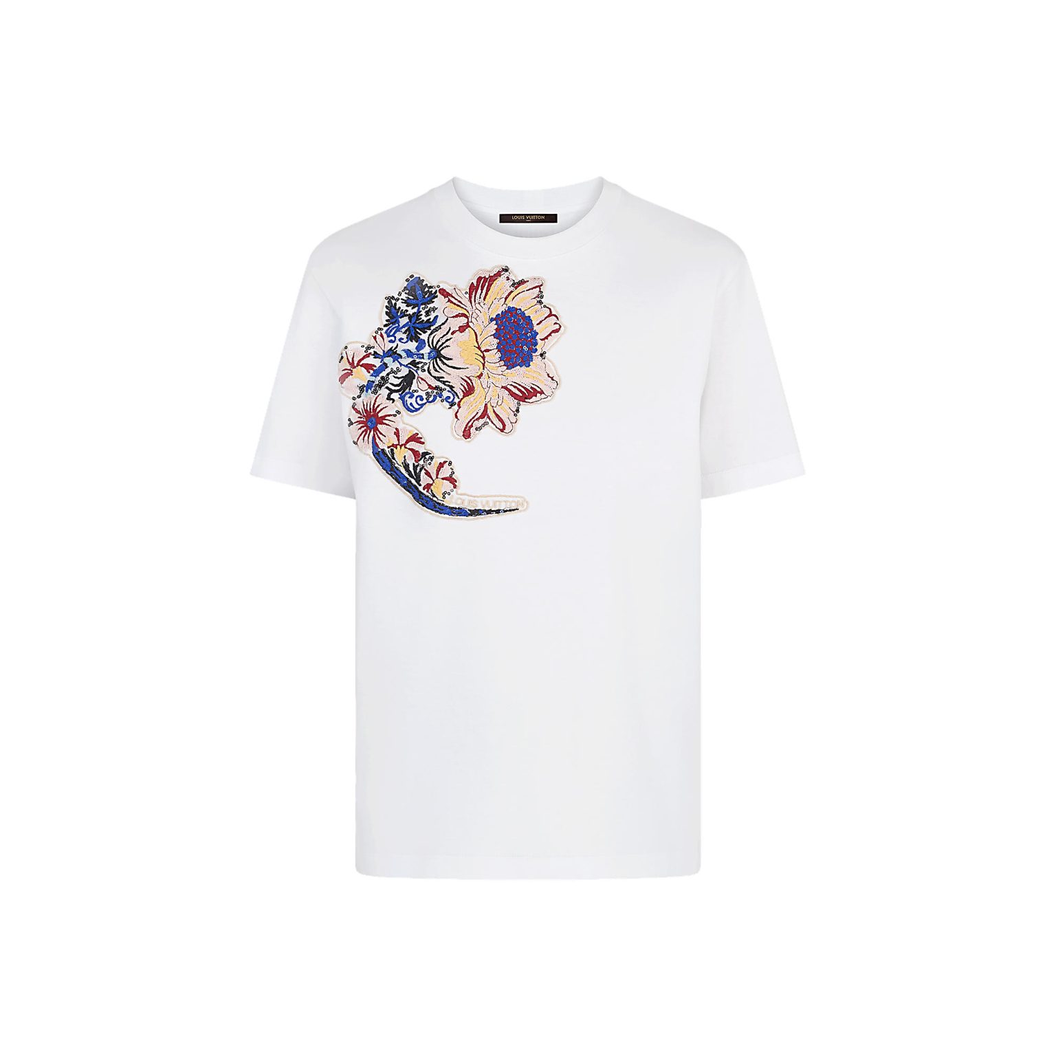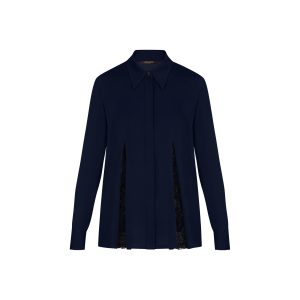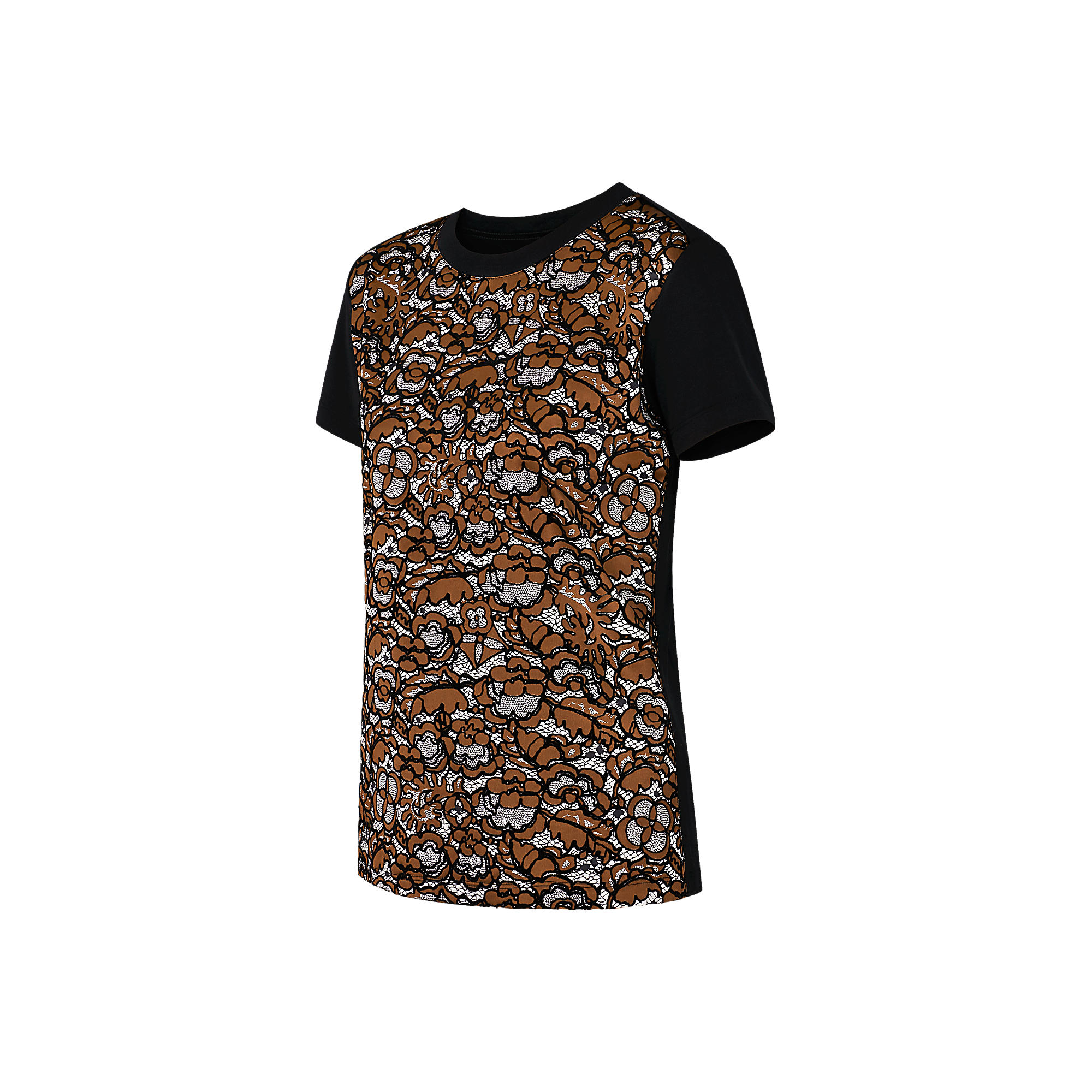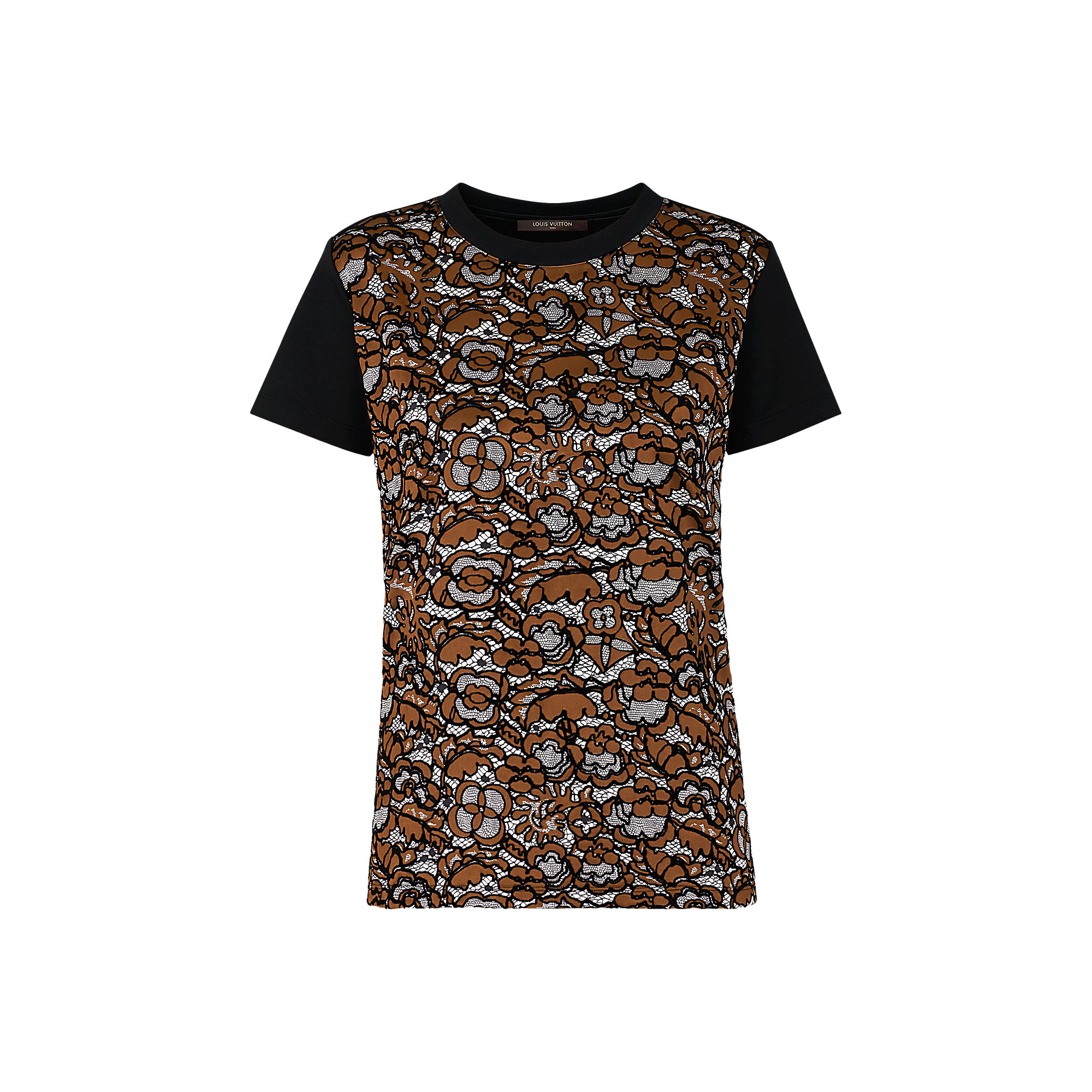 Accentuated by a back and sleeves in black jersey, this elegant top features a front crafted from silk satin with a flocked Flower Lace motif – a seasonal signature that creates a dramatic 3D effect.