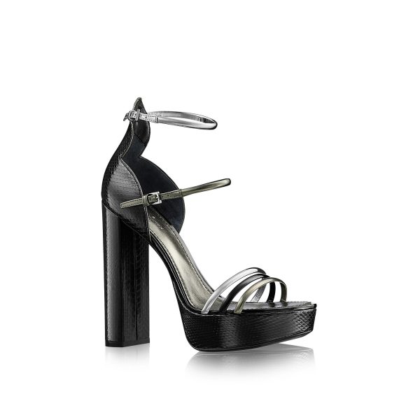 This ultra-high platform sandal in metallic ayers leather features a Monogram flower cut-out at the back.