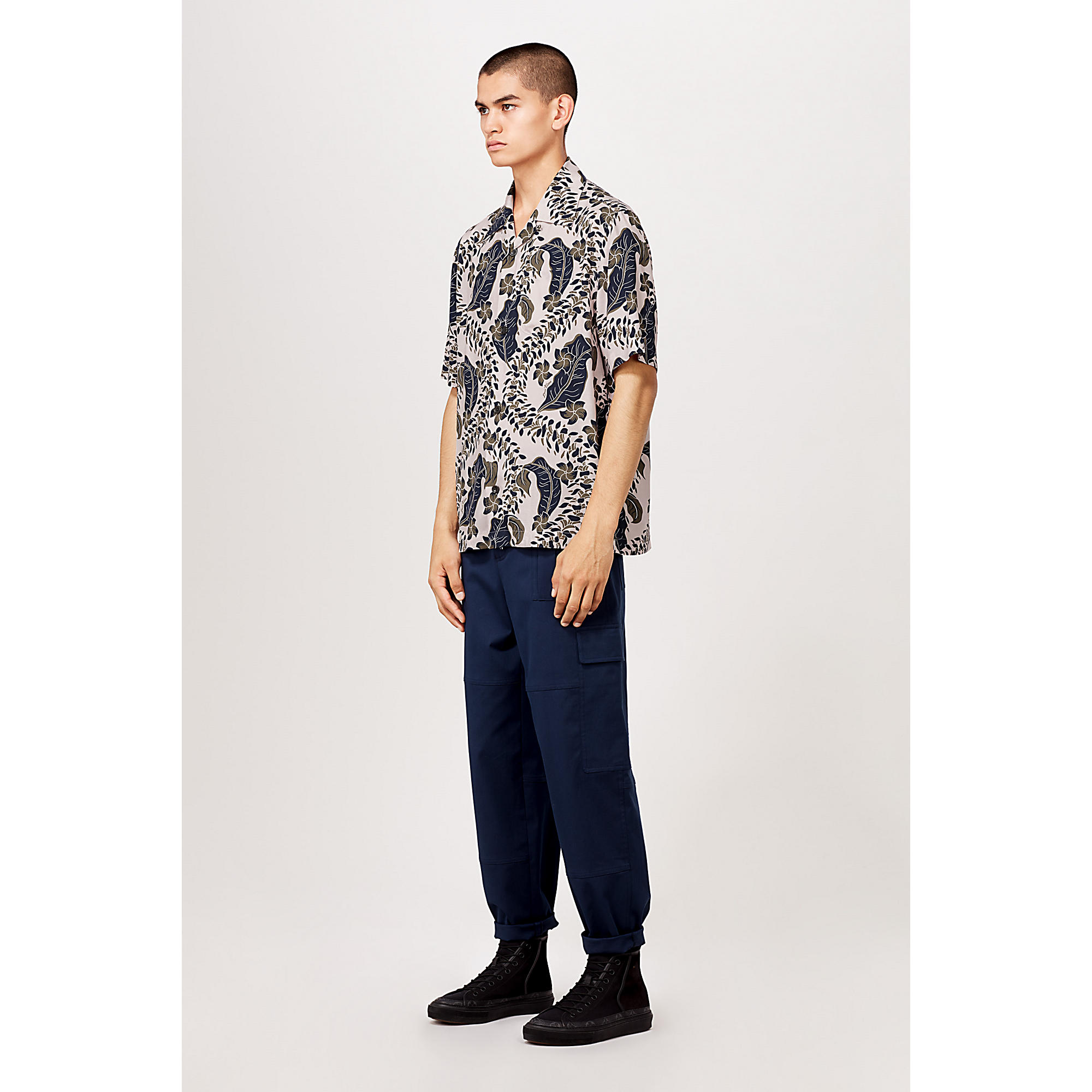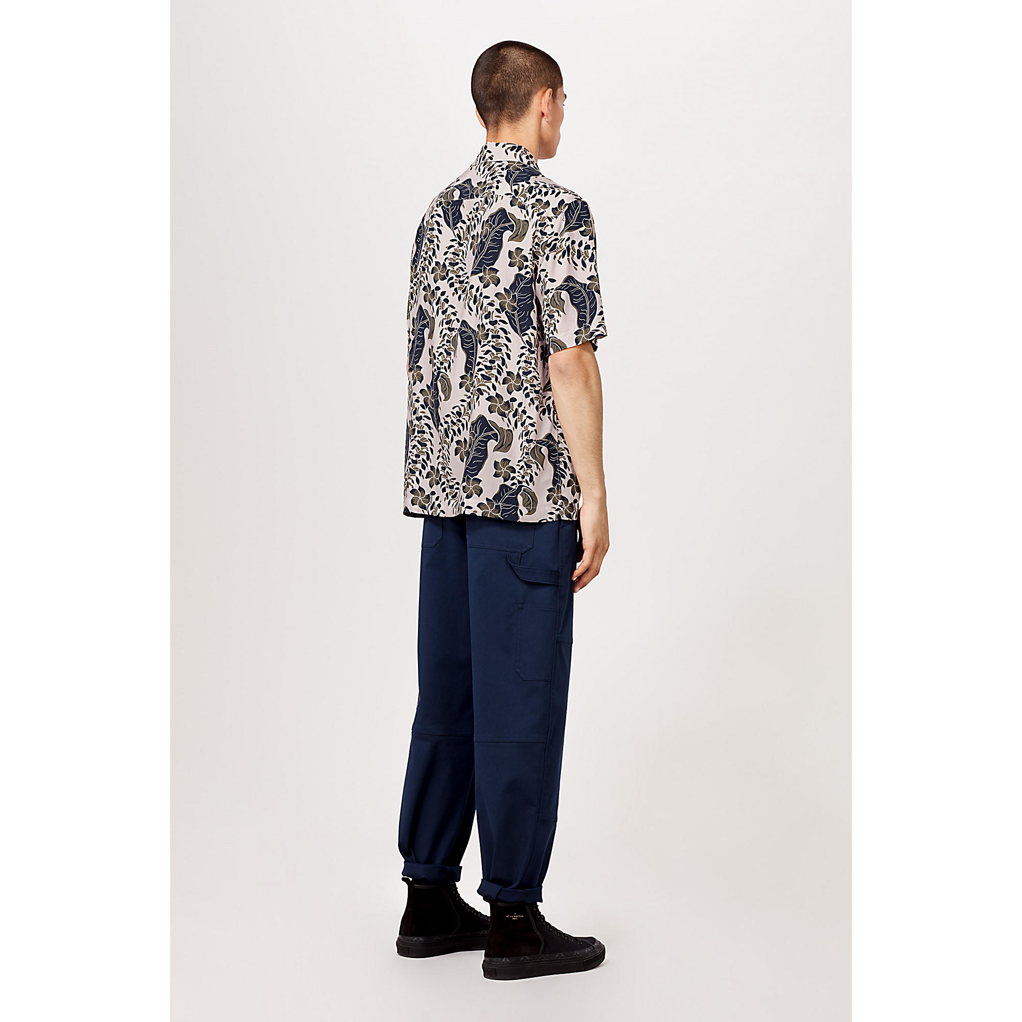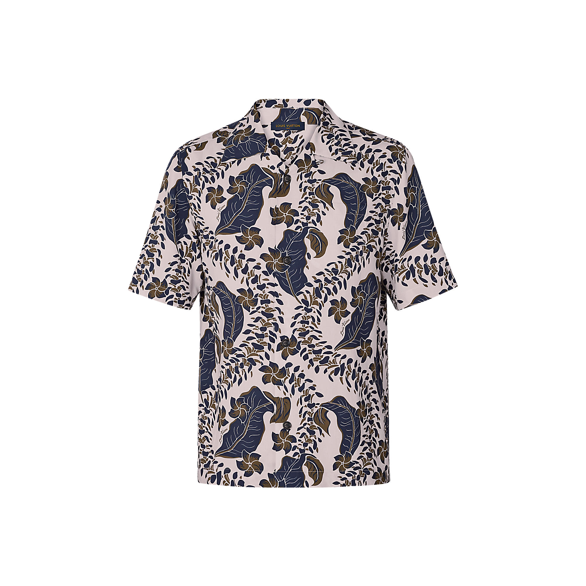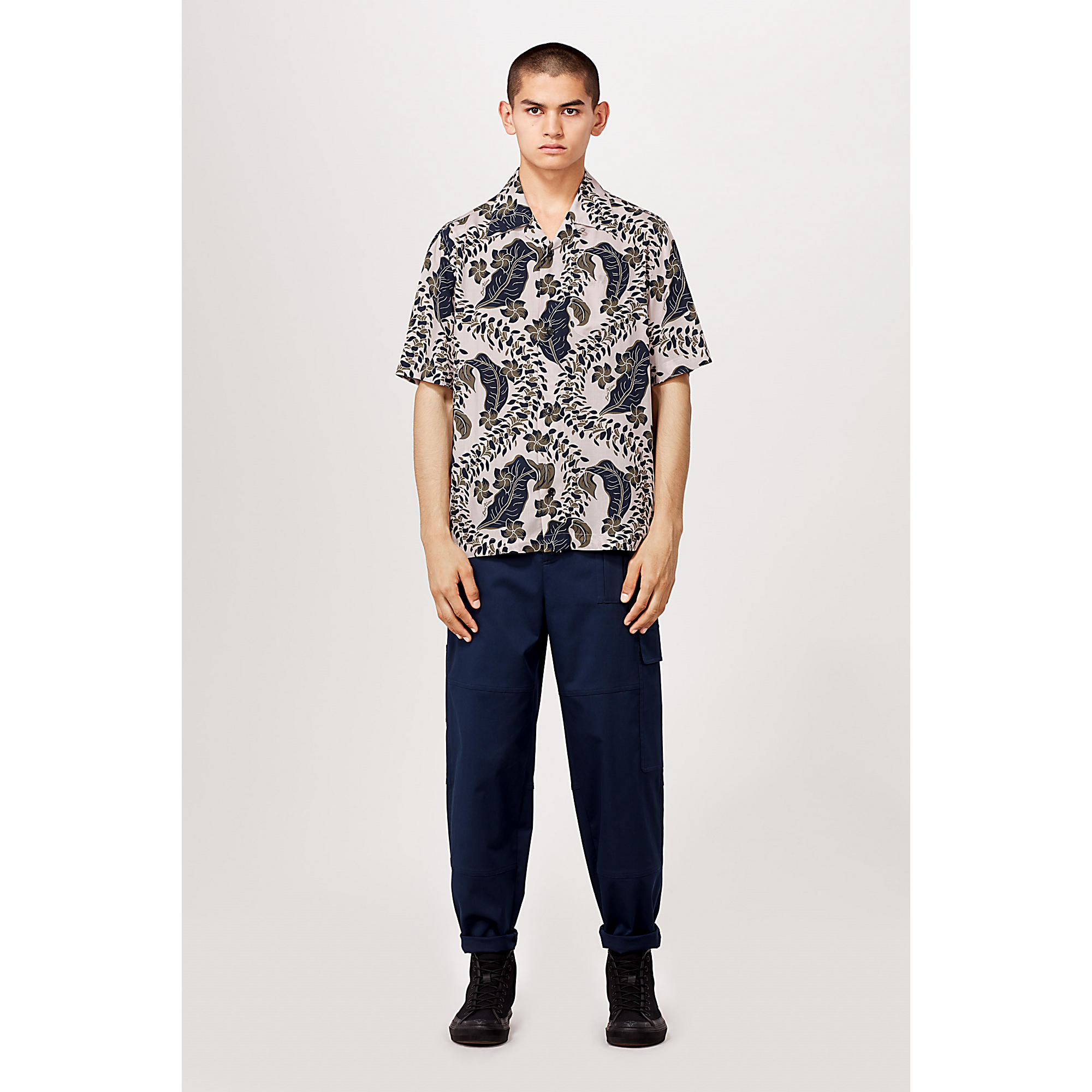 This loose-fitting summer piece is adorned with the season’s signature leaves motif as an all-over print. A button at the collar enables it to be worn done up for a more formal look.