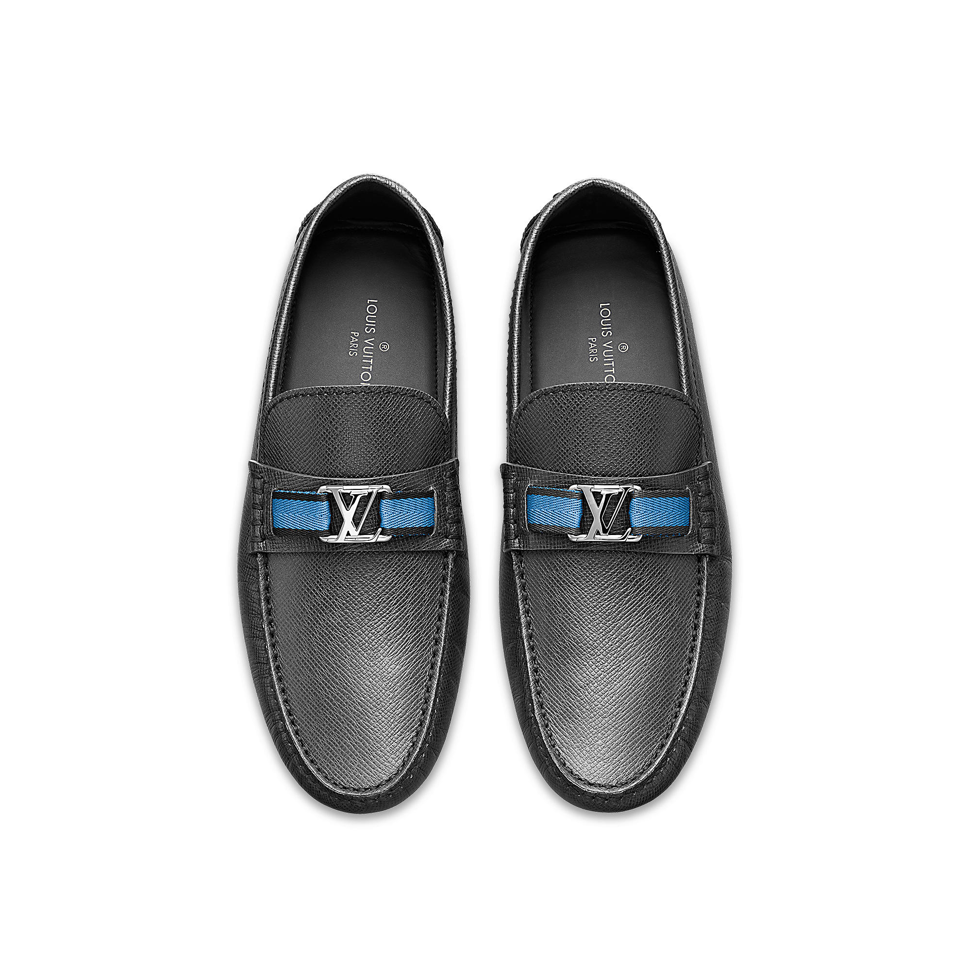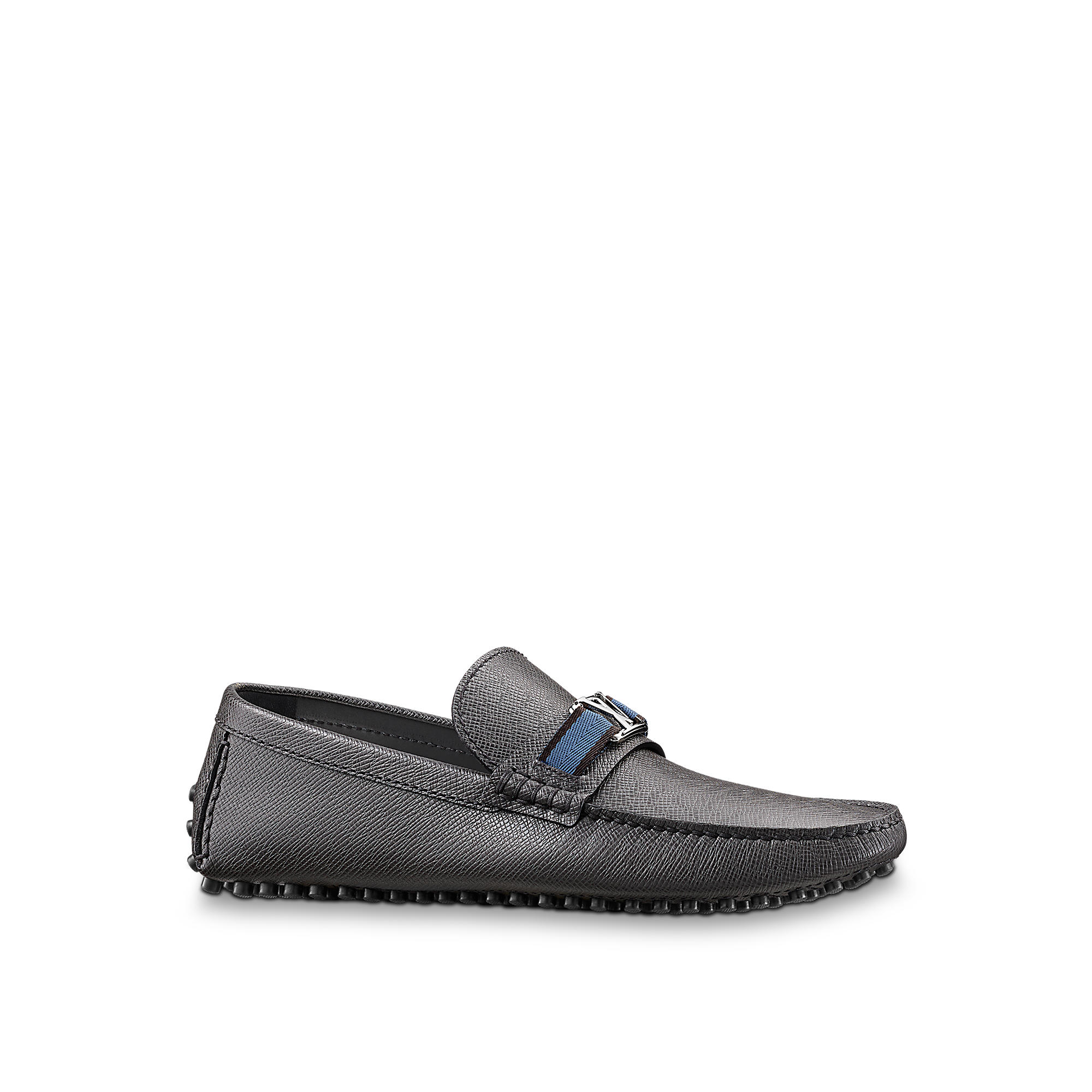 Moccasin in Taiga leather with a contrasted ribbon, small rubber nubs outsole and LV initials accessory.