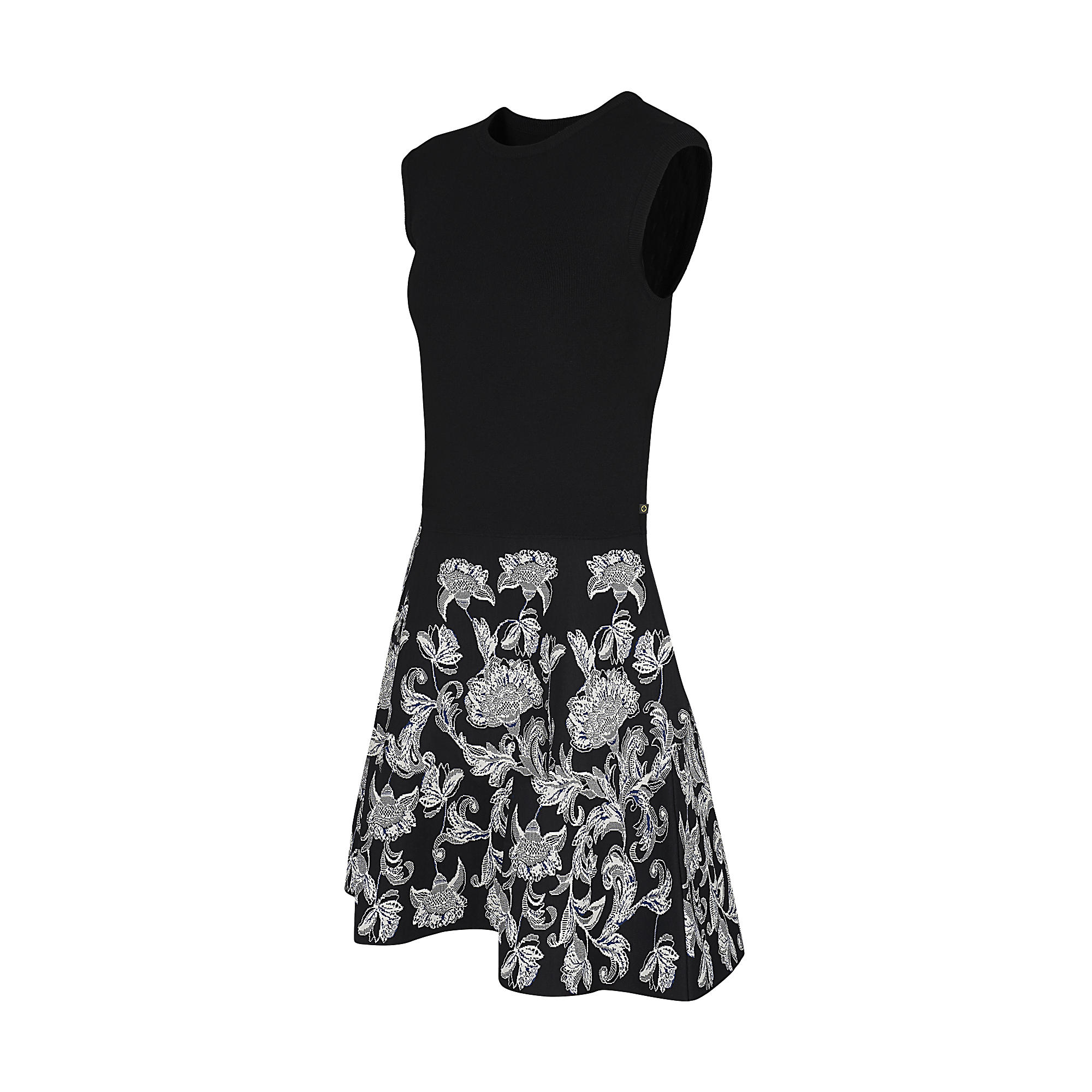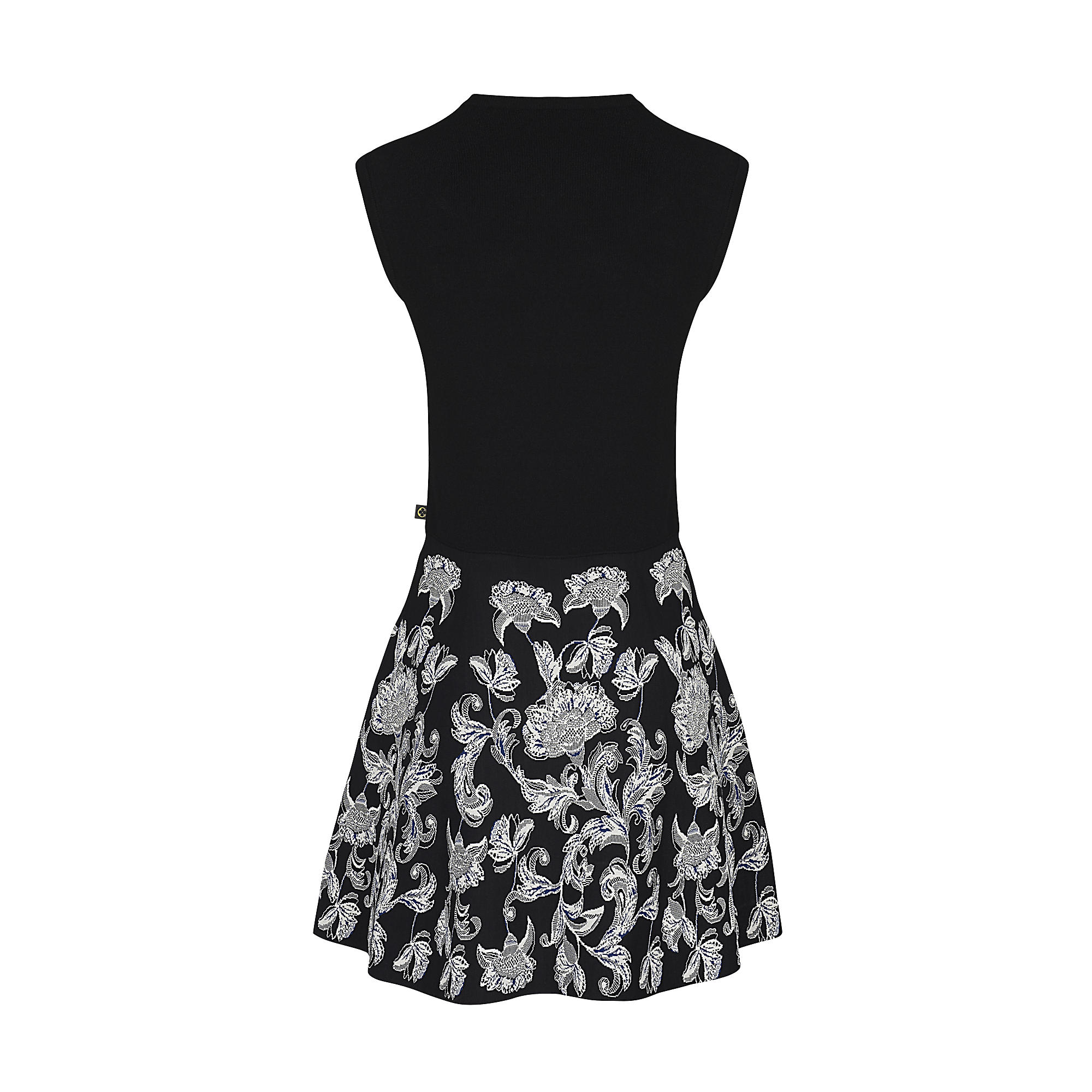 This sleeveless dress has a fitted top and a flared Aline skirt. The top part is in plain knit while the constrasting bottom is tailored from jacquard featuring this season’s Indian Flower motif.