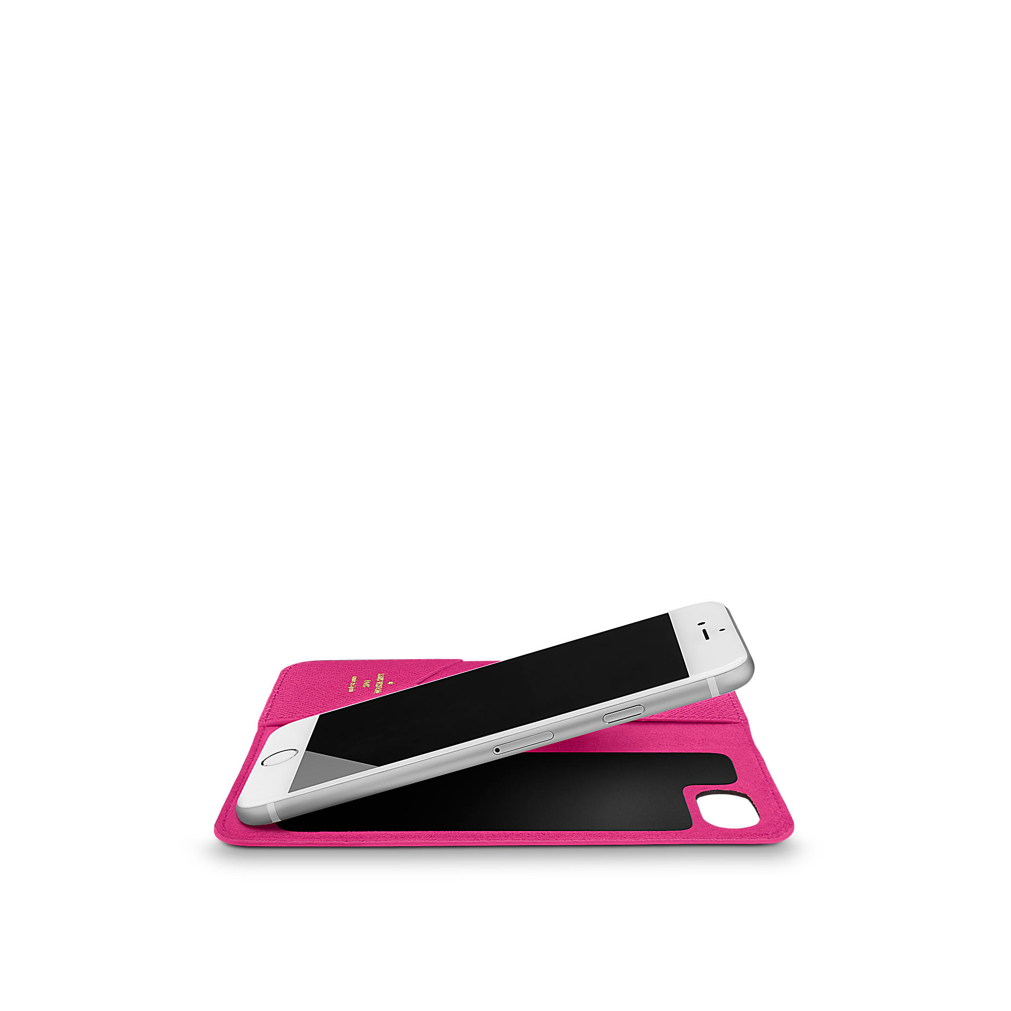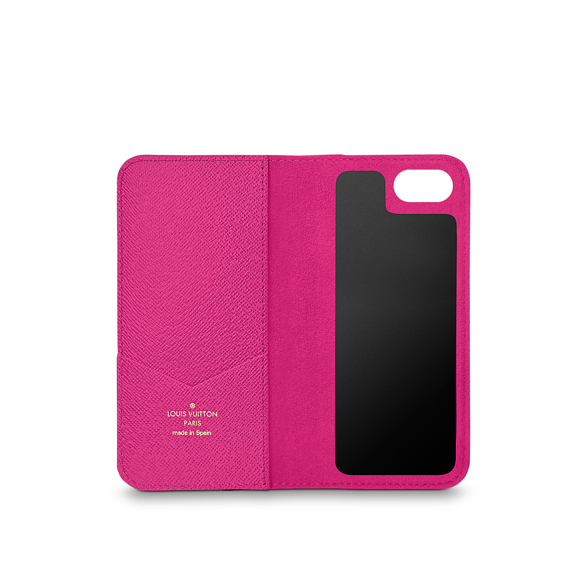 In iconic Monogram canvas with a brightly colored lining inspired by the covers of Louis Vuitton City Guides, the iPhone 7 & 8 Folio is as innovative as it is elegant. The functional adhesive surface, naturally integrated into its slim shape, holds the phone securely to protect it from the bumps and knocks of modern life.