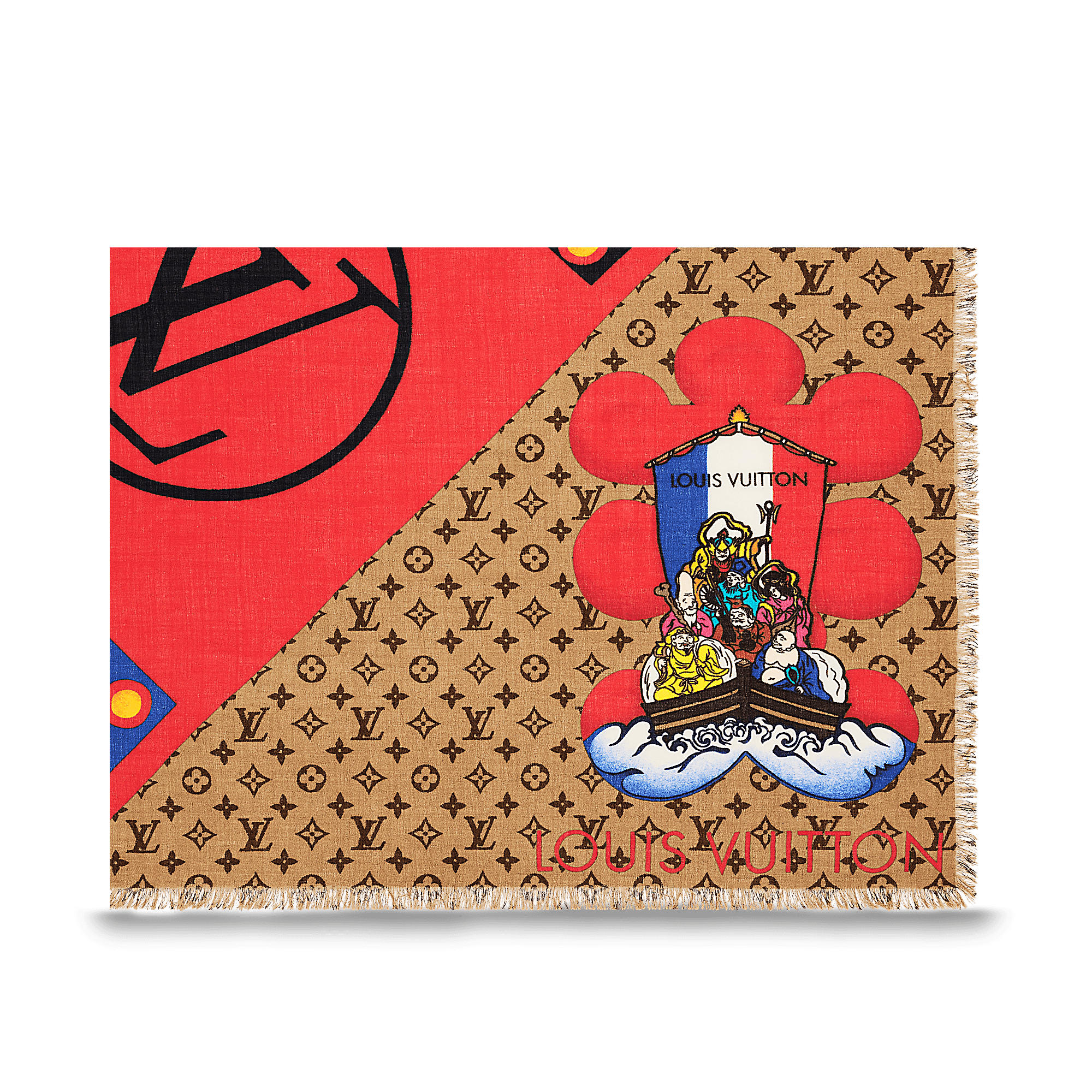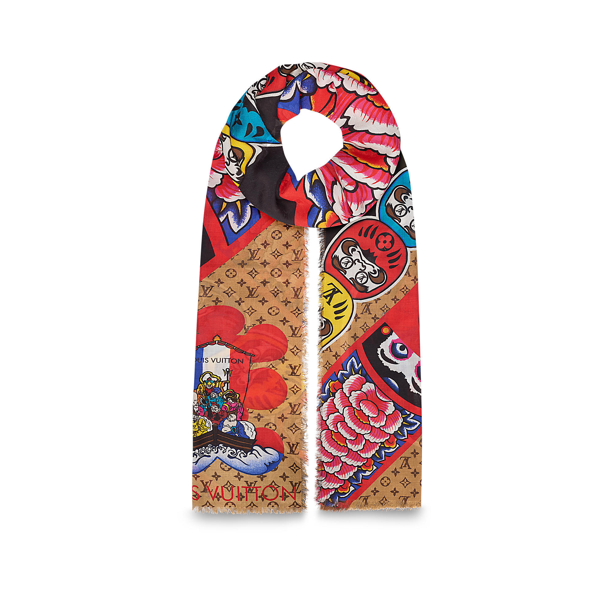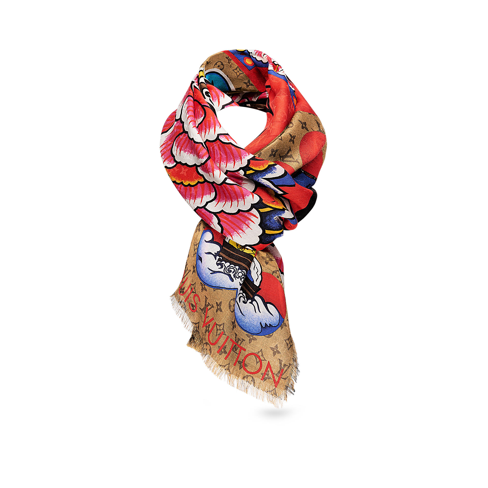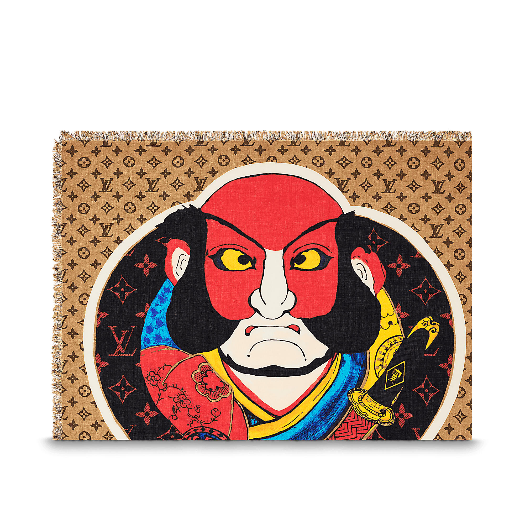 A fashion stole playing on the Kabuki stickers from the Cruise SS 18 runway. The colourful imagery decorates this original and exclusive stole, set against a background of Reverse Monogram print.