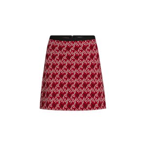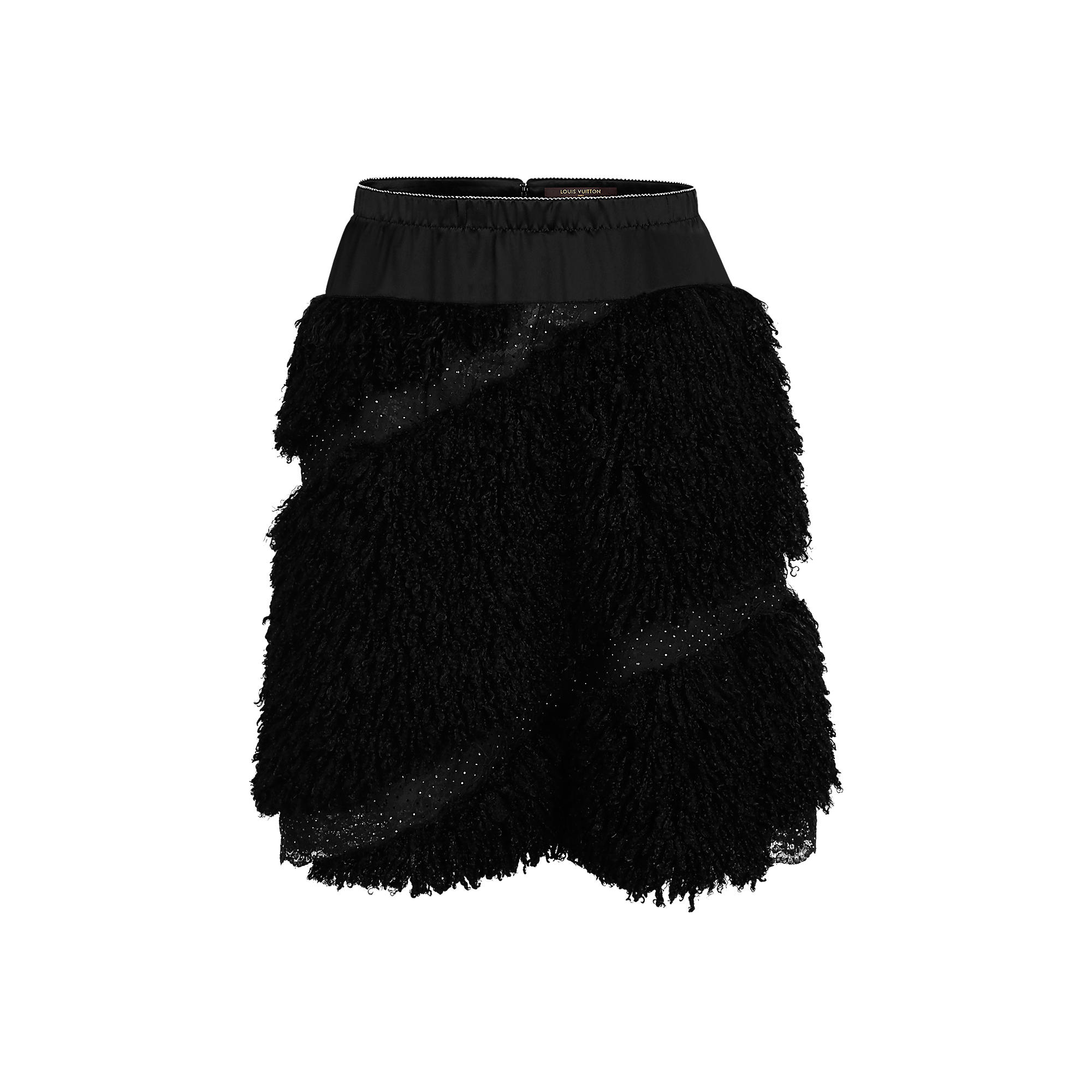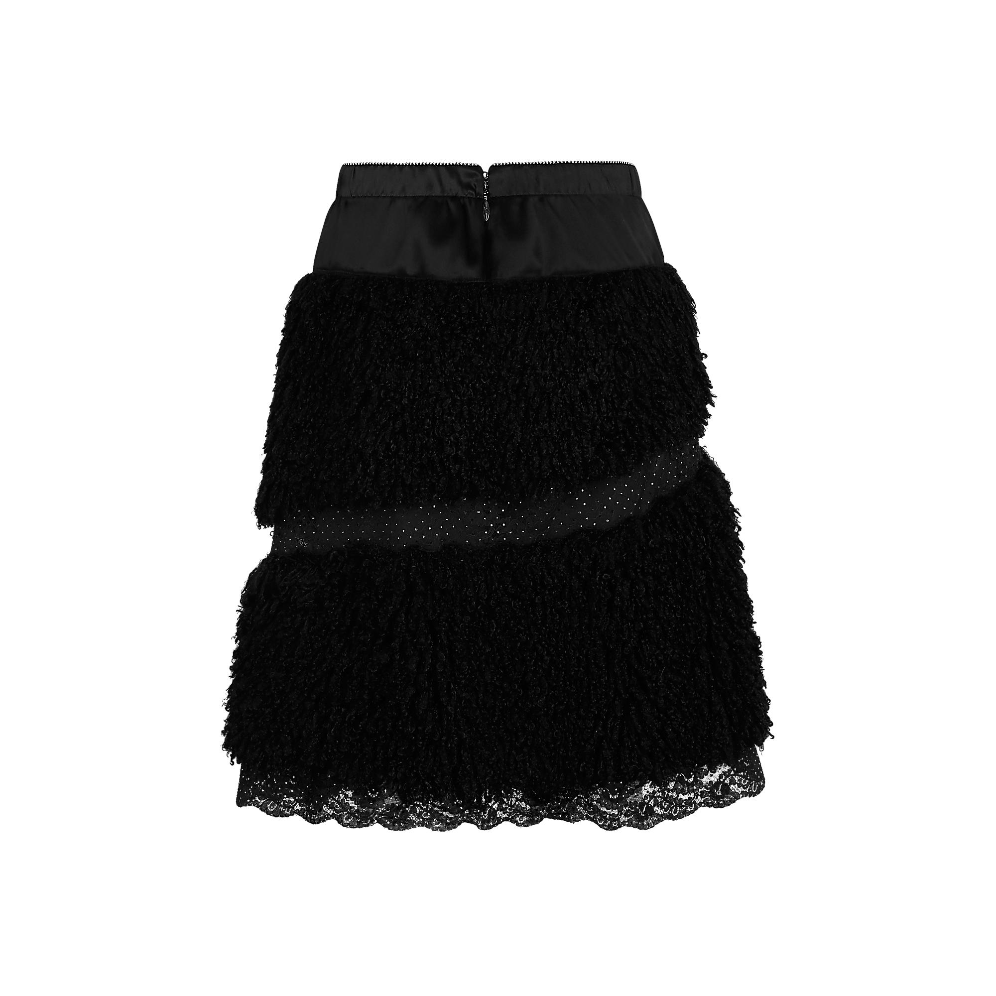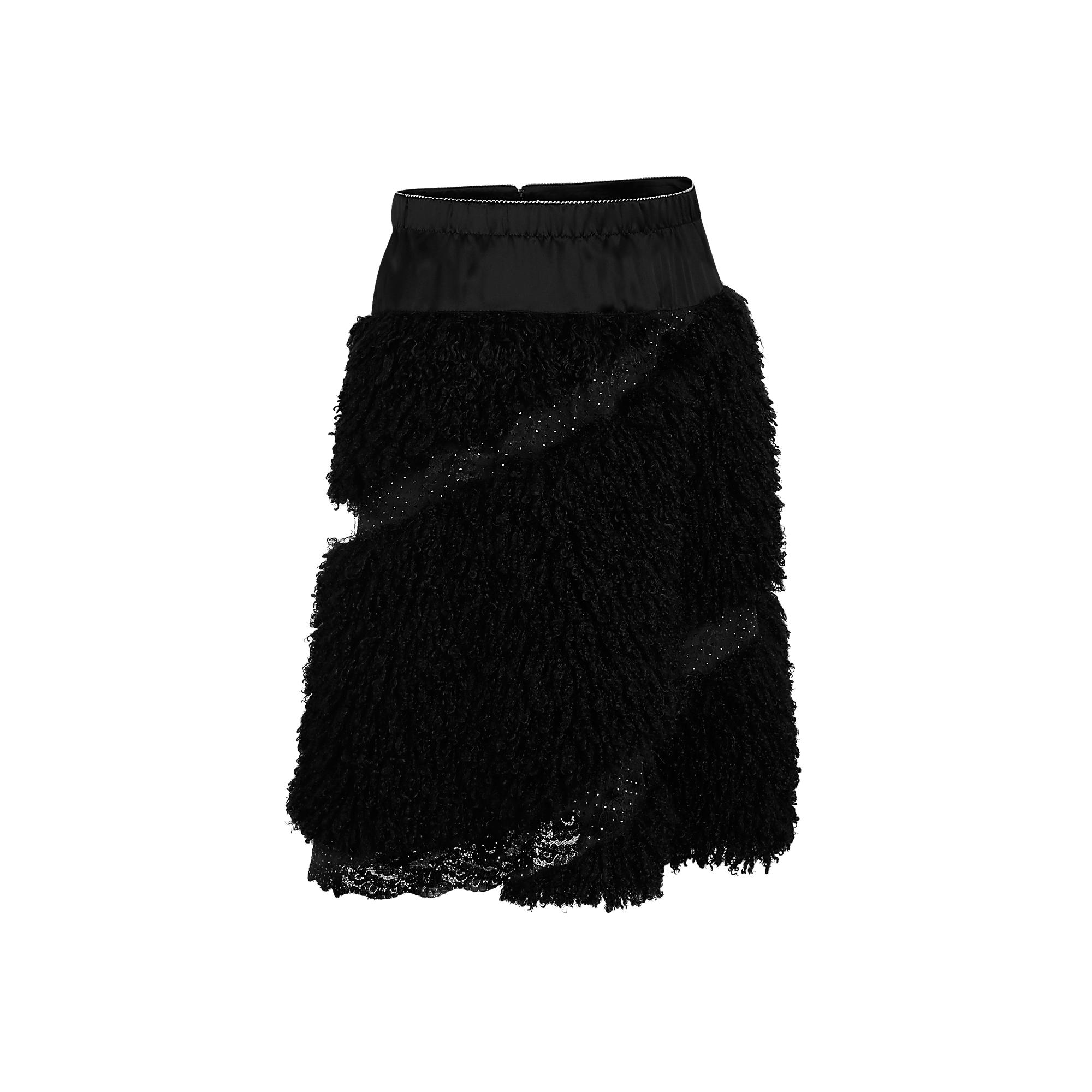 Inspired by the collection’s Slavic and folklore theme, this knee-length skirt in black bouclette features diagonal embroidered lace inserts and the season’s signature black basque around the waist.