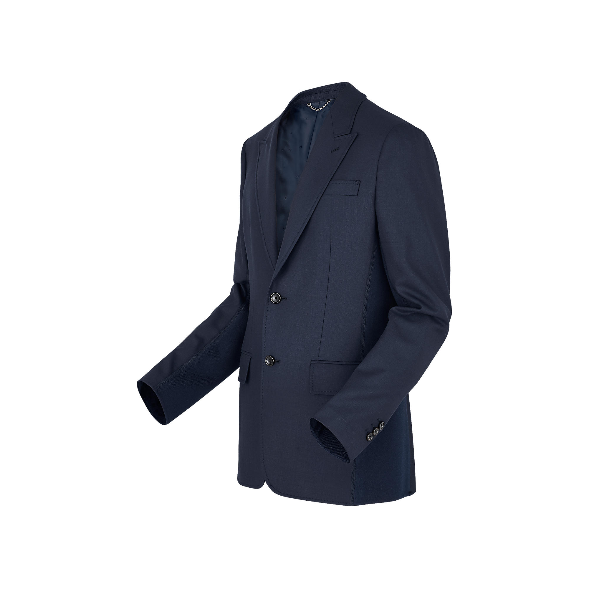 Embodying the collection’s tailored silhouette, this peak lapel jacket is cut from fluid wool with a hint of stretch for extra comfort. Knit panel inserts on the sides and sleeves create a new anatomical fit with more rounded shoulders.