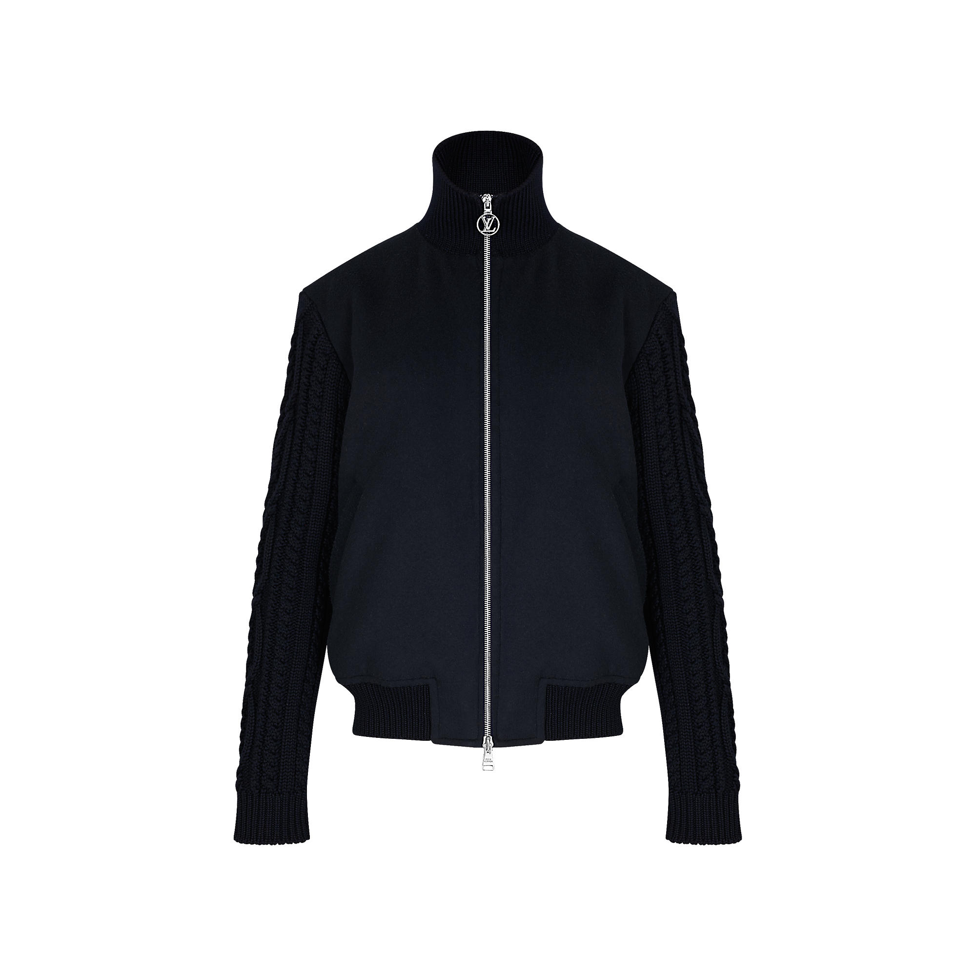 This hybrid stadium blouson encapsulates a street-smart elegance typical of the season. The body’s warm compact wool features a ribbed collar, while the tone on tone knitted sleeves are embellished with a cable design.