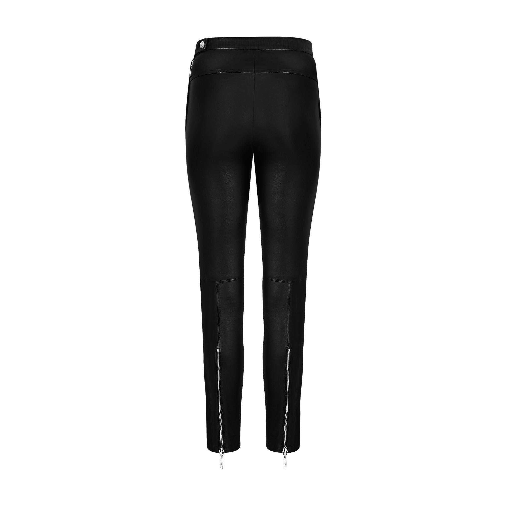 These leggings in stretch matte lambskin include such seasonal signatures as jersey inserts on the sides, visible seams at the knee and along the front, LV-engraved zippers and zip under-flaps at the calf. Worn open, the zippers create a modern look in line with the cropped and flared spirit of this season’s pants.