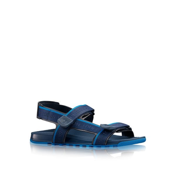 Sandal in calf leather and cotton canvas with adjustable straps and a rubber sole.