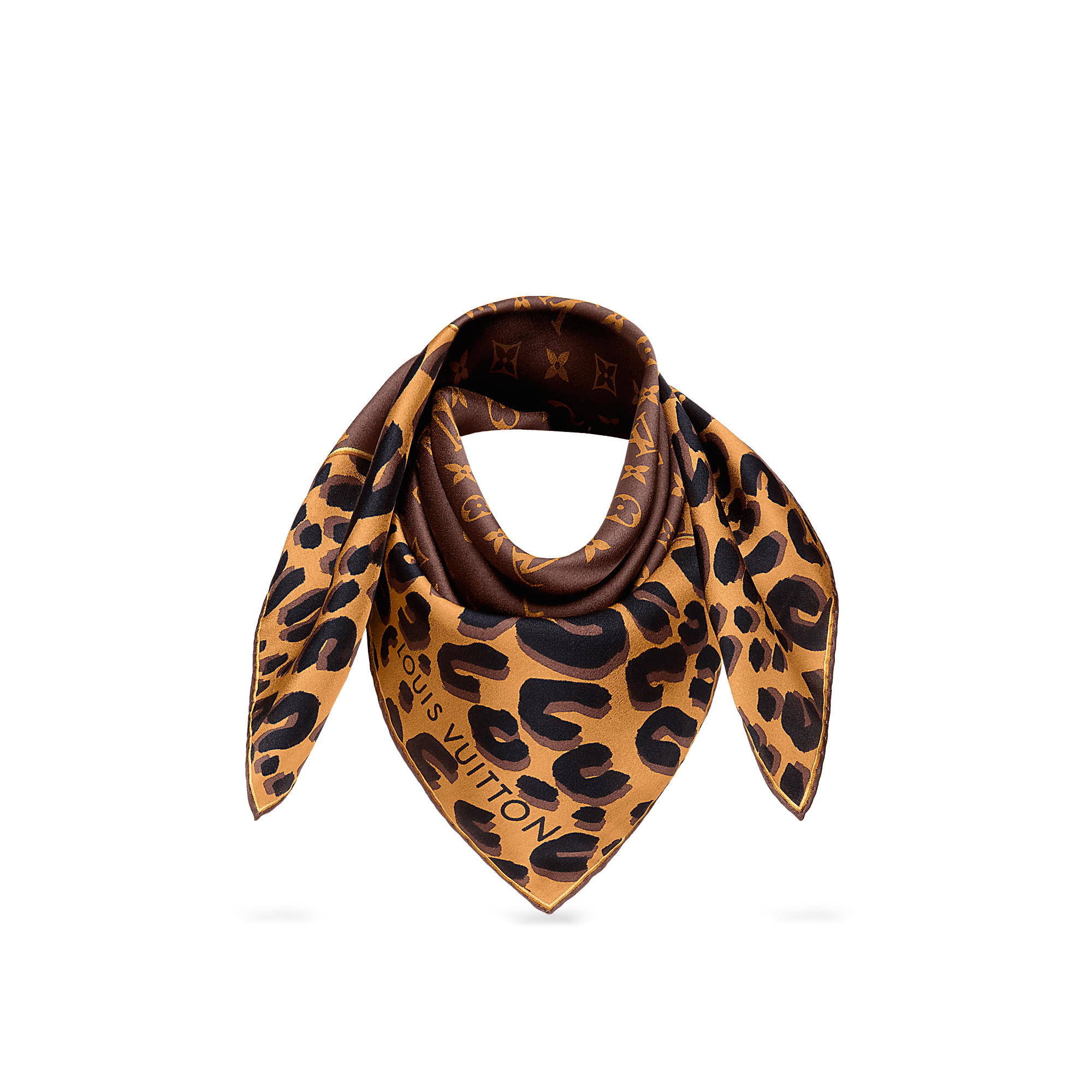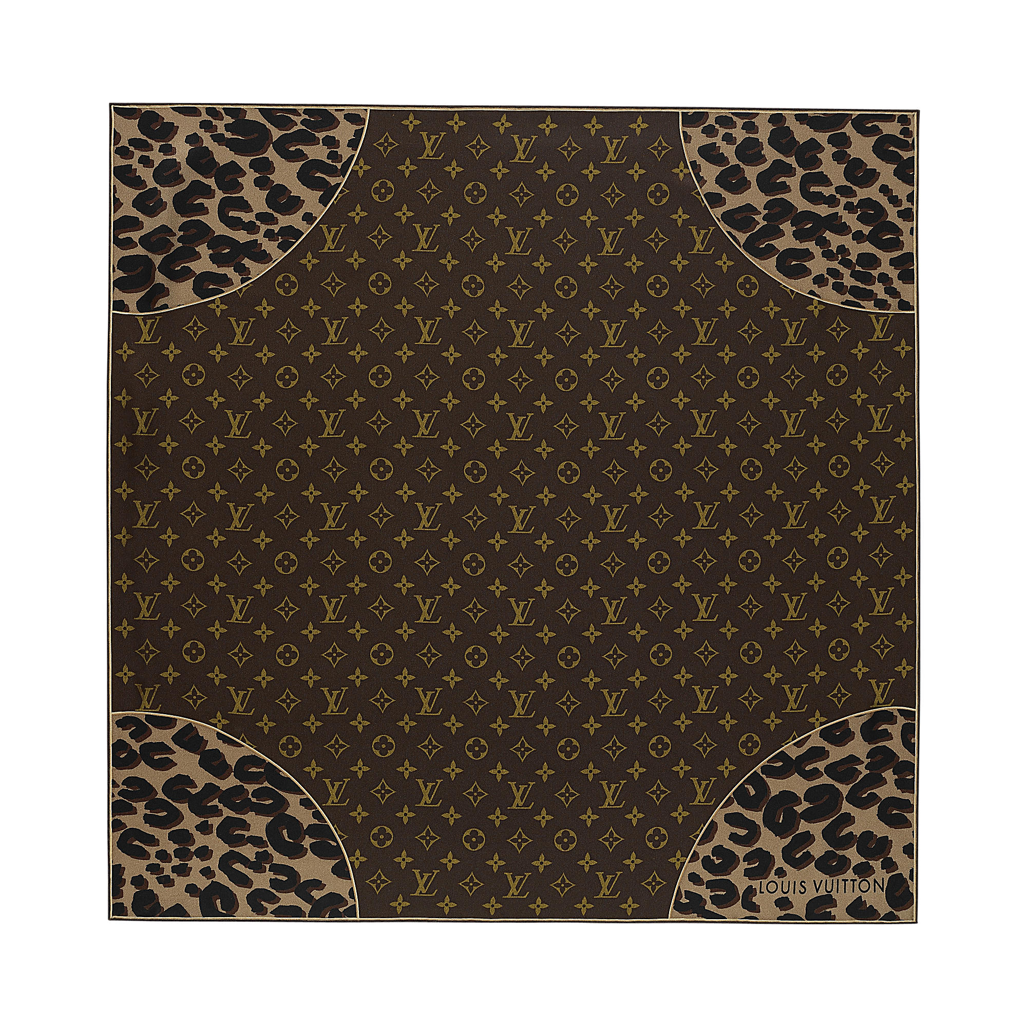 This eye-catching silk satin square features two iconic Louis Vuitton signatures: the Monogram pattern and the leopard print designed by American artist Stephen Sprouse.