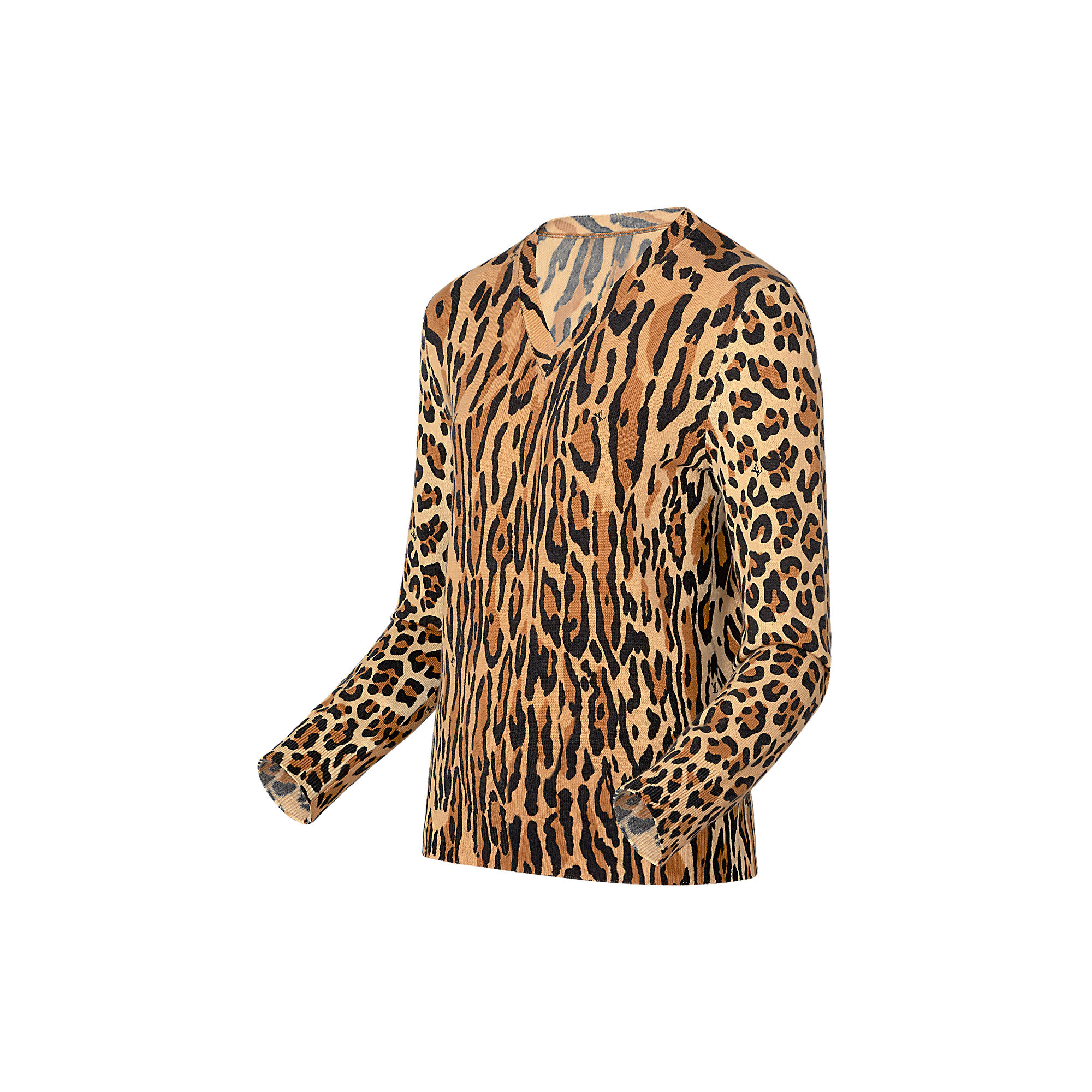 This fashionable pullover reinterprets the season’s statement Leopard prints on a light cashmere knit: the strong allover print twists the simple V-neck design for a trendy weekend look. Discretely signed with an LV logo, it is a perfect travel companion for colder days.